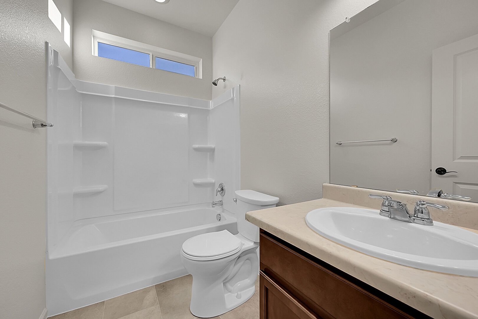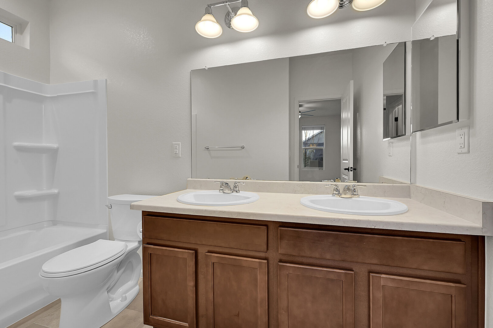 Ceiling Fan, Combined Bath Shower, Double Vanity, Natural Light, Textured Wall, Tile Floor, Vanity, Full Bathroom