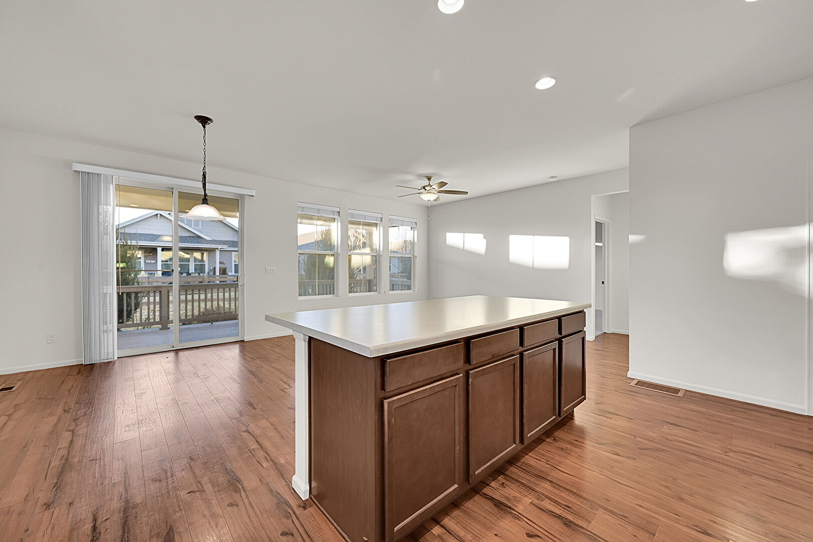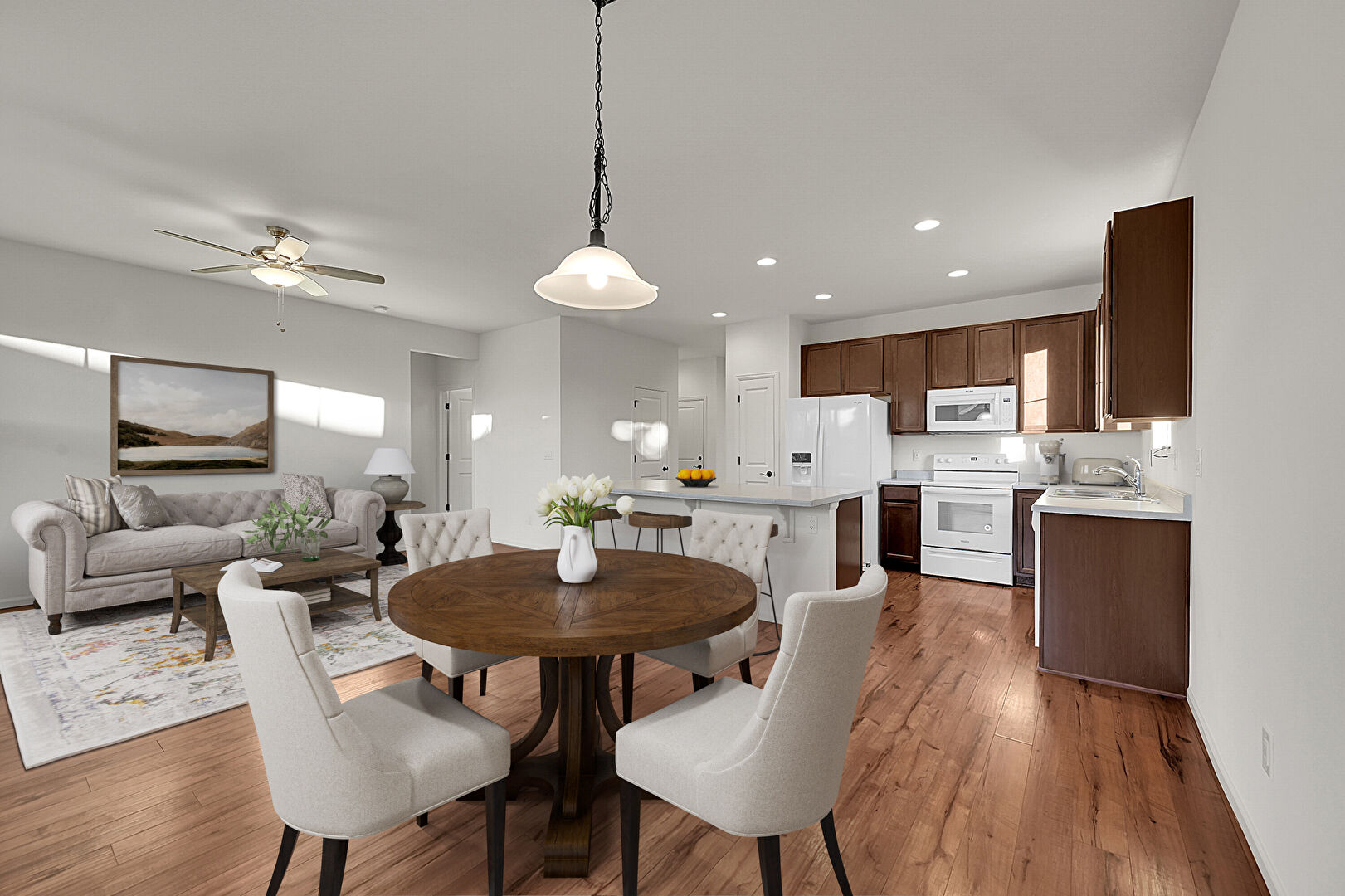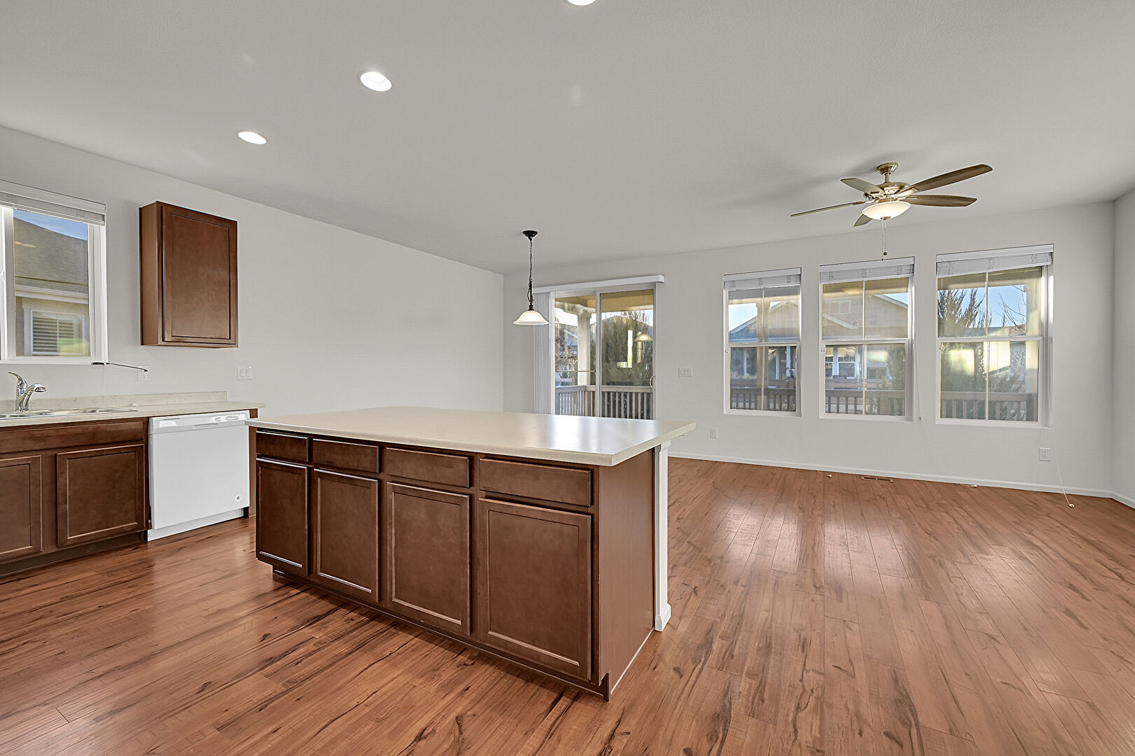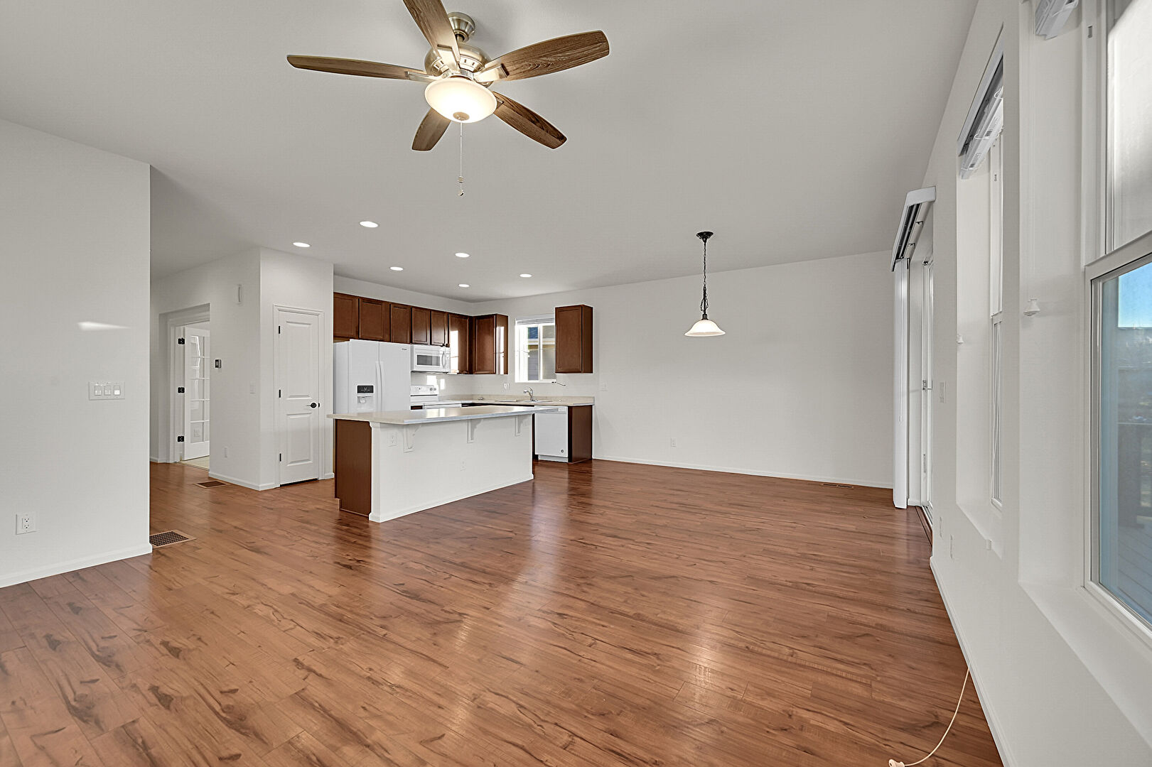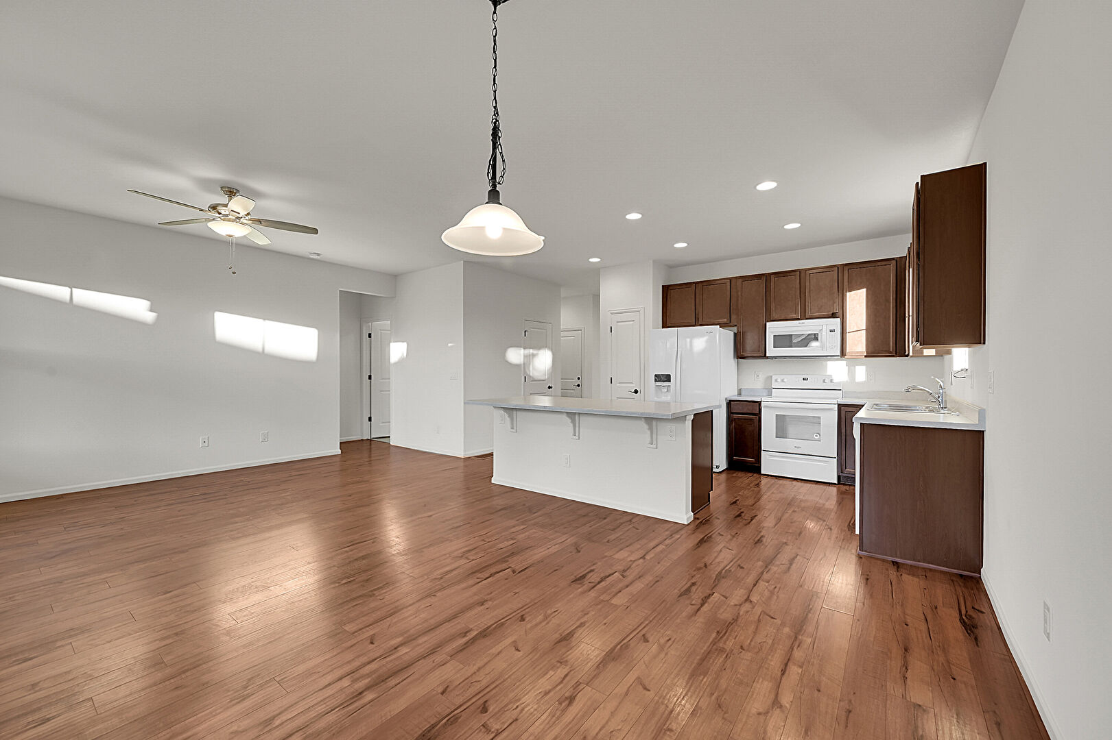 Baseboards Wall, Ceiling Fan, Dark Brown Cabinets, Drywall, Kitchen Bar, Kitchen Island, L Shaped Kitchen, Natural Light, Opens To Living Area, Pendant Lighting, Recessed Lighting, Shaker Cabinets, Stone Countertops, Vaulted Ceiling, Vent, Wood Finish Floor, Ceiling Fan, Dark Brown Cabinets, Natural Light, Pendant Lighting