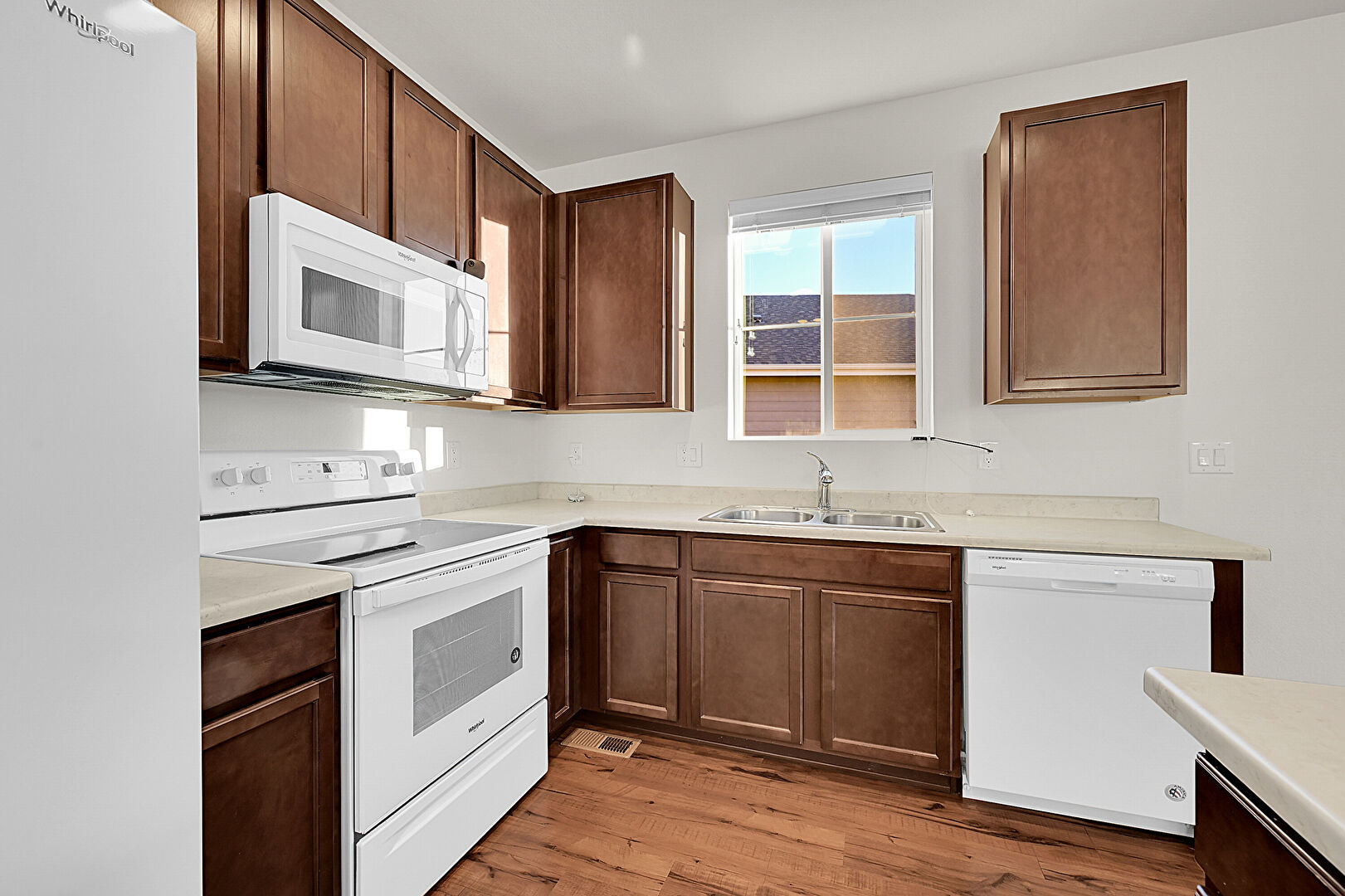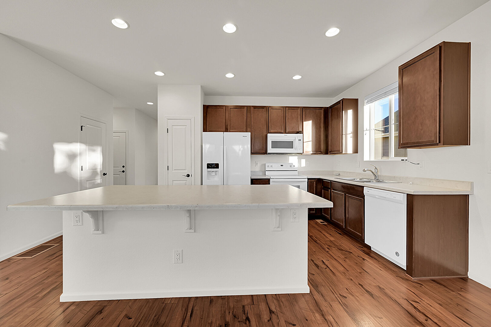 Baseboards Wall, Dark Brown Cabinets, Drywall, Kitchen Bar, Kitchen Island, L Shaped Kitchen, Medium Brown Cabinets, Natural Light, Recessed Lighting, Shaker Cabinets, Wood Finish Floor, Natural Light, Shaker Cabinets, Vent