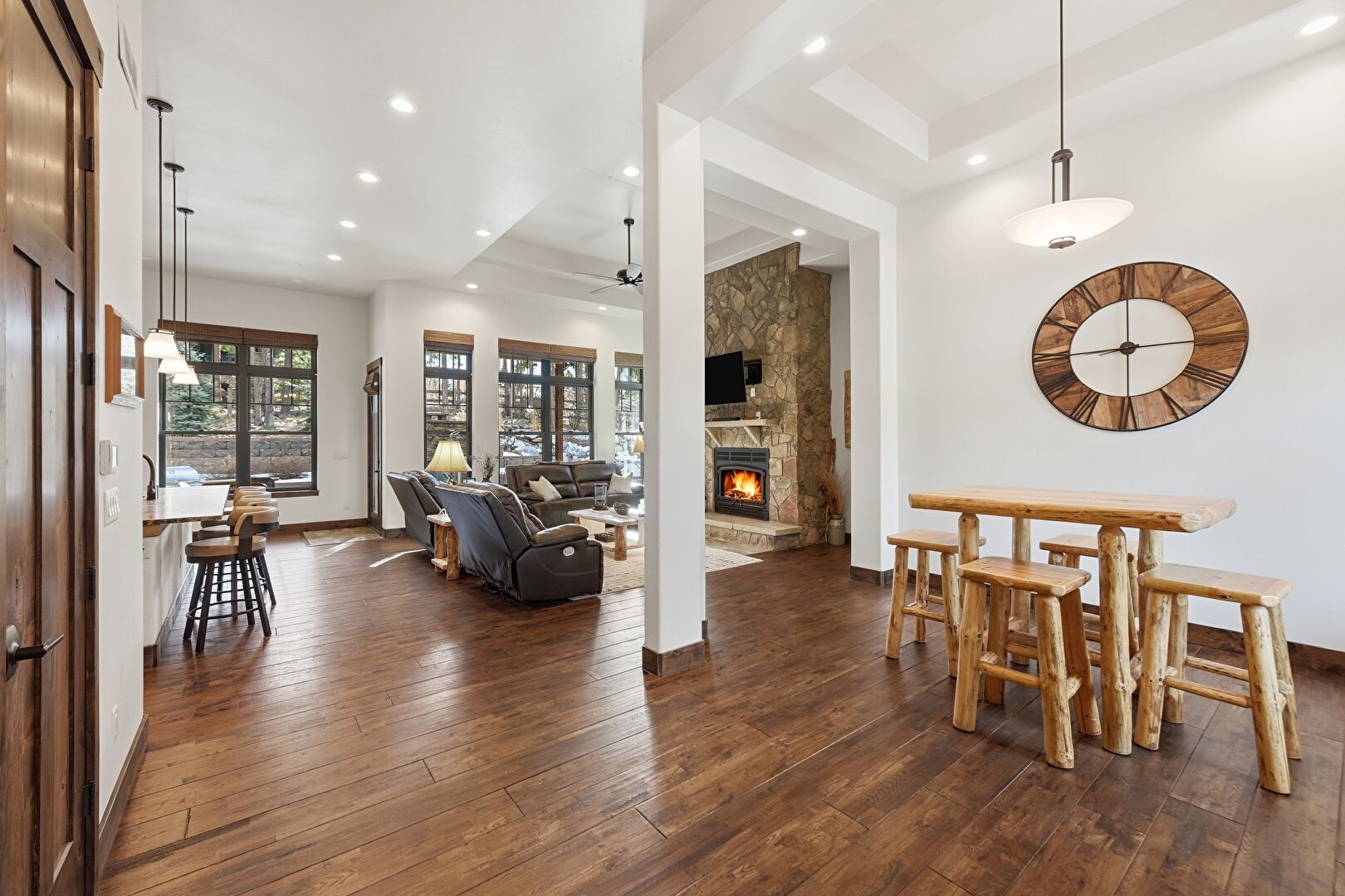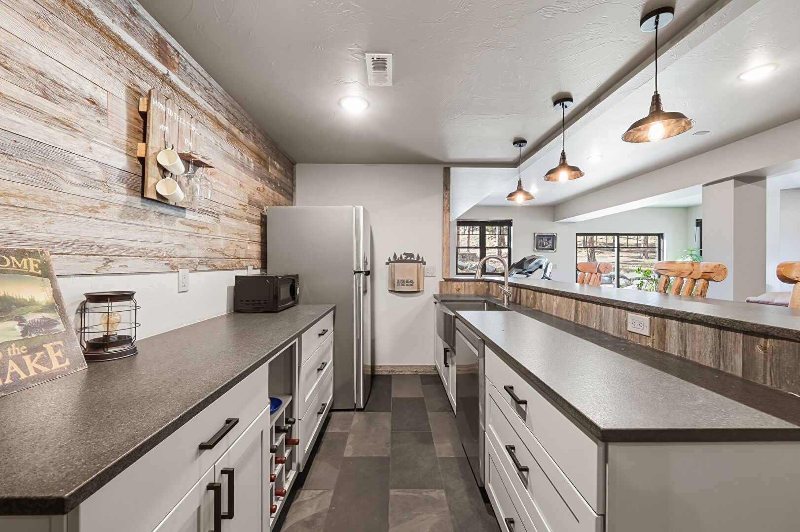 Accent Wall, Drywall, Indoor Bar, Pendant Lighting, Shaker Cabinets, Vent, Wood Wall, Baseboards Wall