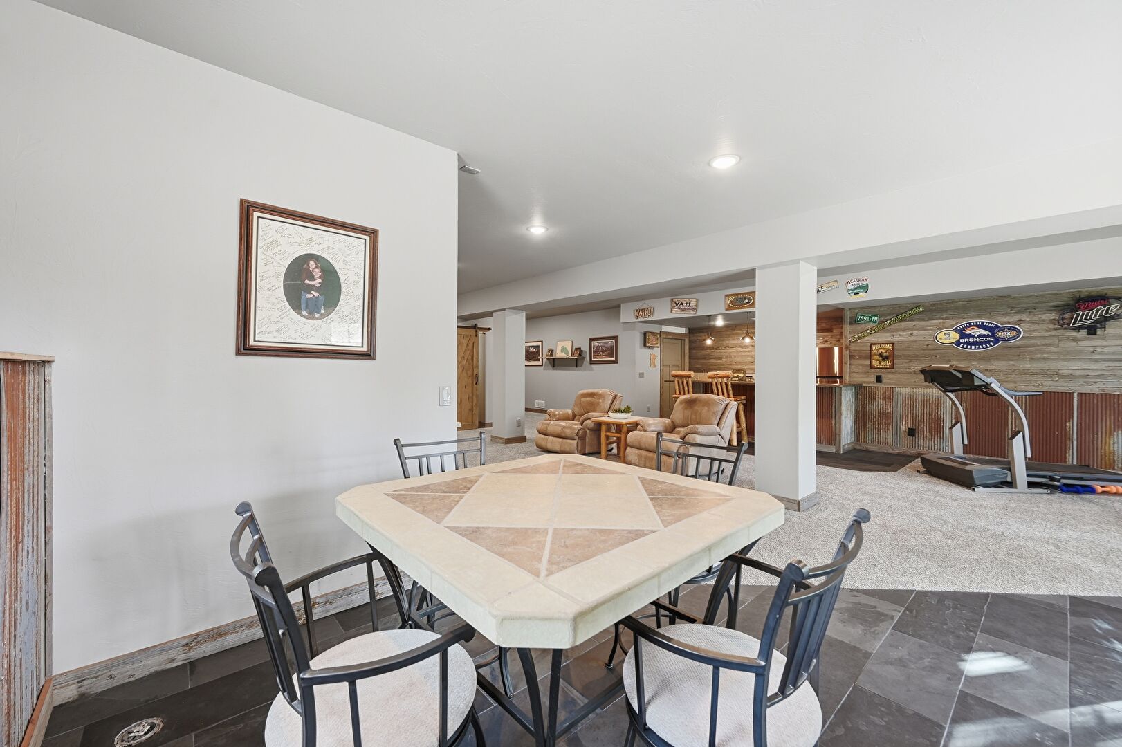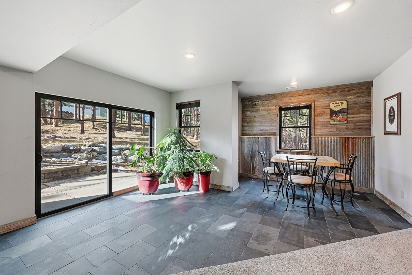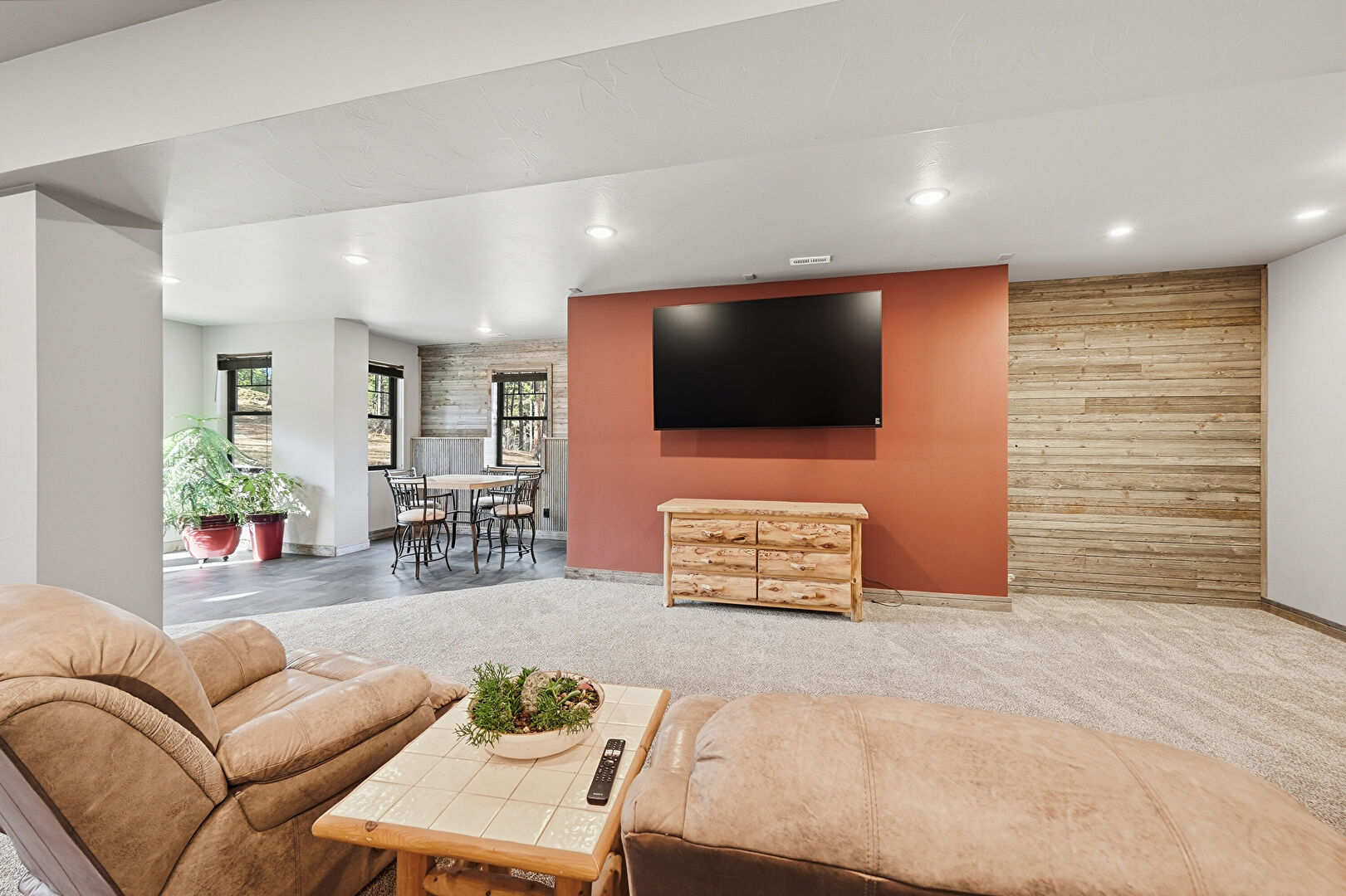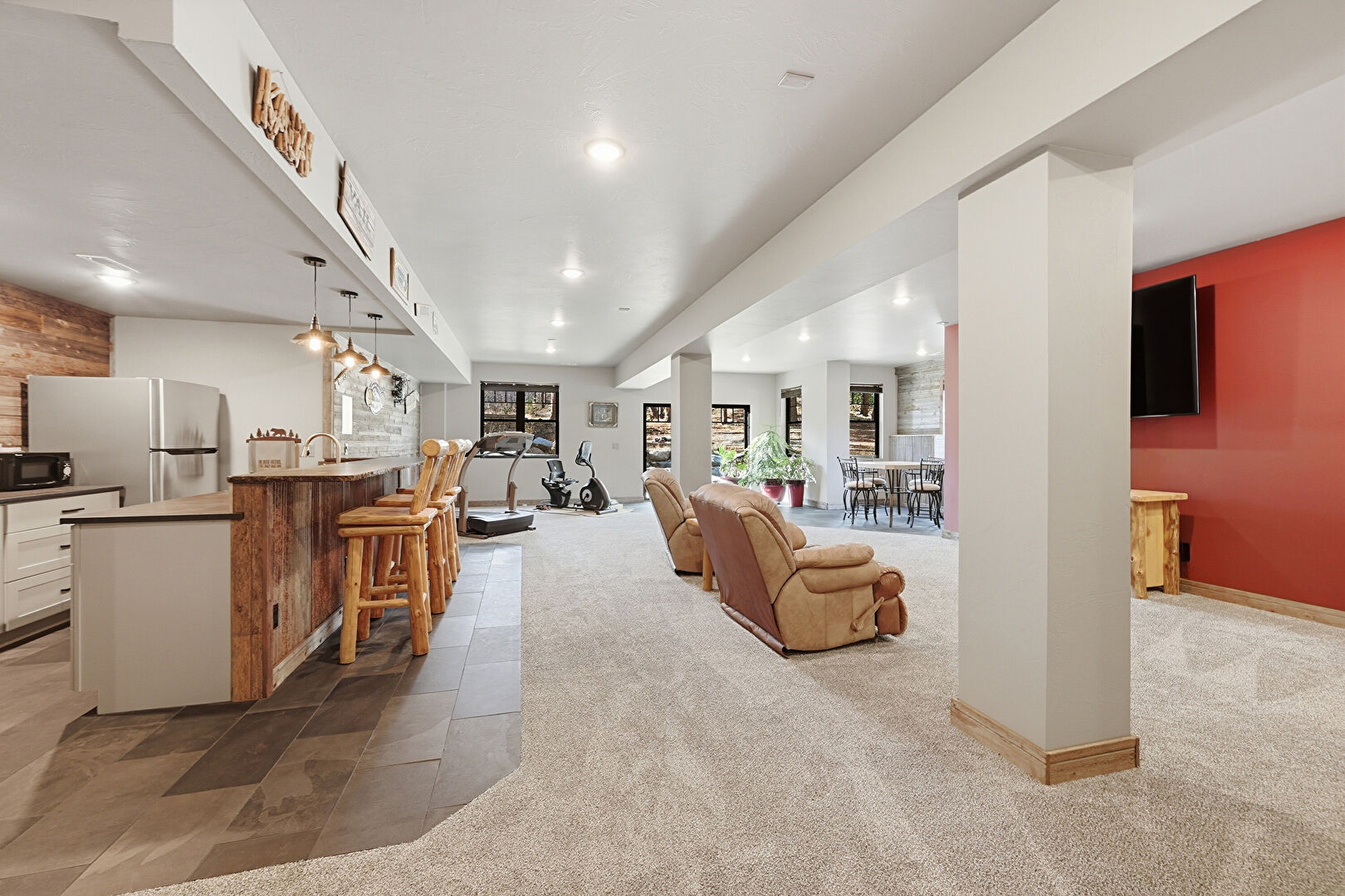 Accent Wall, Barn Door, Baseboards Wall, Basement, Carpet, Drywall, Indoor Bar, Natural Light, Recessed Lighting, Stone Finish Floor, Vent, Wood Wall, Basement, Carpet, Drywall, Recessed Lighting