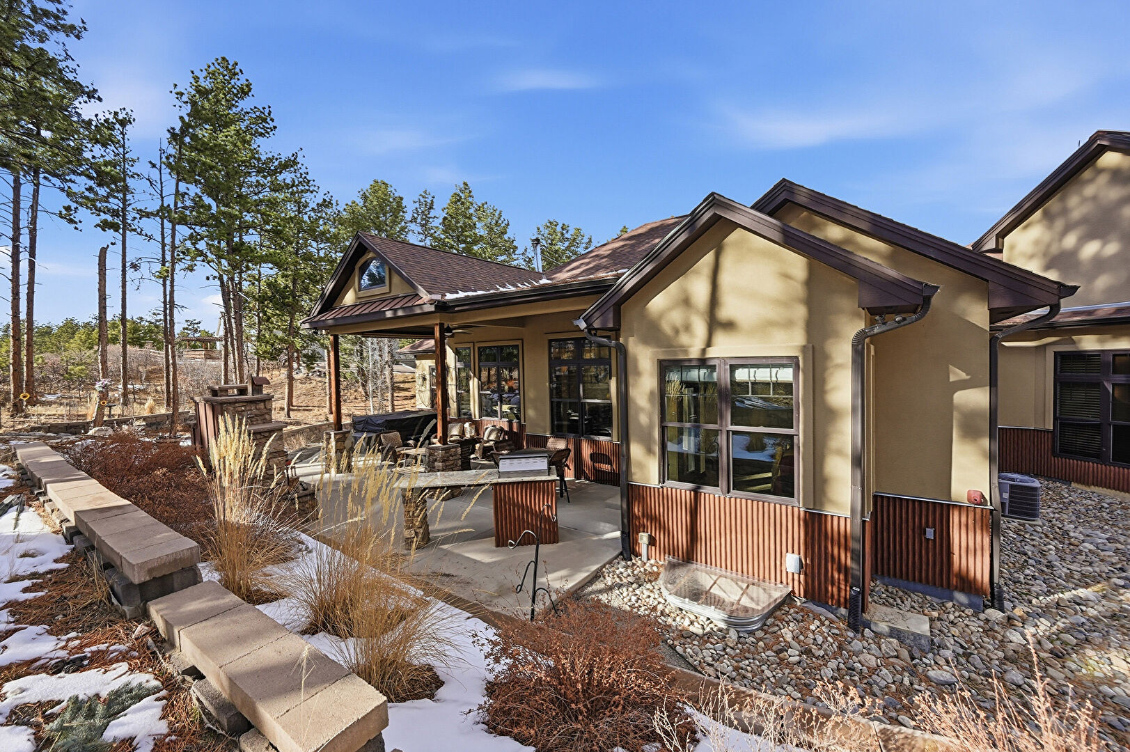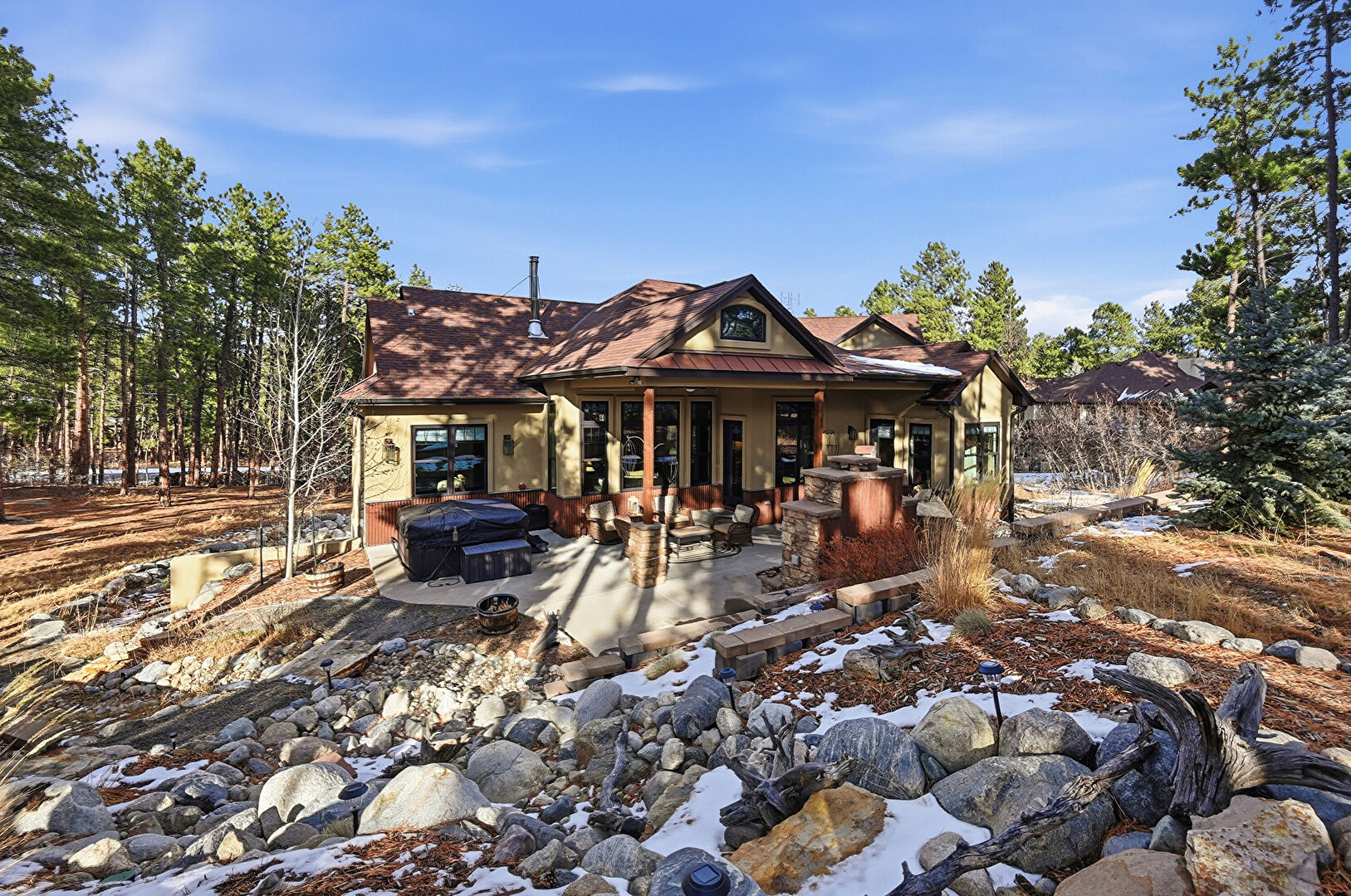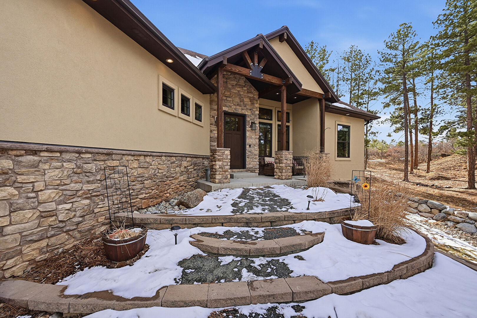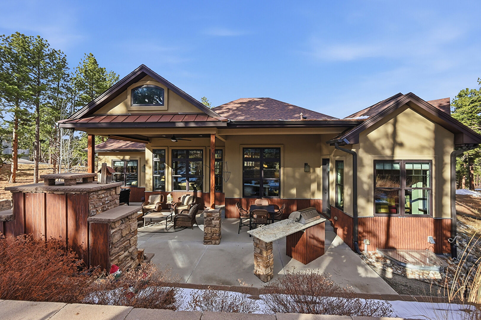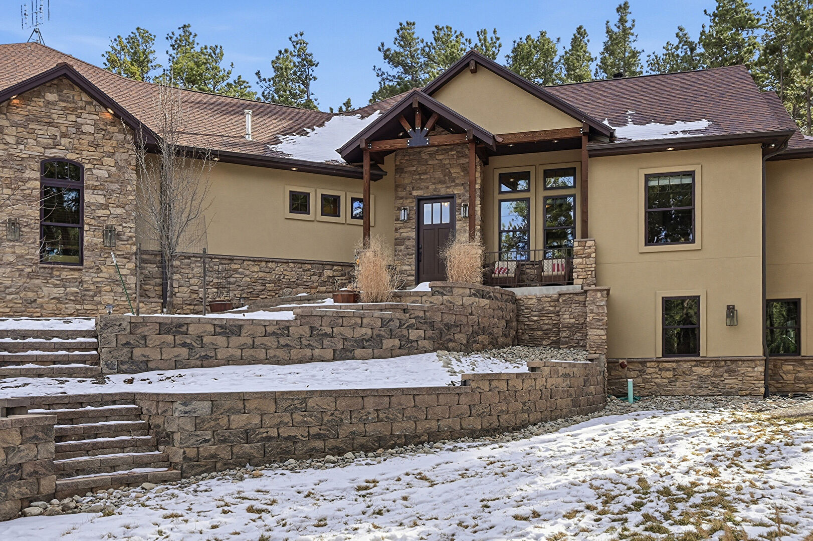 Downspout, Driveway, French Doors, Gutters, Hot Tub, Patio, Porch, Shingle Roof, Stairs, Standing Seam Roof, Stone Siding, Stucco Siding, Gutters, Metal Roof, Stone Siding, Stucco Siding