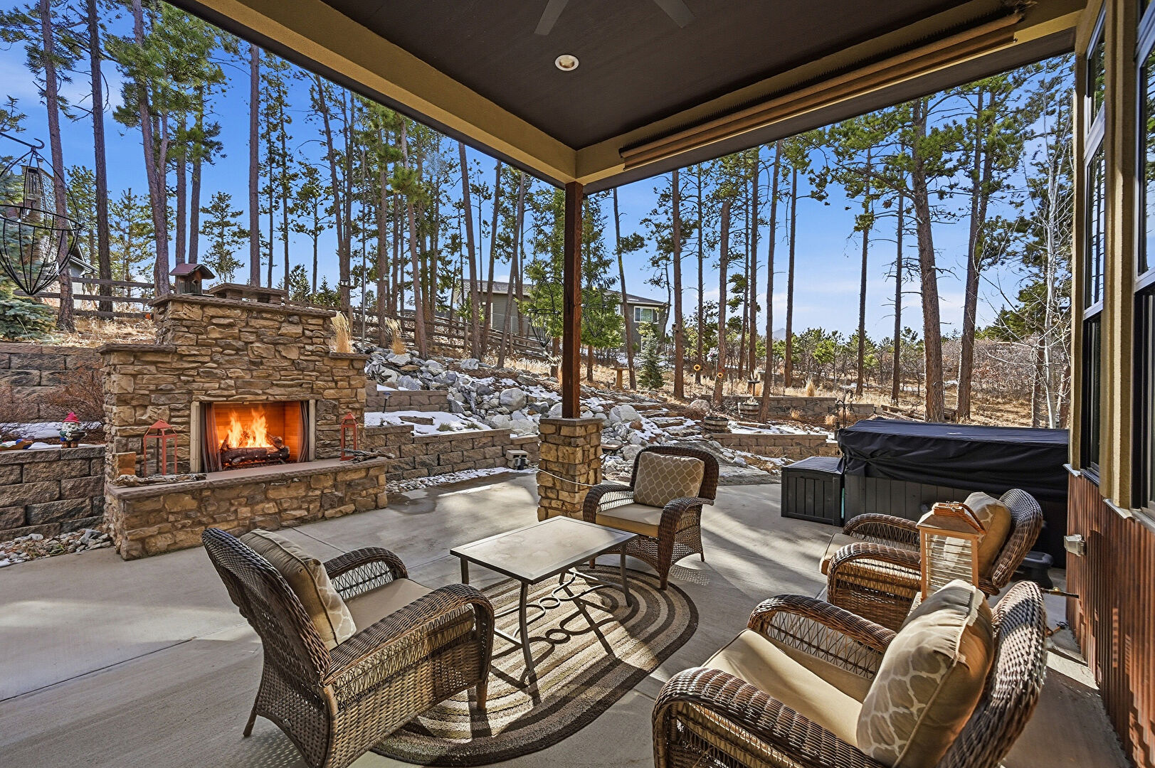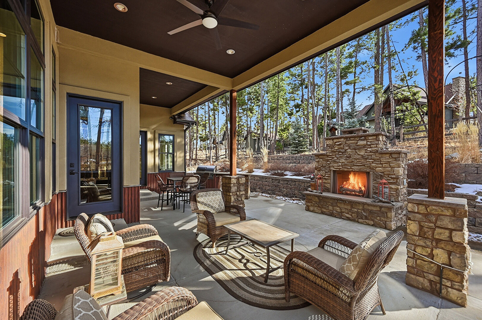 Ceiling Fan, Fireplace, Grill, Outdoor Bar, Outdoor Dining Area, Outdoor Kitchen, Outdoor Living Space, Patio, Porch, Ceiling Fan, Fence, Outdoor Dining Area, Outdoor Living Space, Woods View
