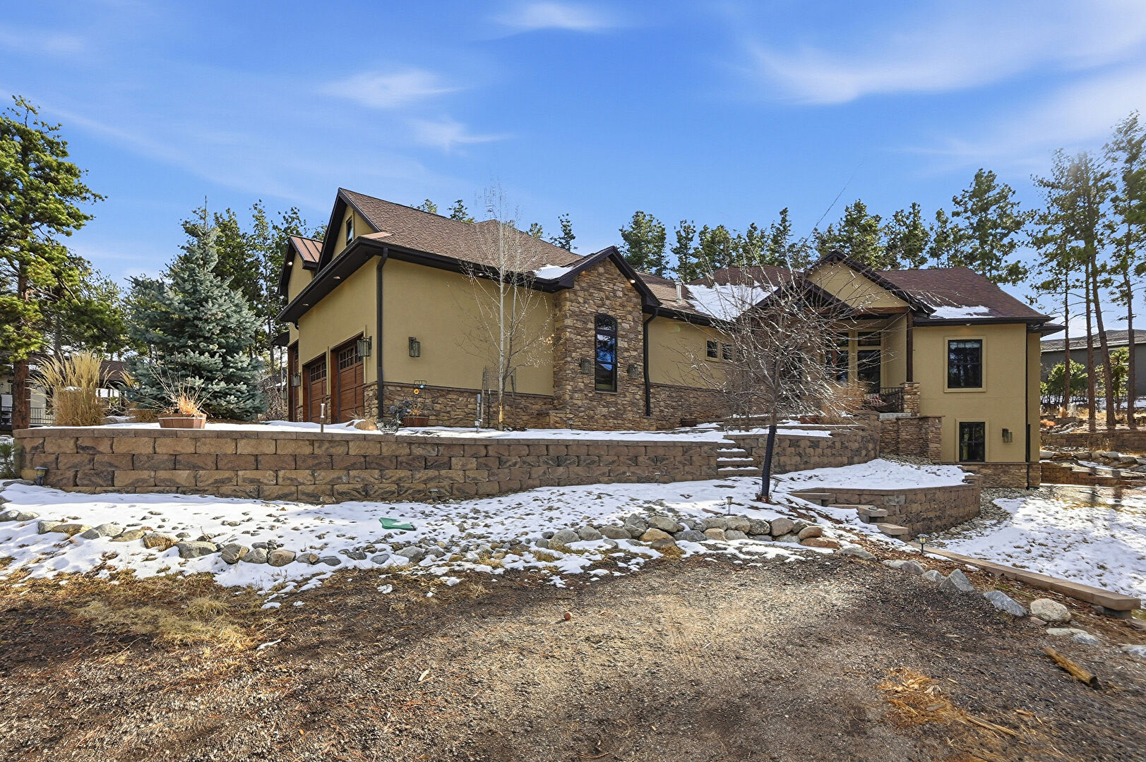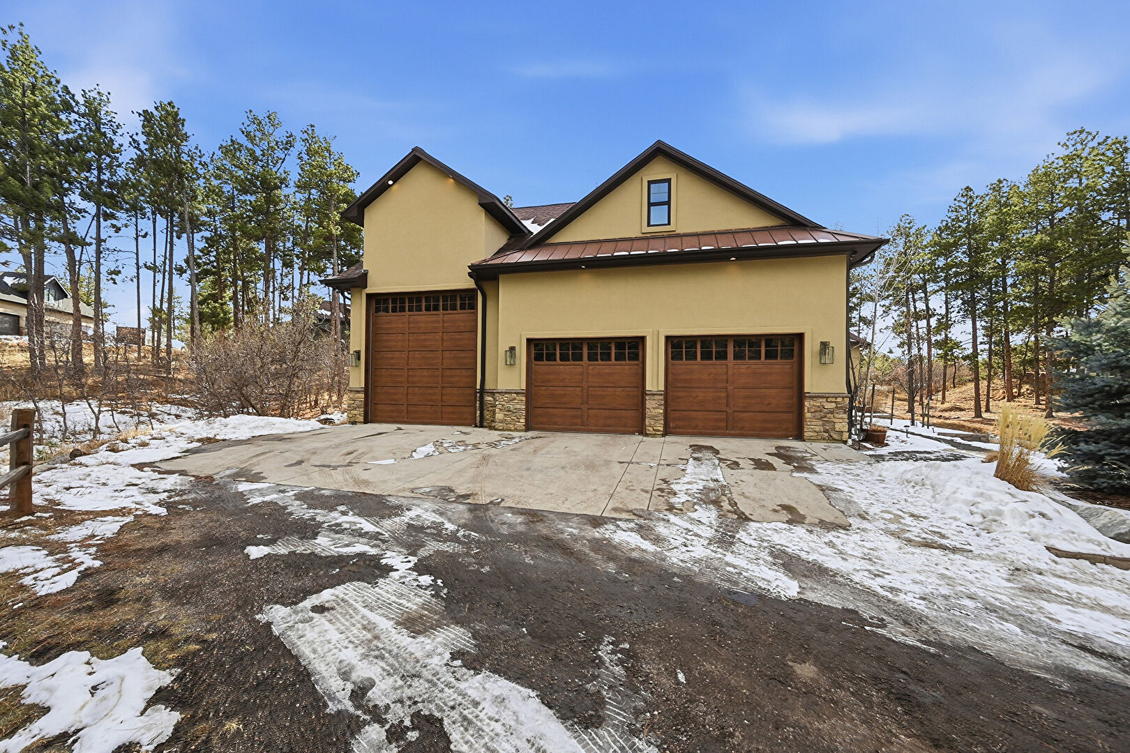 Downspout, Driveway, Fence, Garage, Gutters, Metal Roof, Patio, Stone Siding, Stucco Siding, Gutters, Standing Seam Roof, Stone Siding