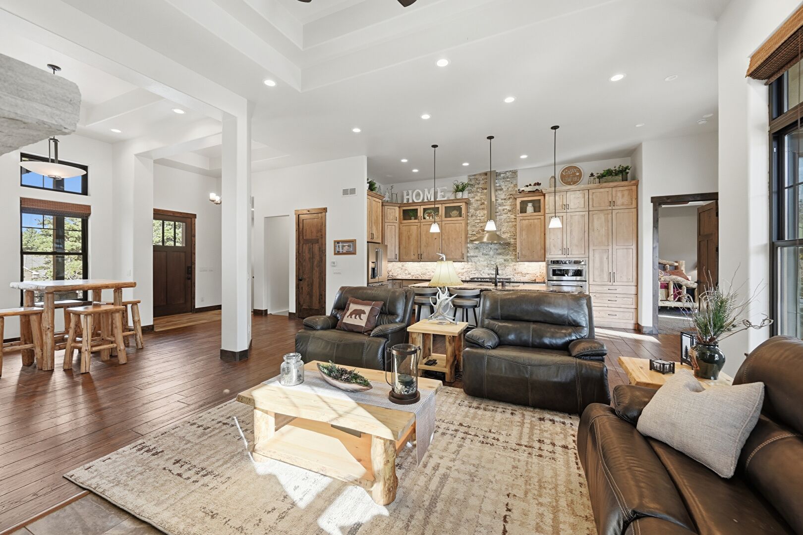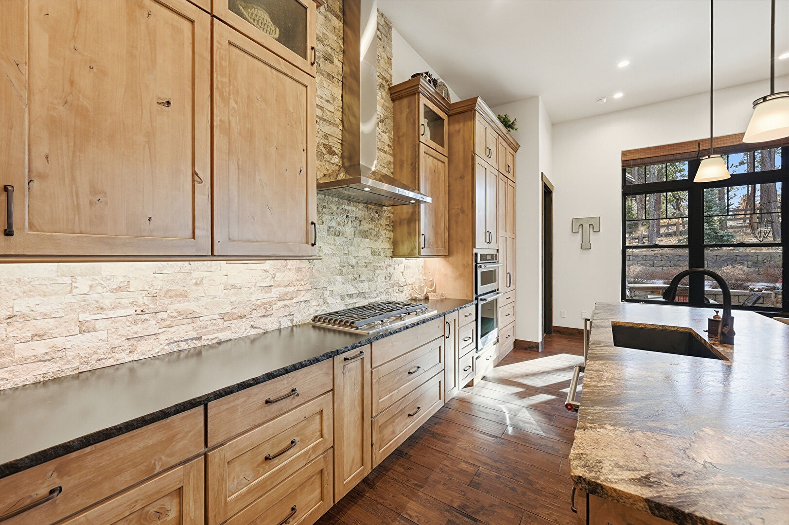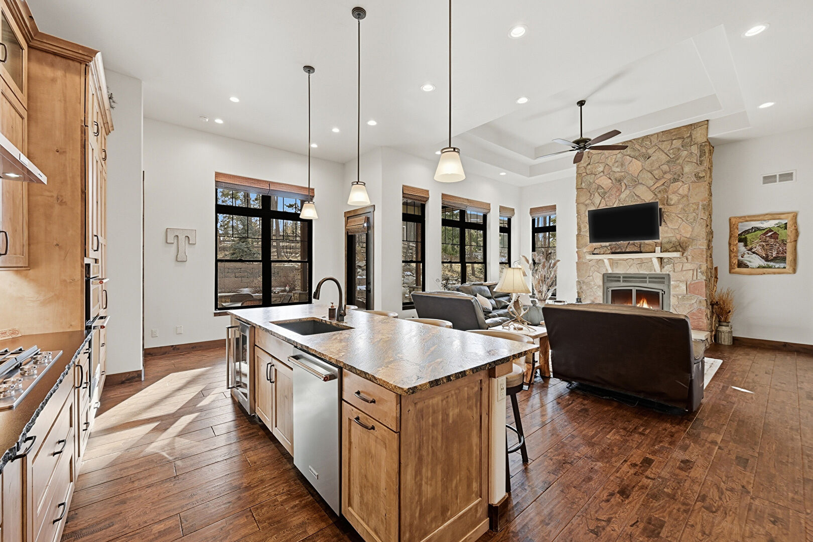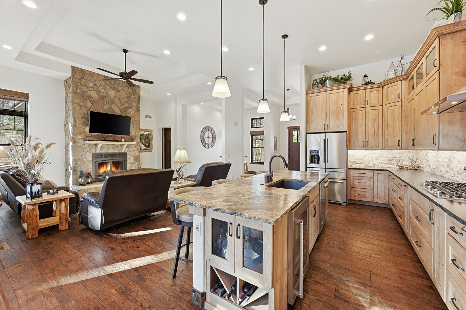 Accent Wall, Baseboards Wall, Ceiling Fan, Crown Molding Cabinets, Double Oven, Drywall, Fireplace, Glass Insert Cabinets, Kitchen Bar, Kitchen Island, L Shaped Kitchen, Medium Brown Cabinets, Natural Light, Notable Chandelier, Open Shelves, Opens To Living Area, Pendant Lighting, Recessed Lighting, Shaker Cabinets, Stone Countertops, Textured Ceiling, Tray Ceiling, Vent, Wine Cooler, Wood Finish Floor, Wood Wall, Glass Insert Cabinets, Kitchen Peninsula, Recessed Lighting, Shaker Cabinets, Vent