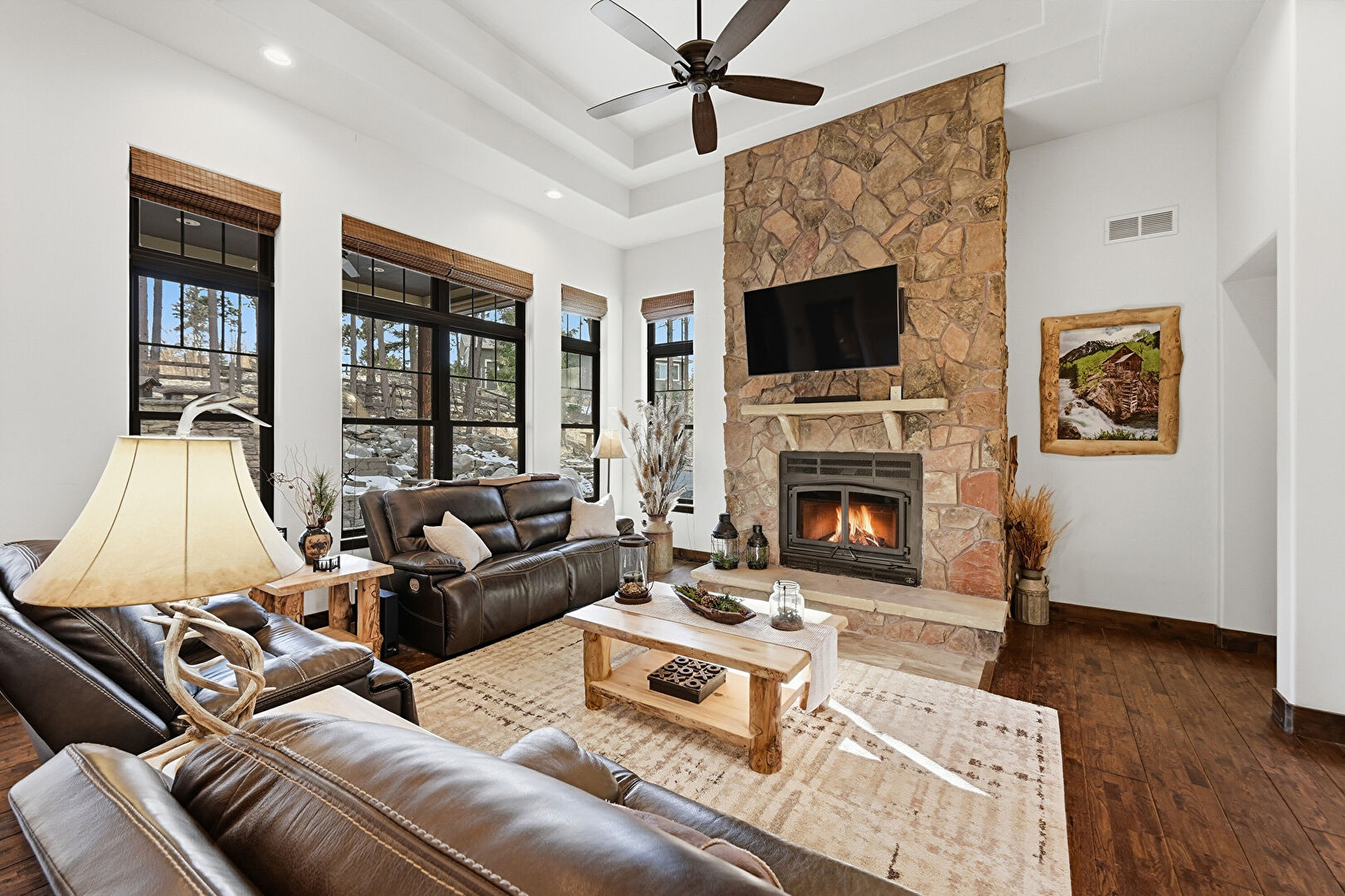 Baseboards Wall, Ceiling Fan, Drywall, Fireplace, High Ceiling, Natural Light, Notable Chandelier, Recessed Lighting, Tray Ceiling, Wood Finish Floor, Drywall, Tray Ceiling, Vent