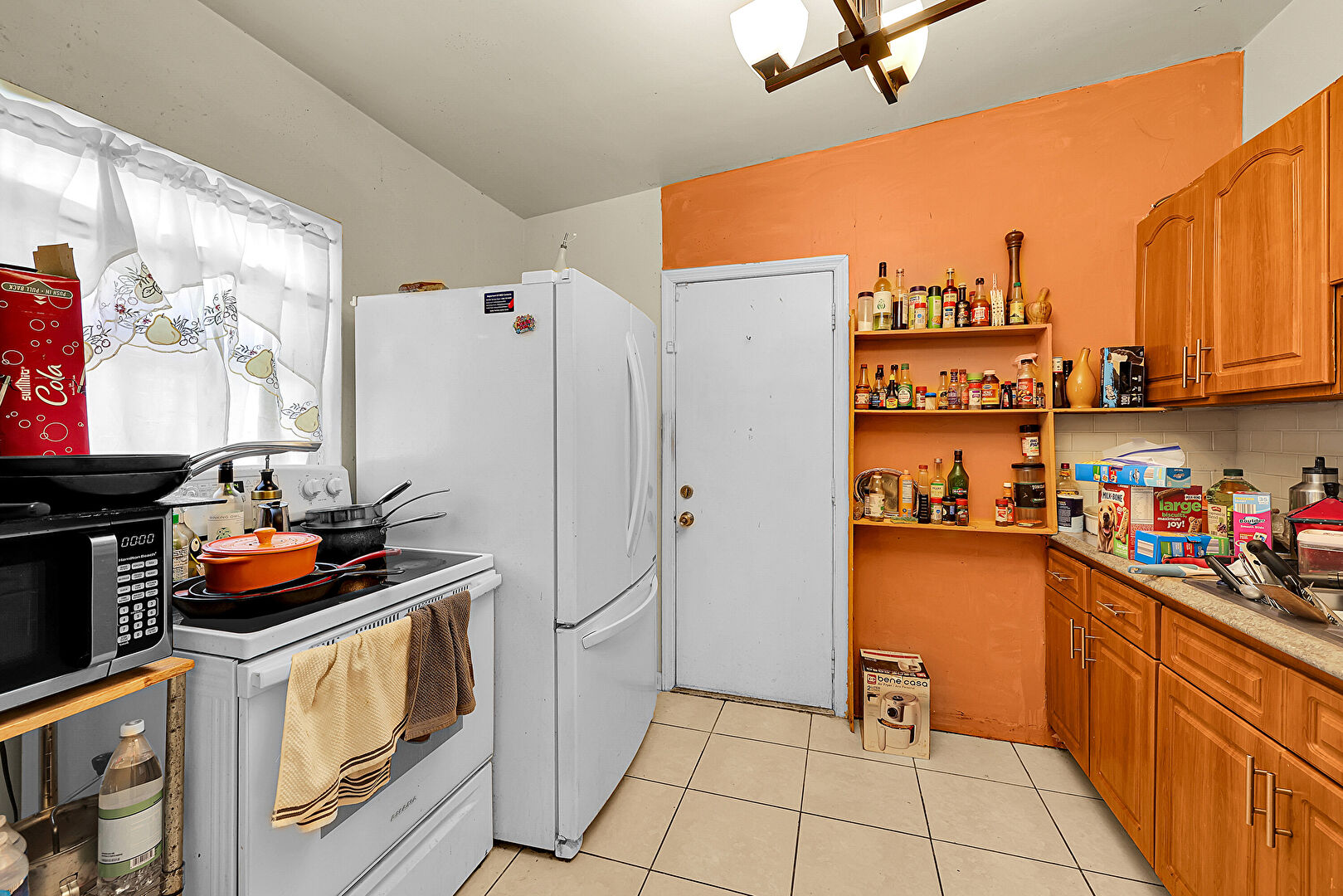 Arched Cabinets, Ceiling Fan, Drywall, Electric Panel, Medium Brown Cabinets, Natural Light, Open Shelves, Raised Cabinets, Stone Countertops, Tile Floor, Baseboards Wall, Notable Chandelier