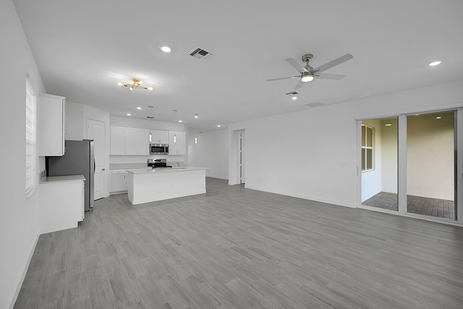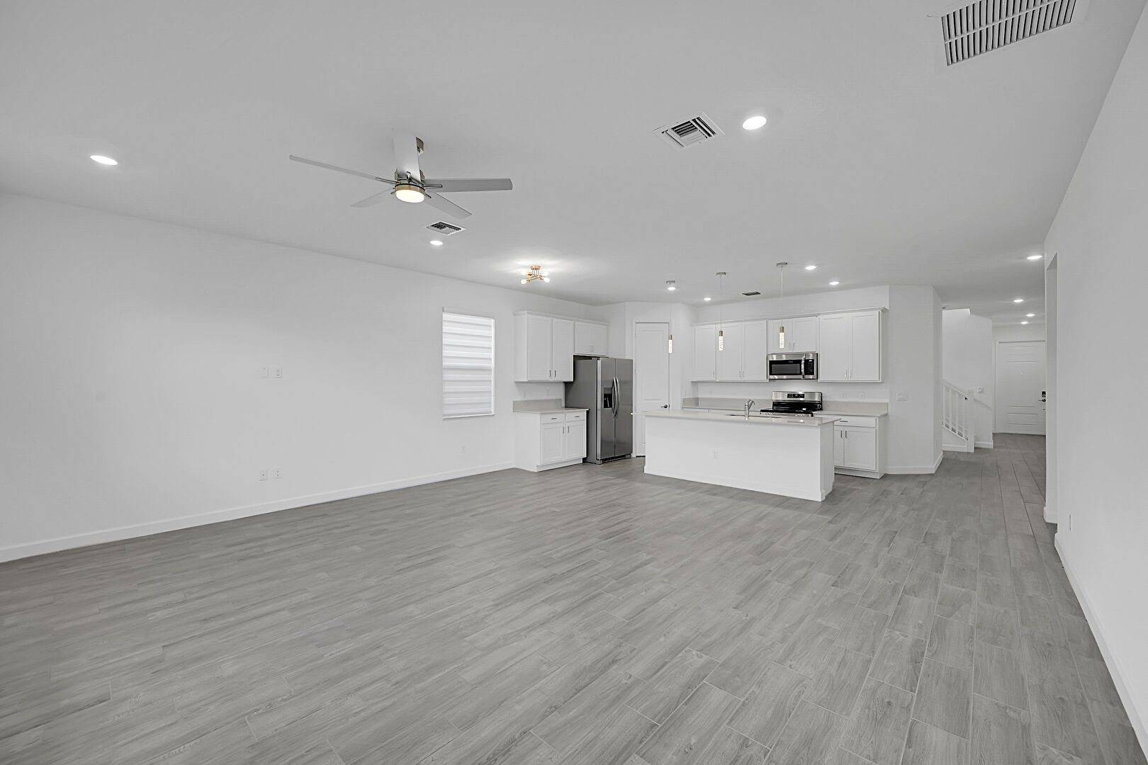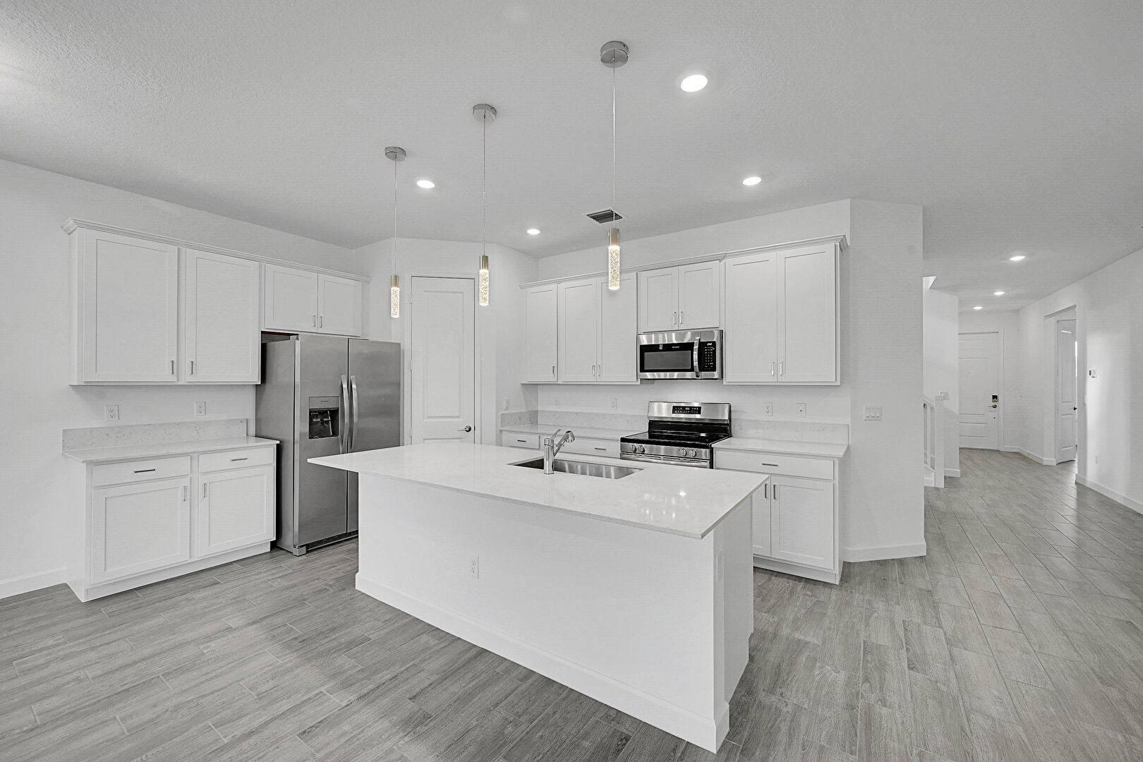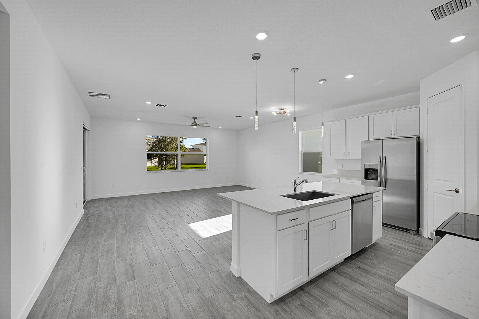 Baseboards Wall, Ceiling Fan, Crown Molding Cabinets, Drywall, Kitchen Island, L Shaped Kitchen, Natural Light, Opens To Living Area, Pendant Lighting, Recessed Lighting, Shaker Cabinets, Vent, Wood Finish Floor, Drywall, Recessed Lighting, Vent
