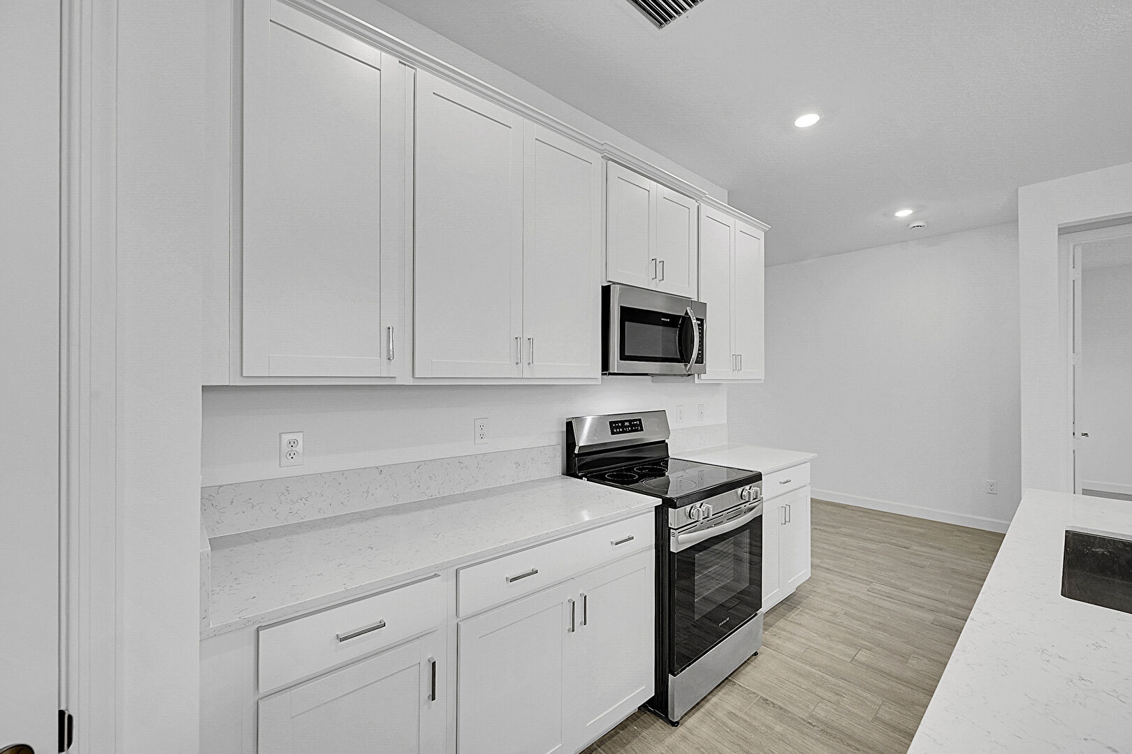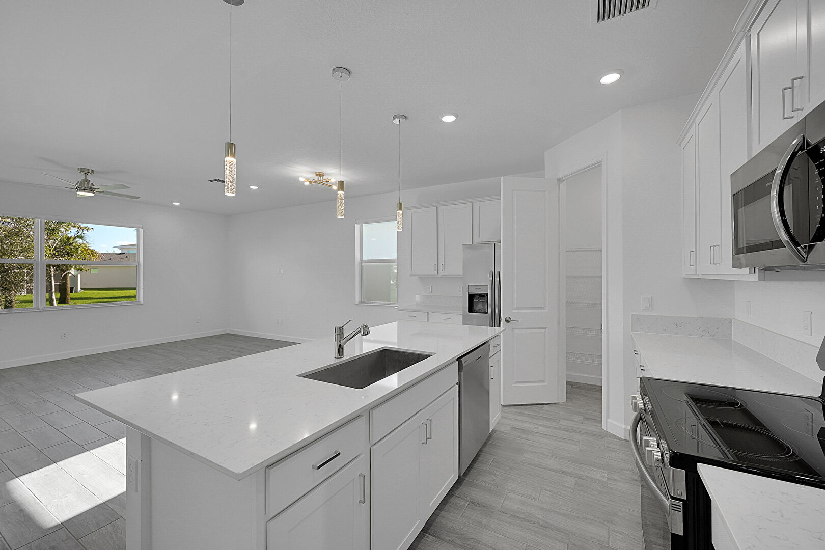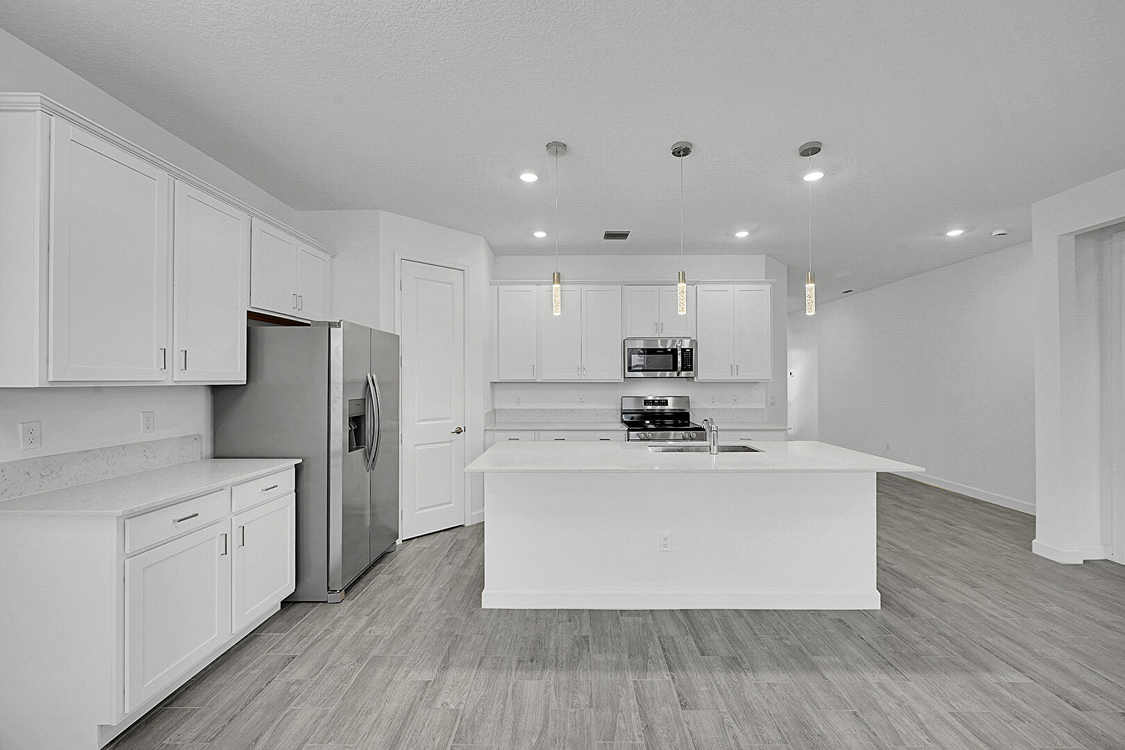 Baseboards Wall, Ceiling Fan, Crown Molding Cabinets, Drywall, Kitchen Island, L Shaped Kitchen, Natural Light, Opens To Living Area, Pendant Lighting, Recessed Lighting, Shaker Cabinets, Stone Countertops, Vent, Wood Finish Floor, Ceiling Fan, Crown Molding Cabinets, Drywall, Kitchen Island, Recessed Lighting
