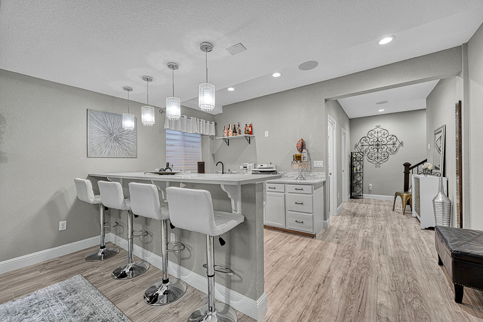 Baseboards Wall, Drywall, Kitchen Bar, Kitchen Peninsula, Natural Light, Open Shelves, Opens To Living Area, Pendant Lighting, Recessed Lighting, Shaker Cabinets, Stone Countertops, Textured Ceiling, Textured Wall, Vent, Wood Finish Floor, Recessed Lighting, Wood Finish Floor