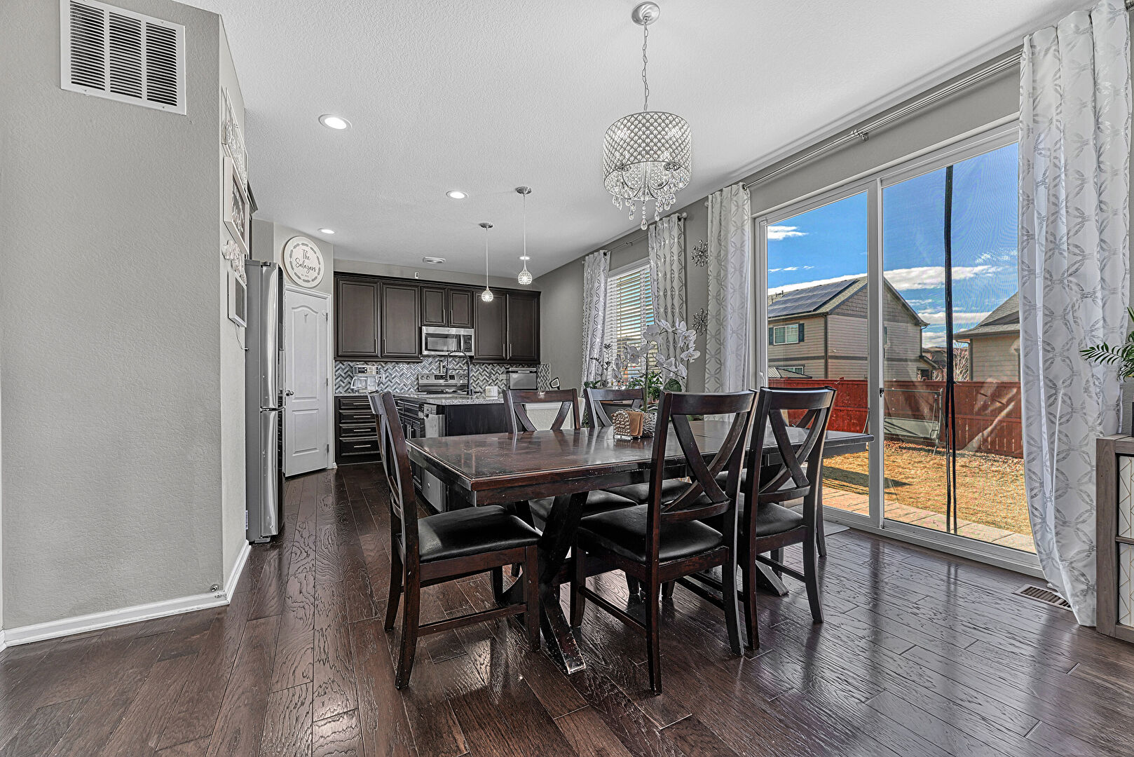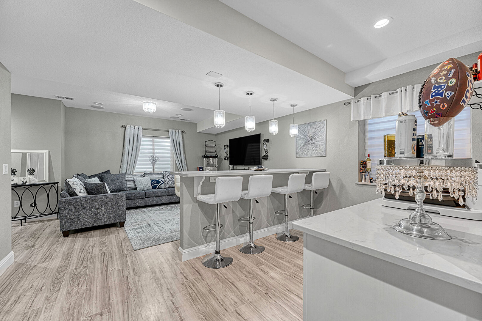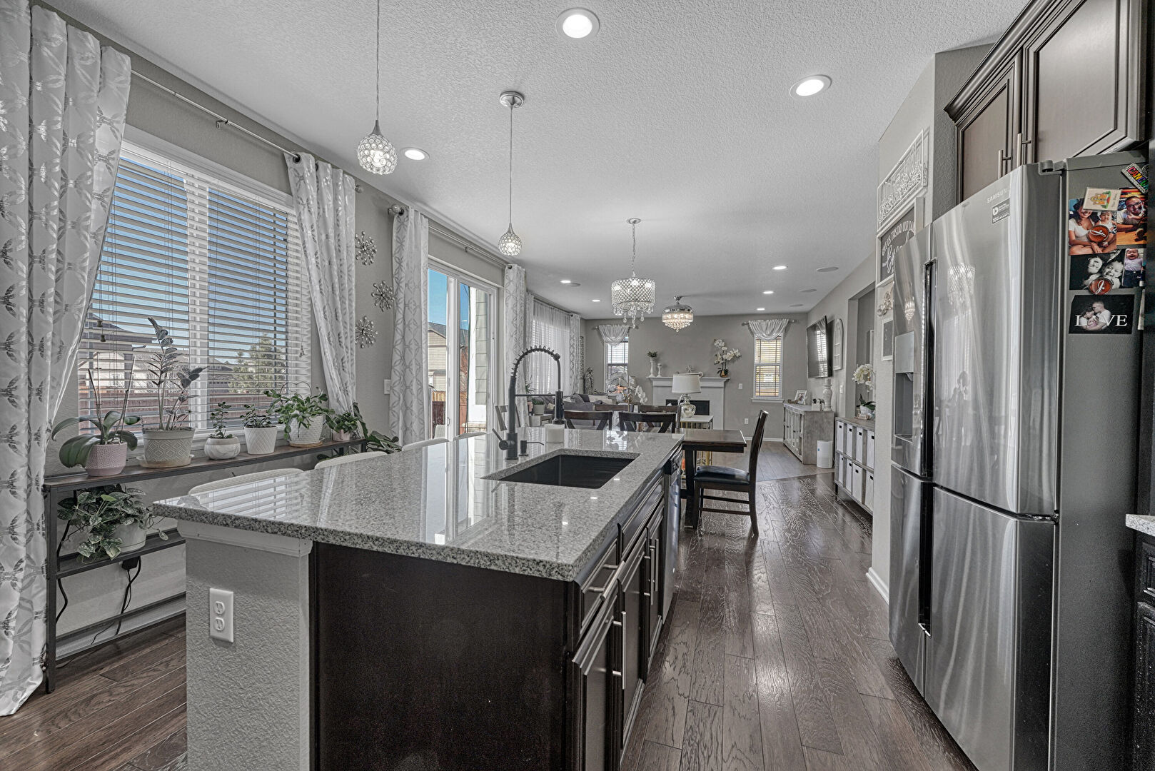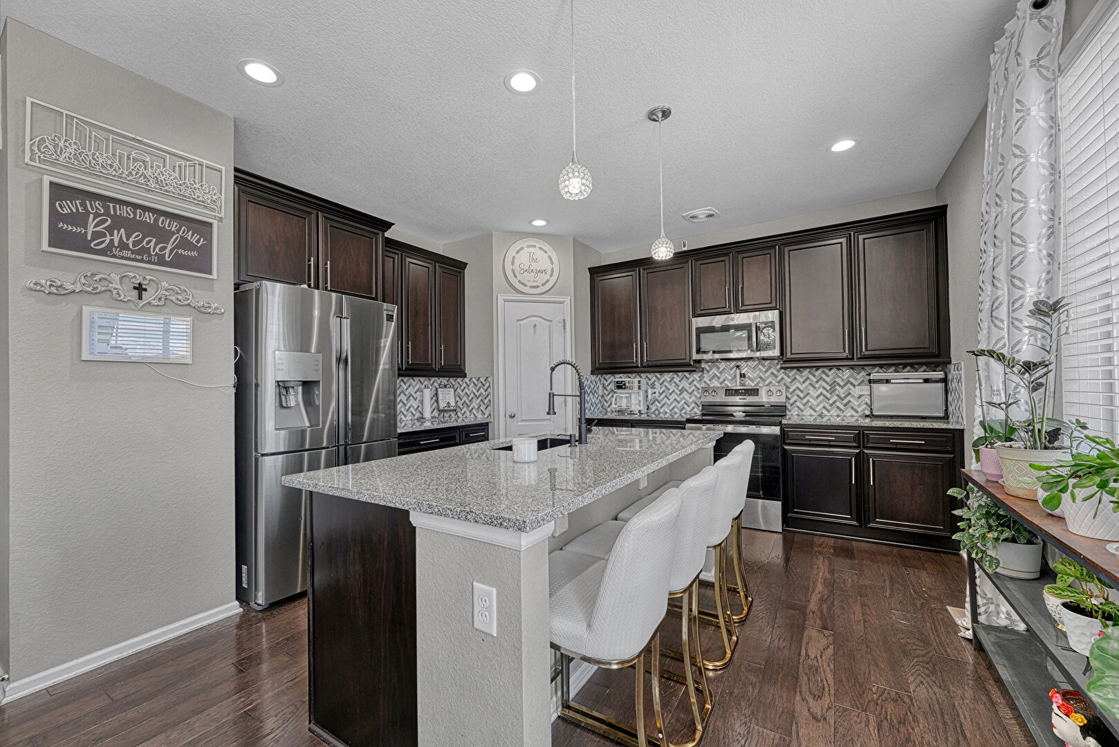 Baseboards Wall, Crown Molding Cabinets, Dark Brown Cabinets, Drywall, Kitchen Bar, Kitchen Island, L Shaped Kitchen, Natural Light, Notable Chandelier, Opens To Living Area, Pendant Lighting, Recessed Lighting, Shaker Cabinets, Stone Countertops, Textured Ceiling, Textured Wall, Vent, Wood Finish Floor, Baseboards Wall, Textured Ceiling, Wood Finish Floor