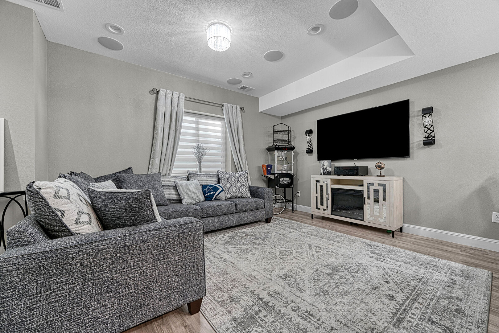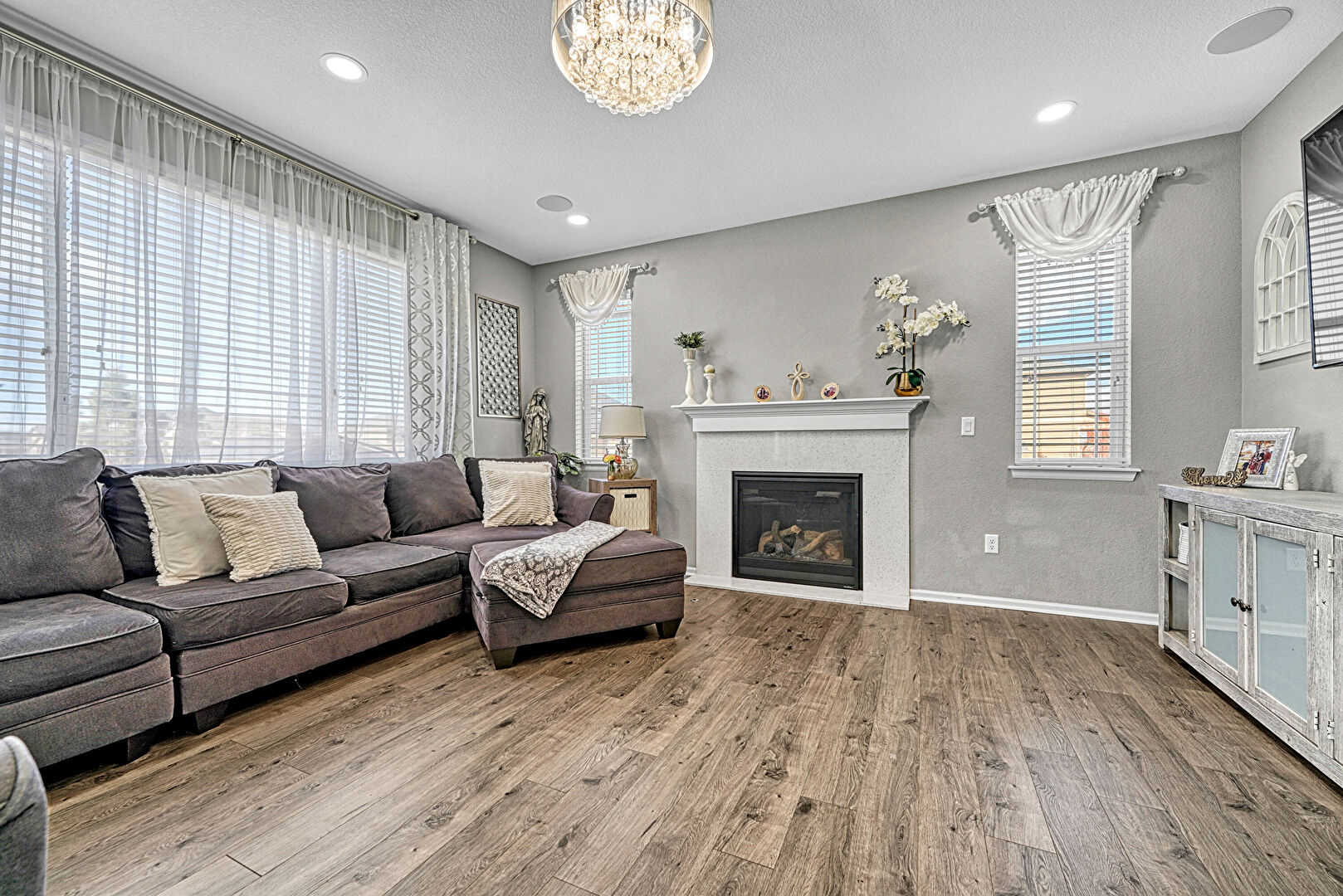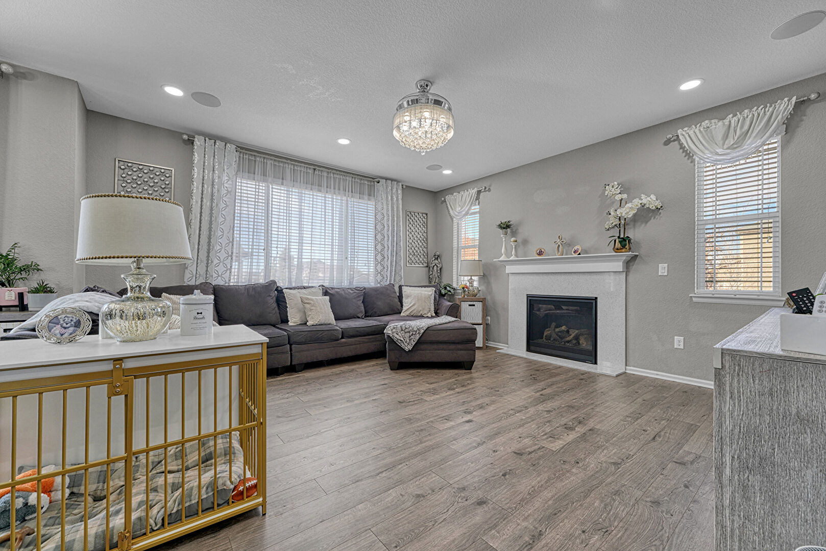 Baseboards Wall, Drywall, Fireplace, Natural Light, Notable Chandelier, Recessed Lighting, Textured Ceiling, Vent, Wood Finish Floor, Notable Chandelier, Textured Ceiling, Wood Finish Floor