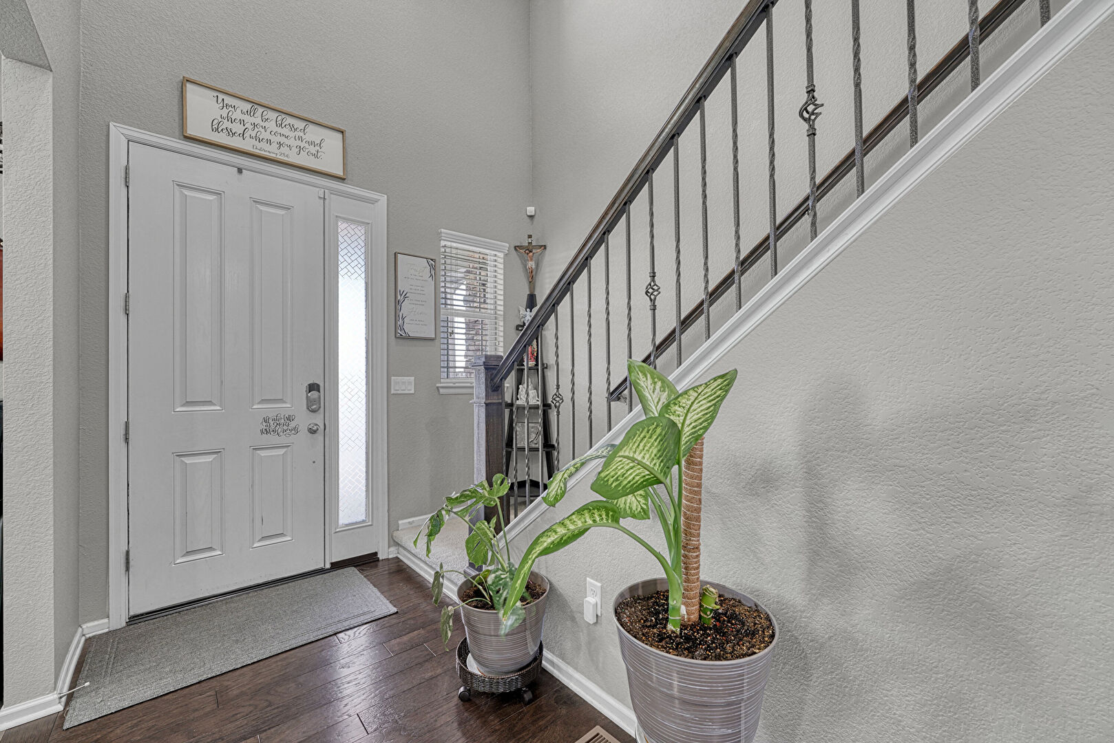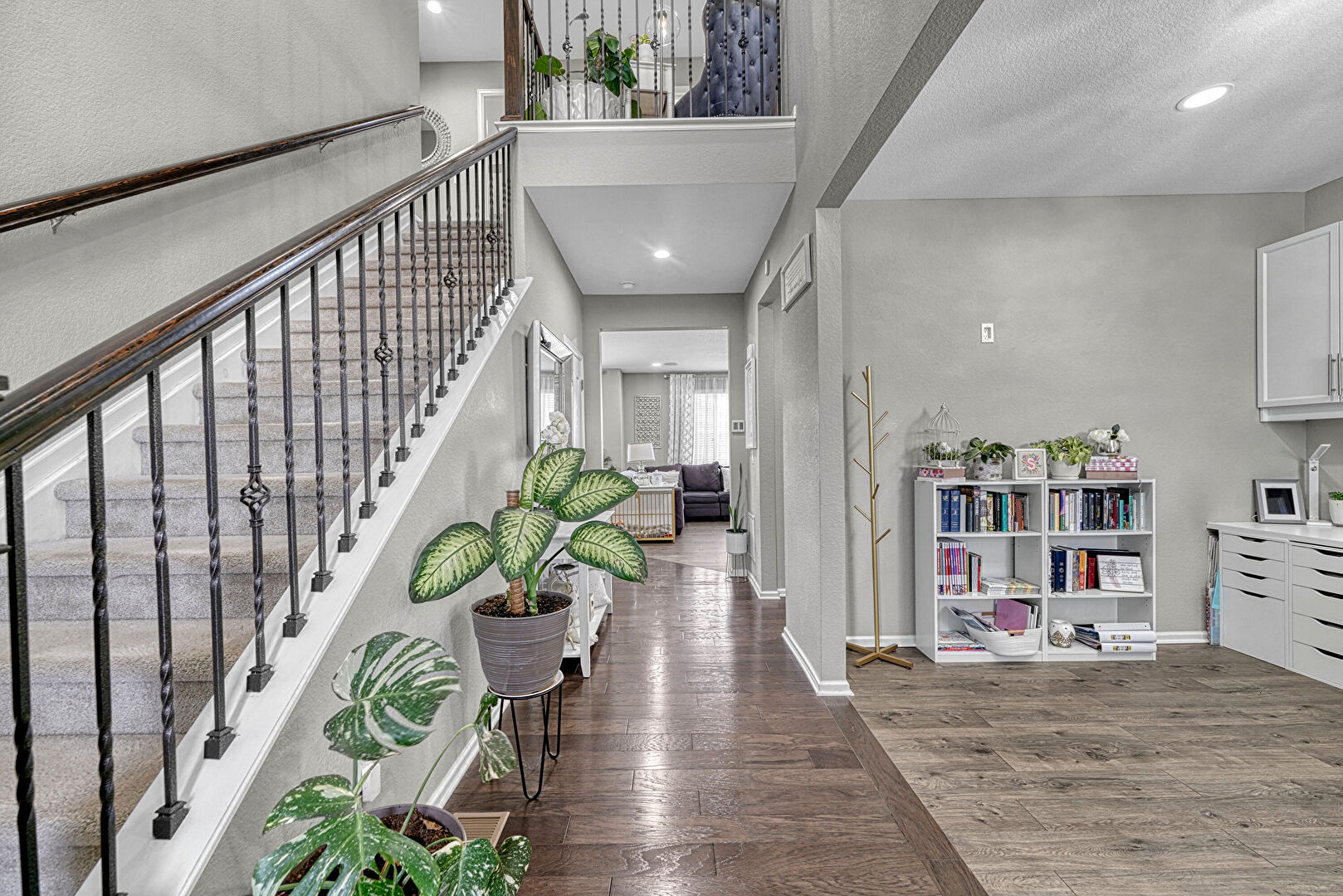 Baseboards Wall, Drywall, High Ceiling, Natural Light, Stairs, Textured Ceiling, Textured Wall, Wood Finish Floor, Baseboards Wall, Recessed Lighting