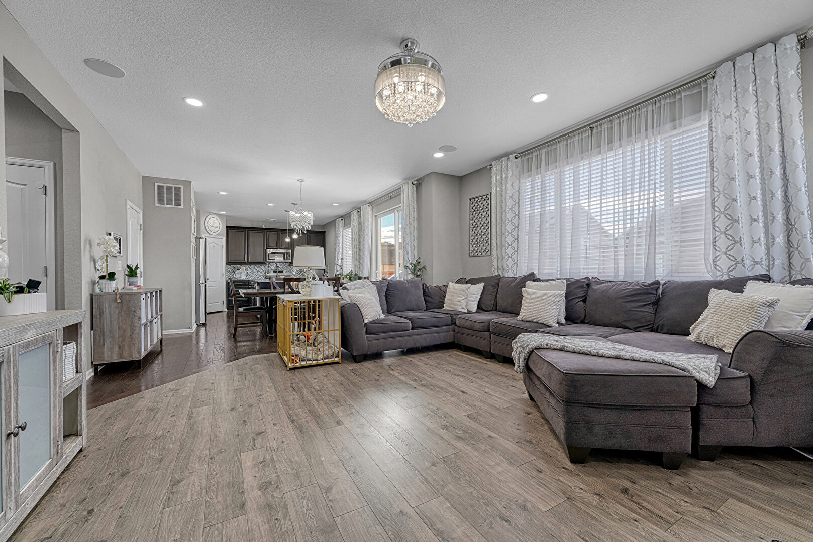 Baseboards Wall, Drywall, Fireplace, L Shaped Kitchen, Natural Light, Notable Chandelier, Recessed Lighting, Textured Ceiling, Textured Wall, Vent, Wood Finish Floor, Baseboards Wall, Textured Ceiling