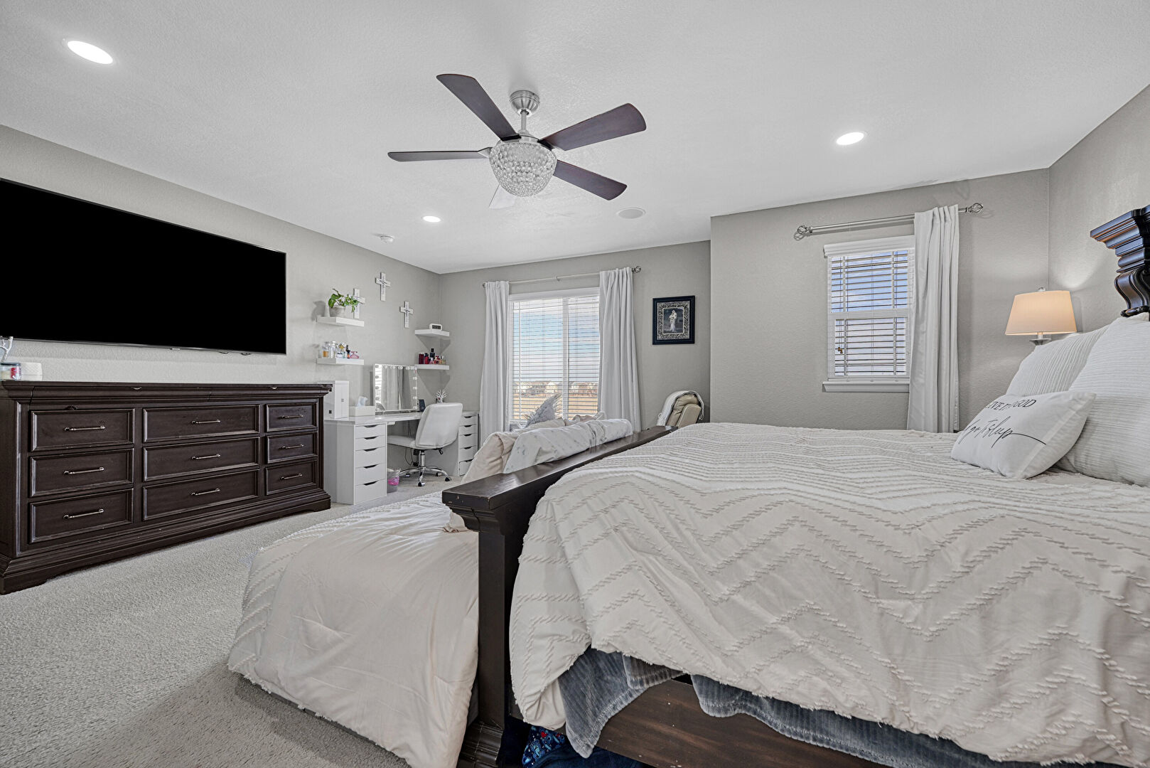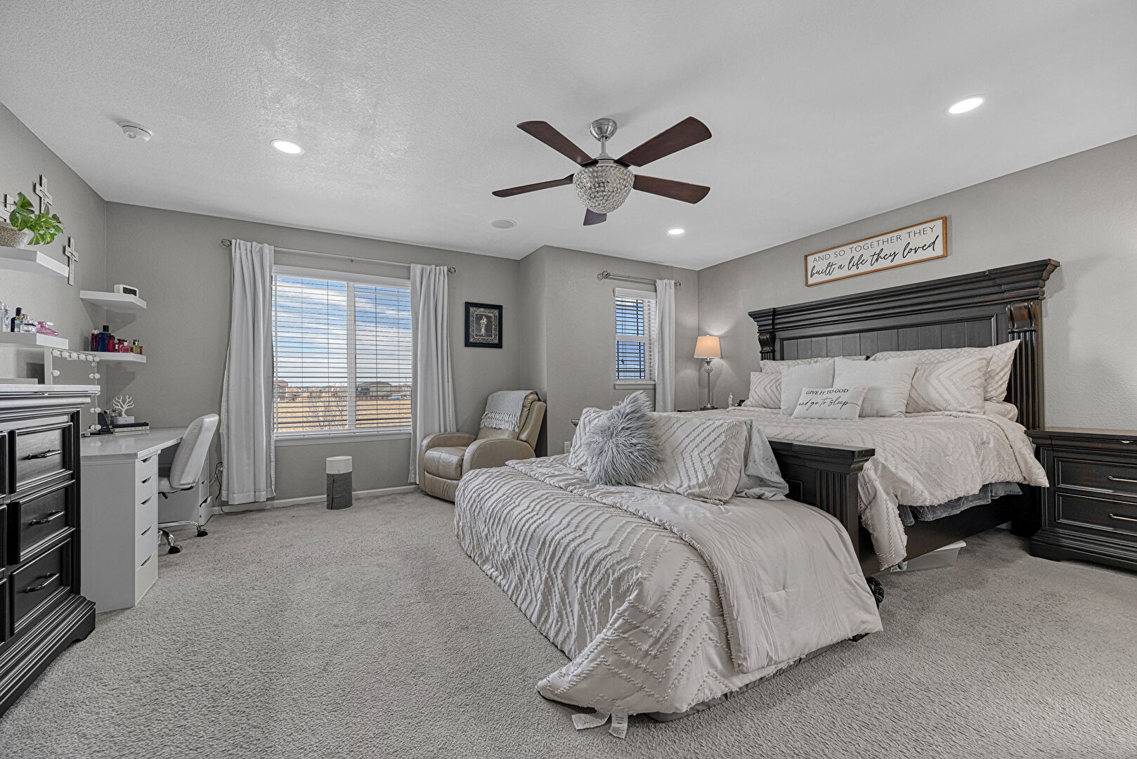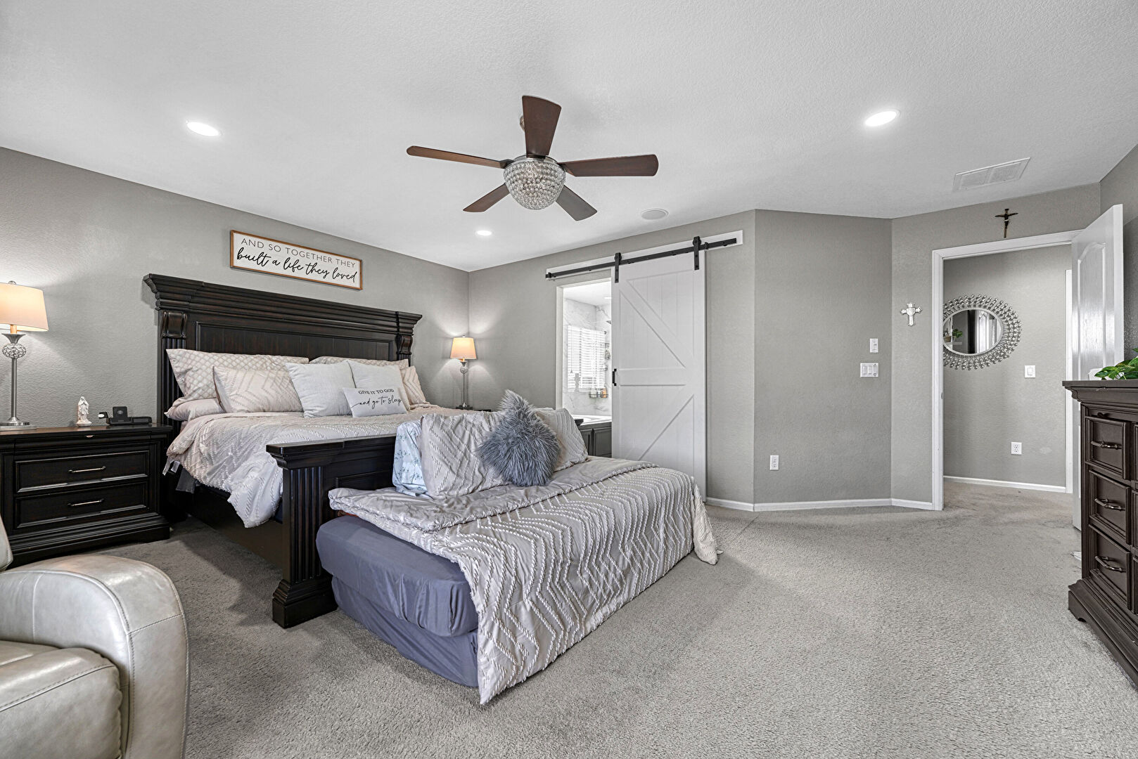 Barn Door, Baseboards Wall, Carpet, Ceiling Fan, Drywall, Ensuite Bathroom, Natural Light, Office Area, Recessed Lighting, Smoke Carbon Monoxide Detector, Textured Ceiling, Vent, Natural Light, Recessed Lighting