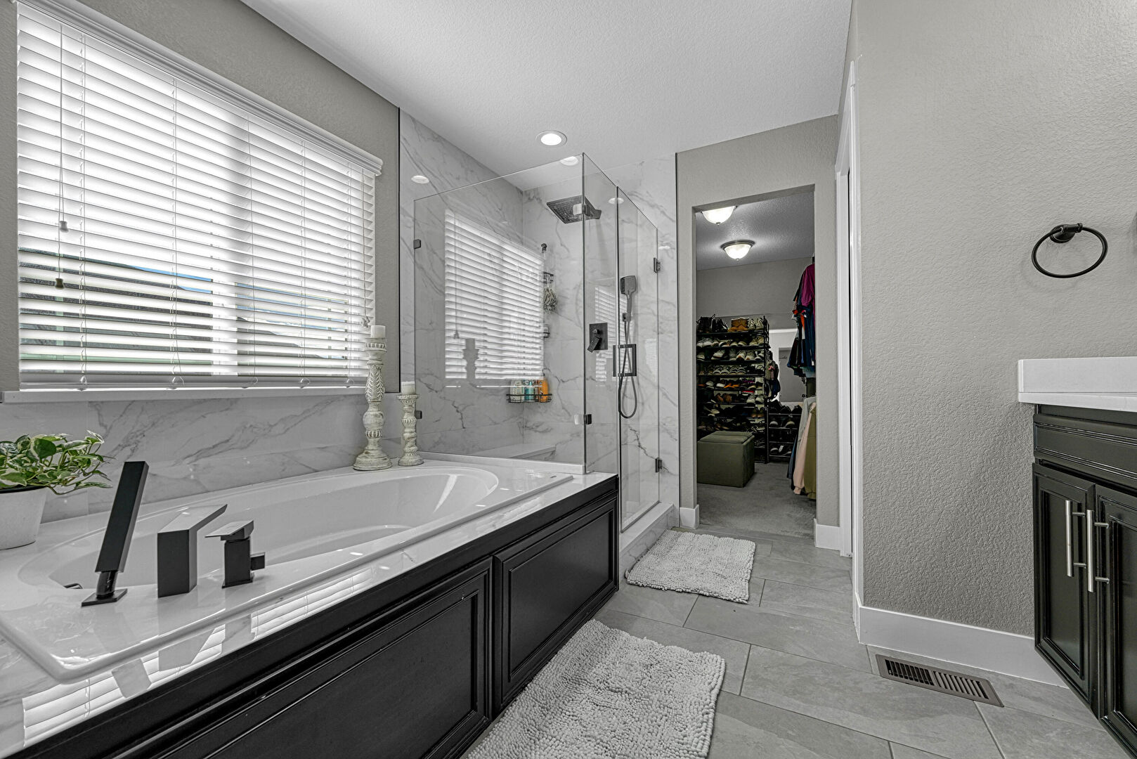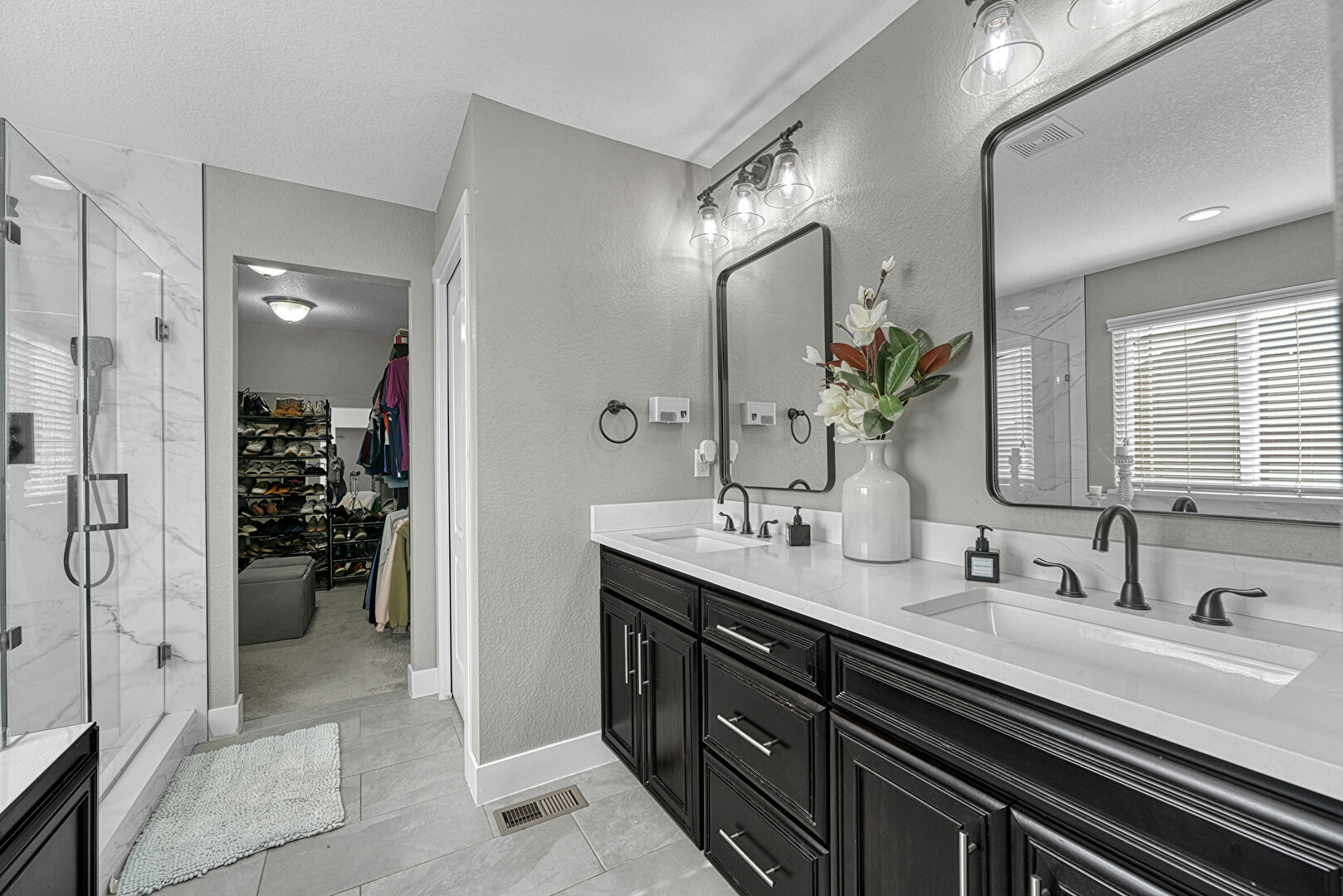 Baseboards Wall, Double Vanity, Full Bathroom, Natural Light, Recessed Lighting, Textured Ceiling, Textured Wall, Tile Floor, Vanity, Vent, Walk In Closet, Baseboards Wall, Tile Floor