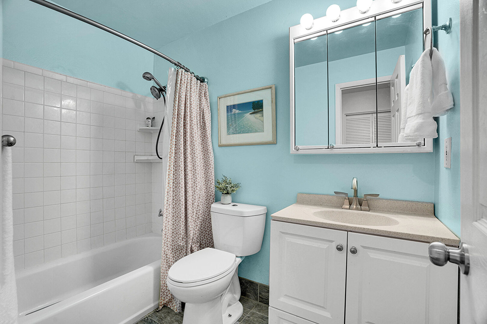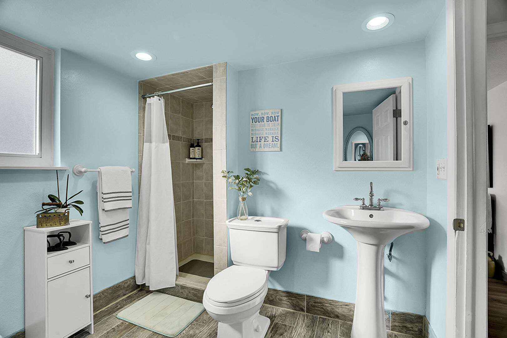 Baseboards Wall, Combined Bath Shower, Drywall, Full Bathroom, Natural Light, Recessed Lighting, Vanity, Wood Finish Floor, Full Bathroom, Tile Floor