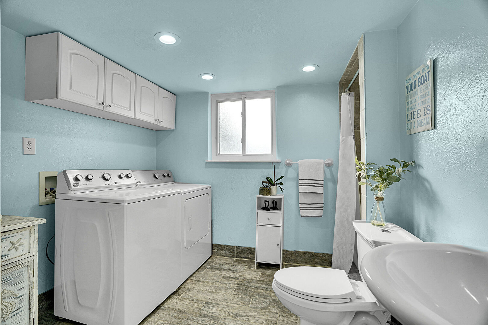 Baseboards Wall, Full Bathroom, Laundry, Natural Light, Recessed Lighting, Textured Wall, Vanity, Wood Finish Floor, Washer Hookup