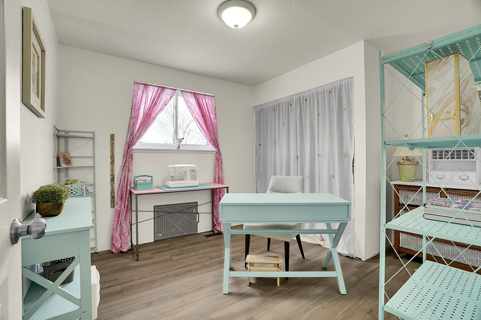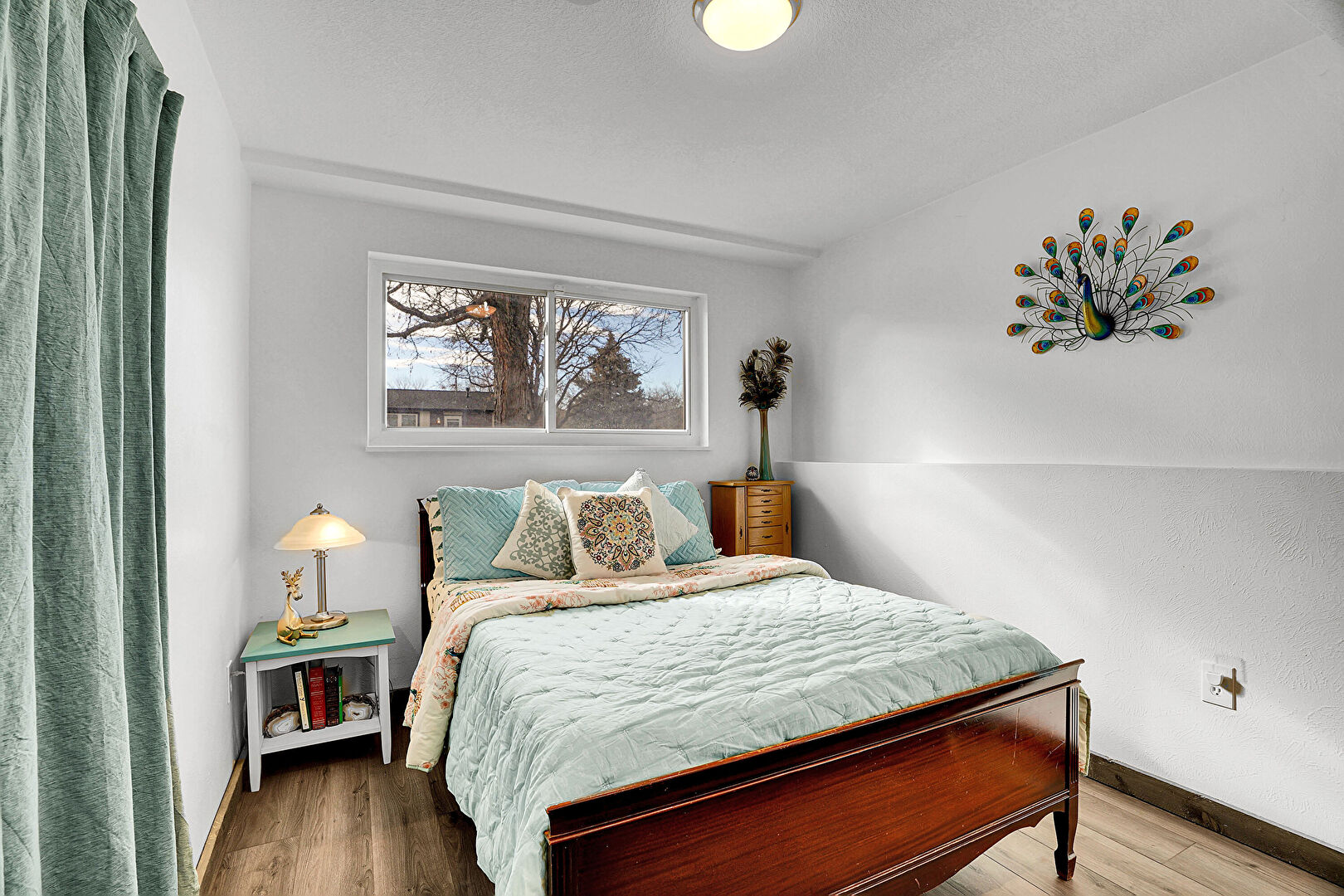 Drywall, Natural Light, Textured Ceiling, Wood Finish Floor