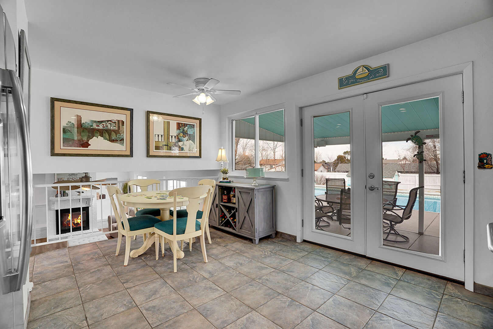Baseboards Wall, Drywall, Fireplace, French Doors, Natural Light, Stairs, Stone Finish Floor, Ceiling Fan