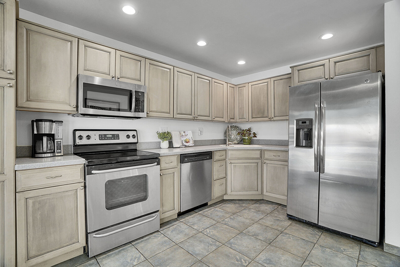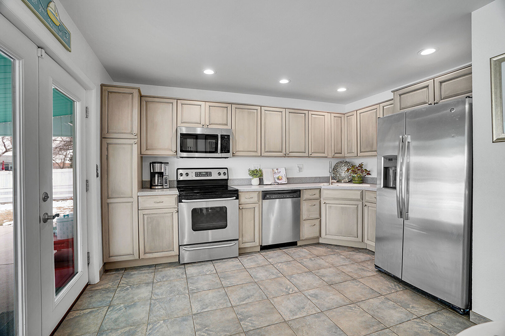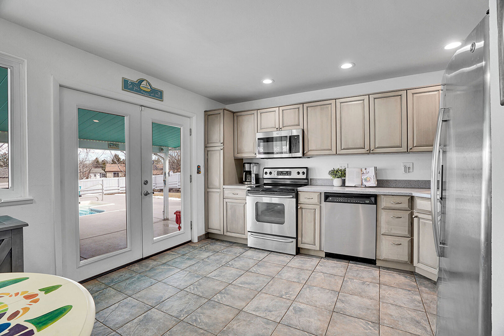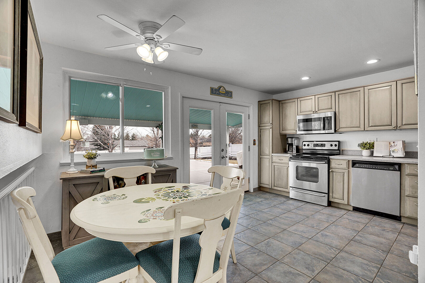 Ceiling Fan, Drywall, French Doors, L Shaped Kitchen, Natural Light, Raised Cabinets, Recessed Lighting, Tile Floor, Drywall, French Doors, L Shaped Kitchen, Recessed Lighting