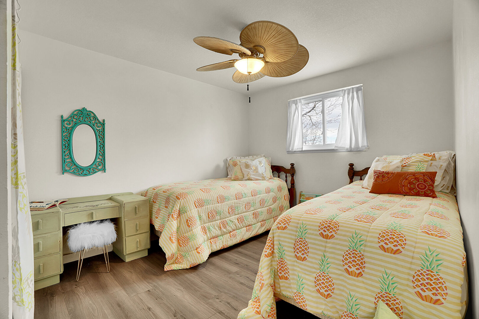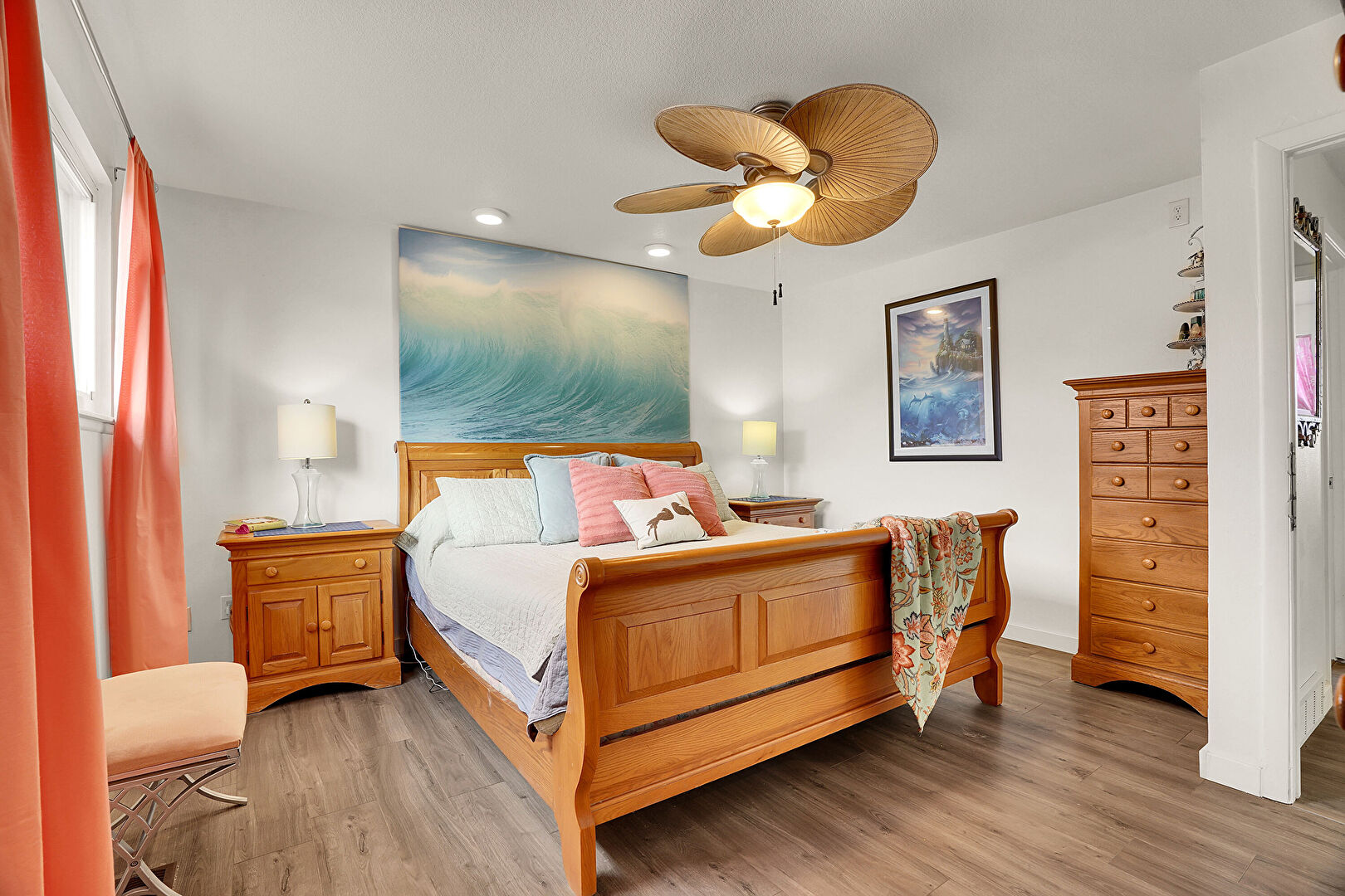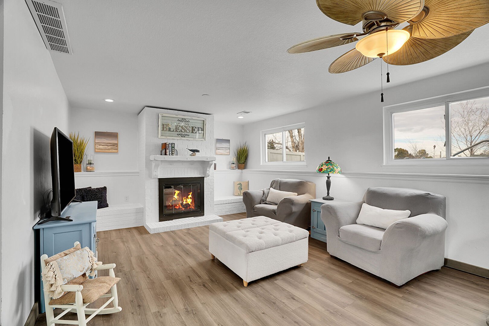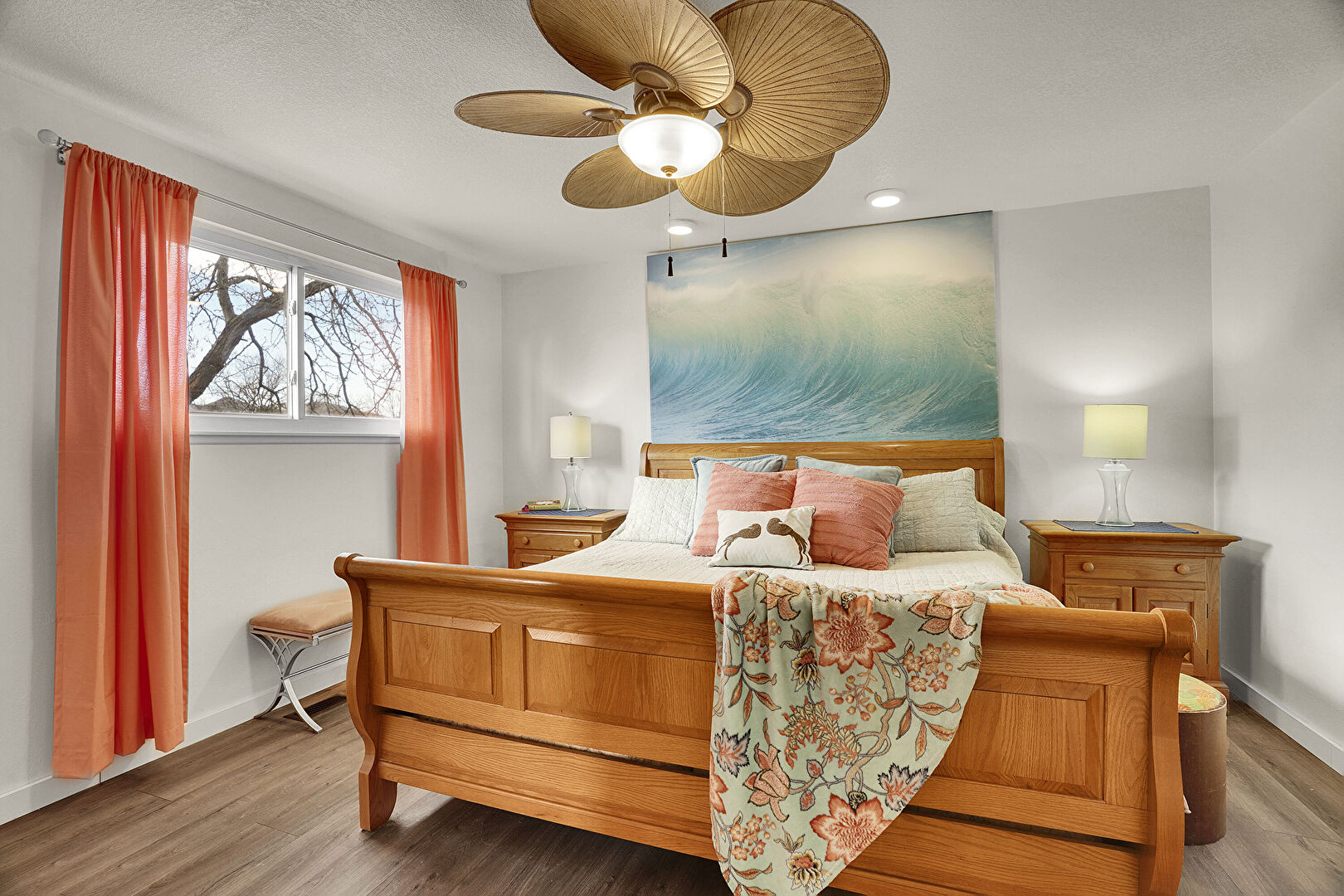 Ceiling Fan, Drywall, Natural Light, Wood Finish Floor