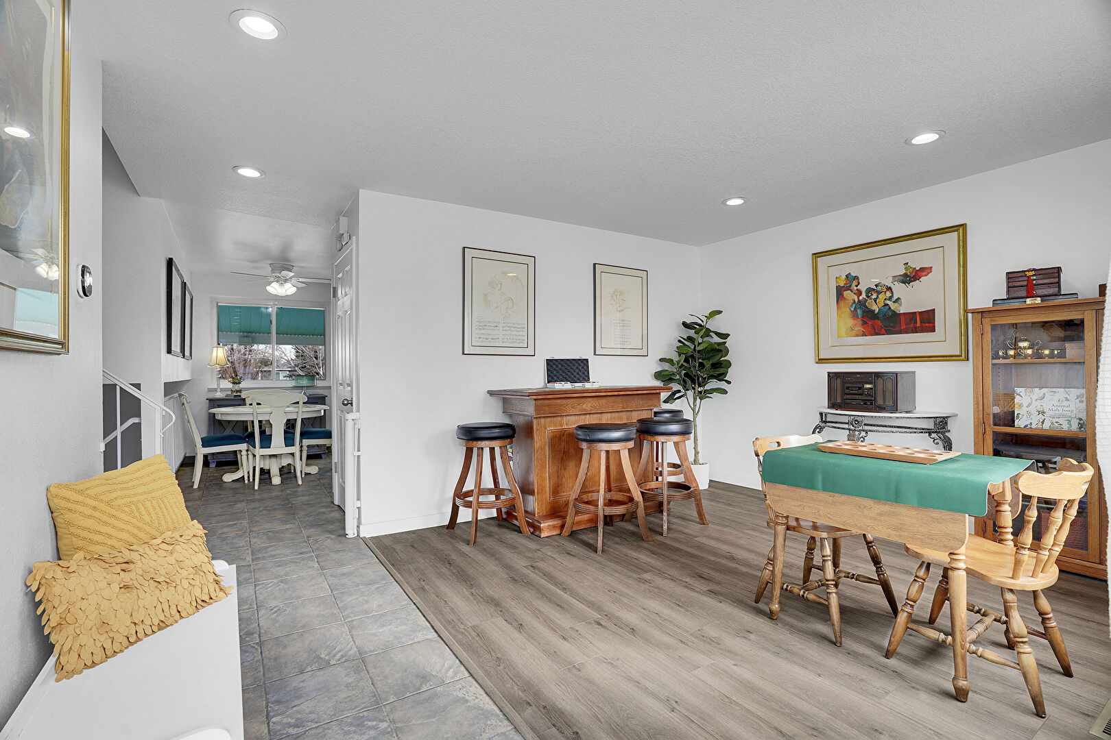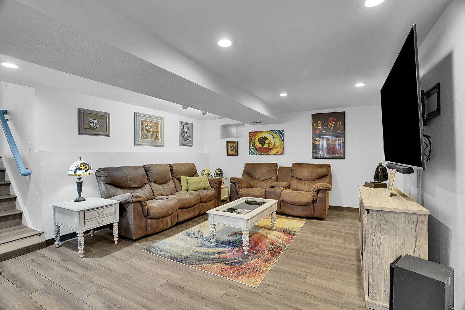 Baseboards Wall, Basement, Ceiling Fan, Drywall, Natural Light, Recessed Lighting, Stairs, Textured Ceiling, Tile Floor, Vent, Wood Finish Floor, Baseboards Wall, Drywall, Natural Light, Textured Ceiling