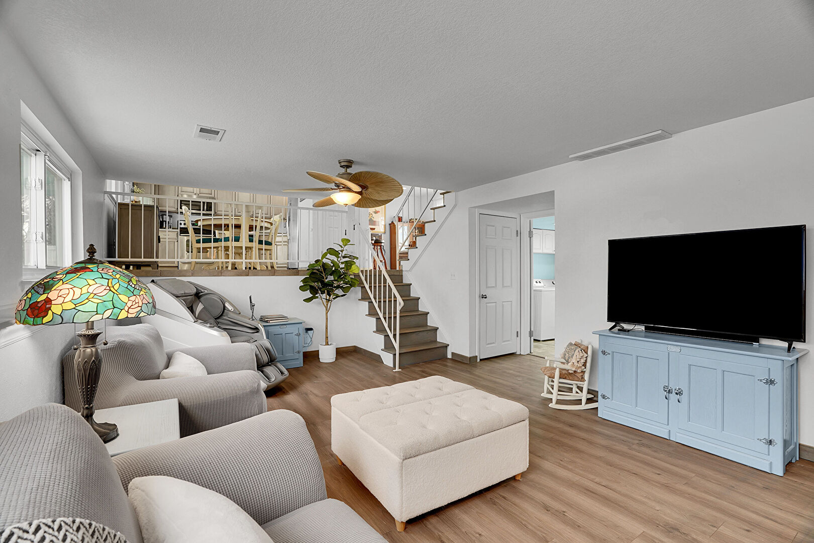 Baseboards Wall, Ceiling Fan, Drywall, Fireplace, Laundry, Natural Light, Stairs, Vent, Washer Dryer, Wood Finish Floor, Recessed Lighting, Vent