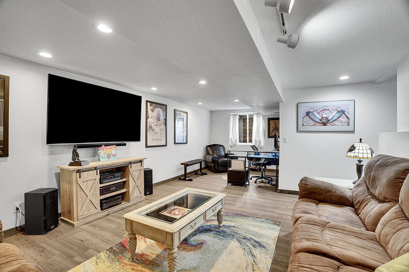 Baseboards Wall, Basement, Natural Light, Office Area, Recessed Lighting, Textured Ceiling, Wood Finish Floor, Drywall