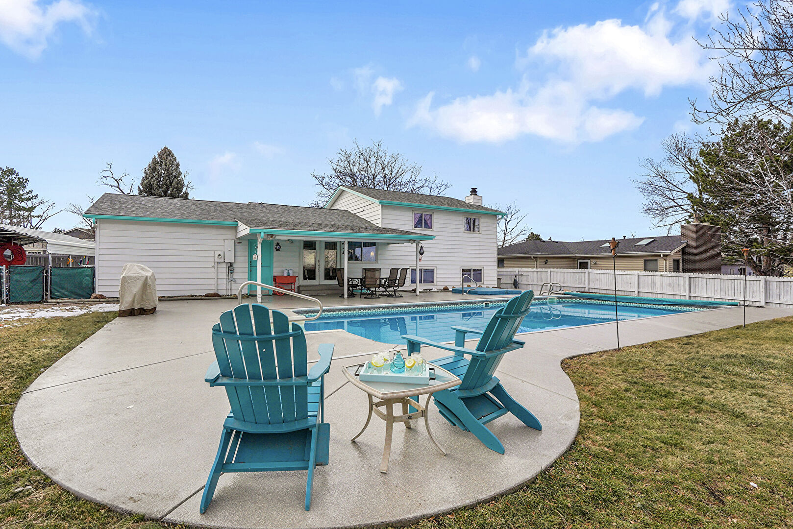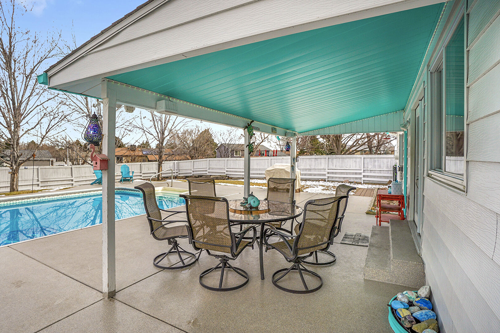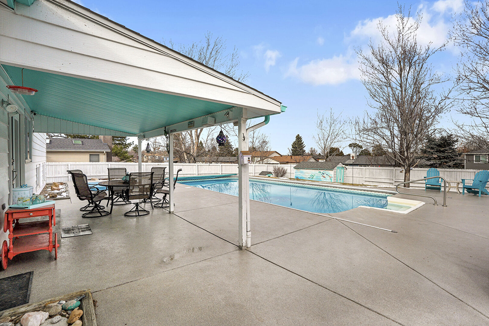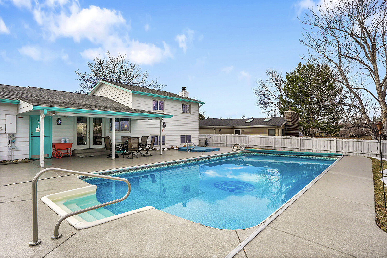 Fence, Handrail, Outdoor Dining Area, Patio, Pool, Fence, Patio