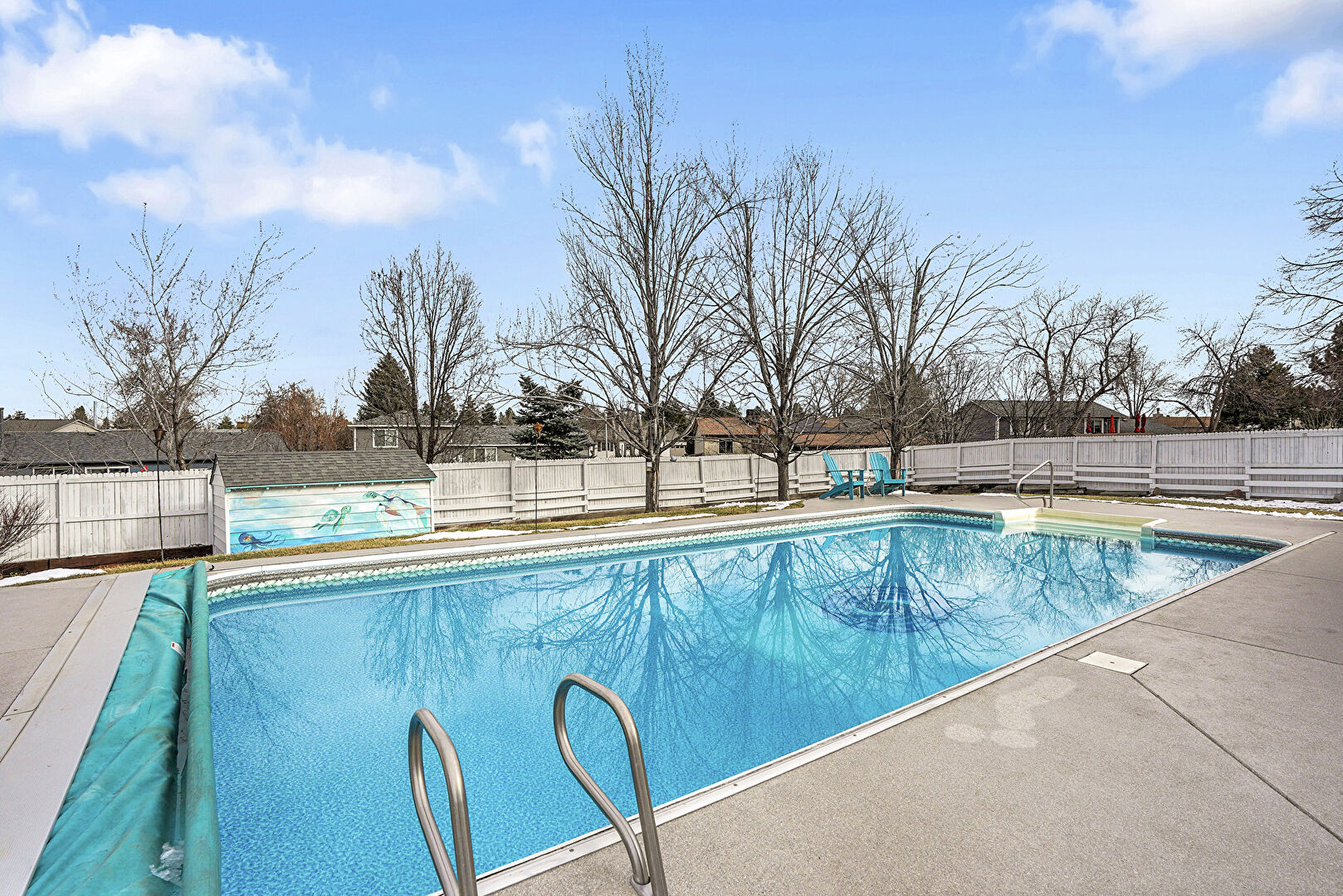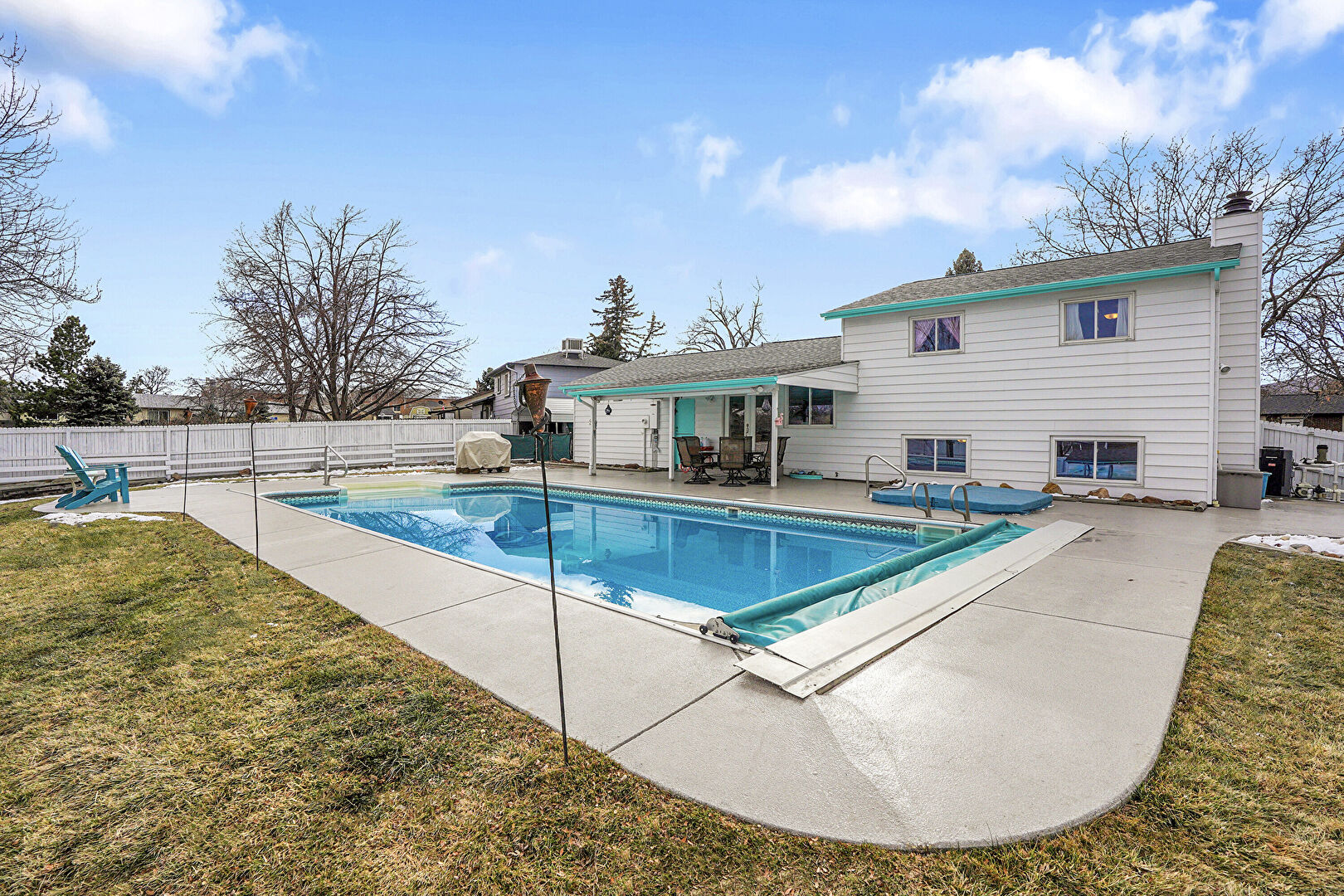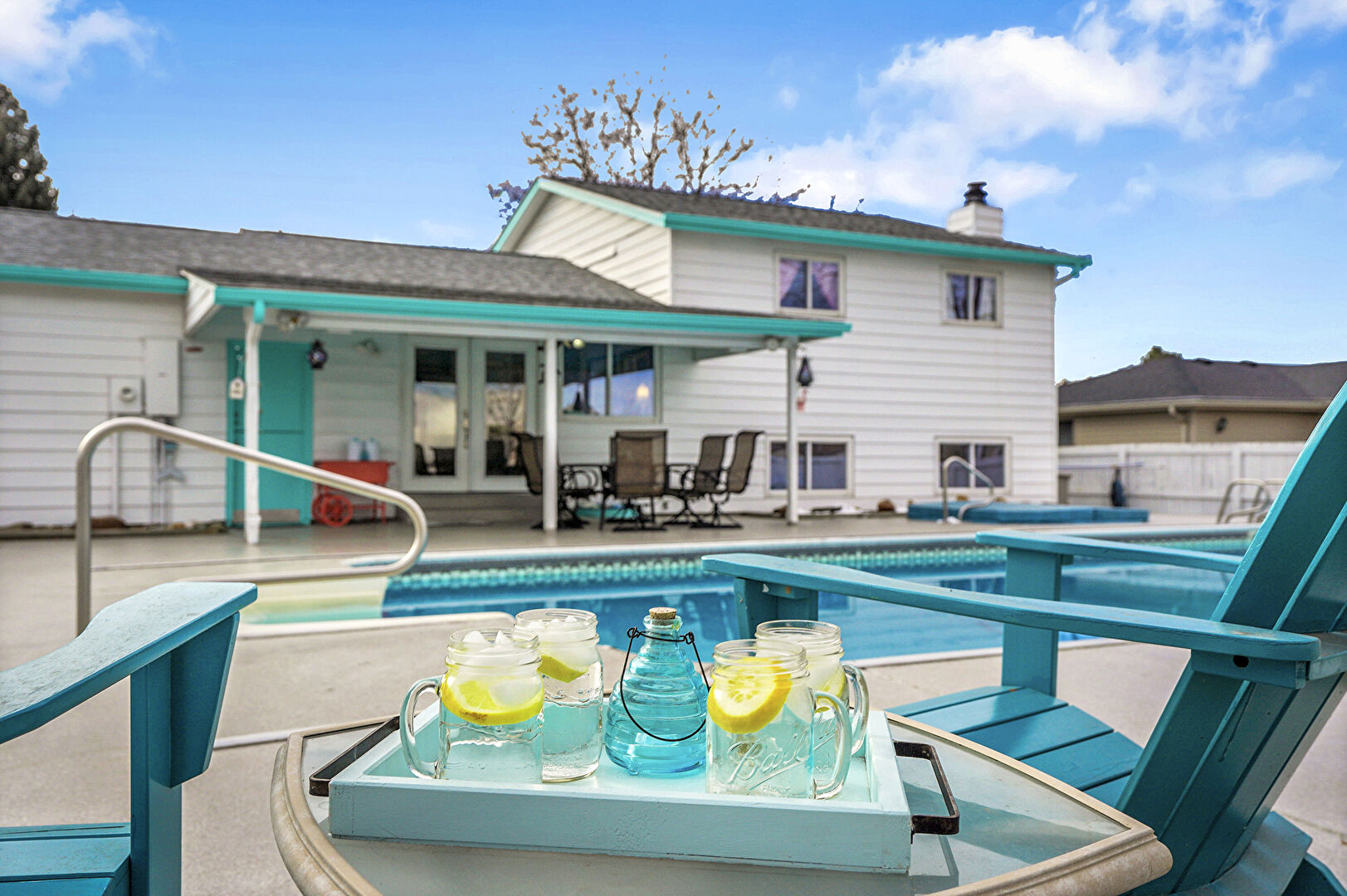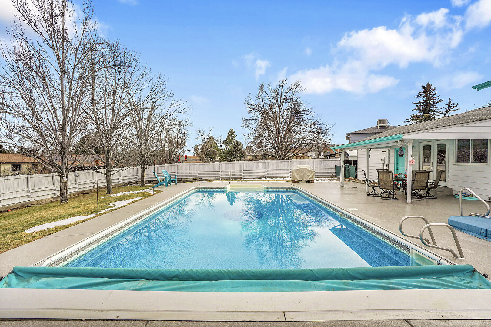Fence, Handrail, Outdoor Dining Area, Patio, Pool, Fence, Patio