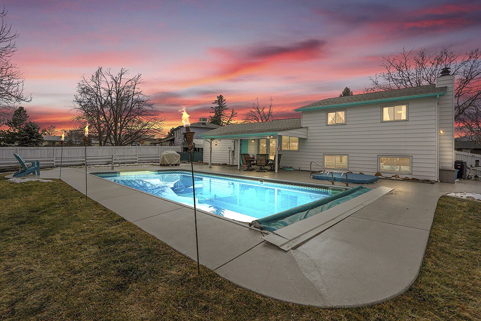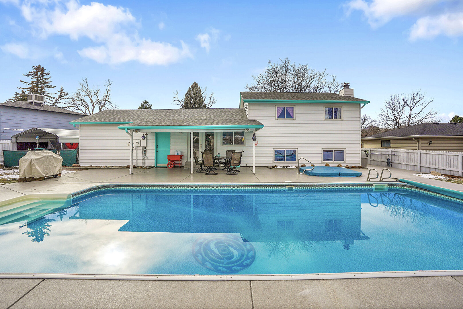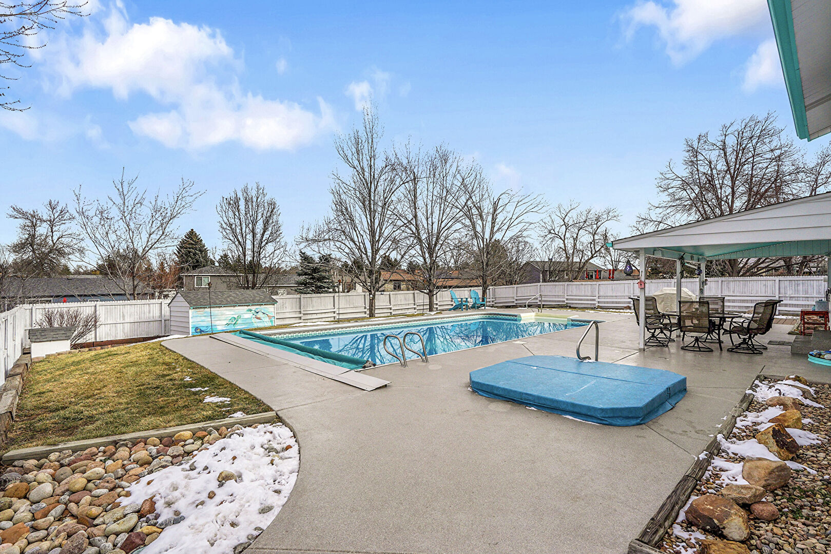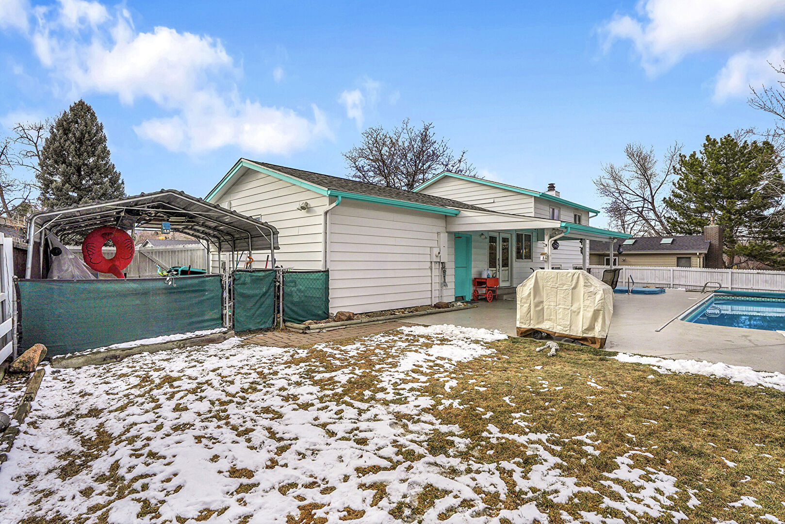 Chimney, Detached Carport, Downspout, Fence, French Doors, Gate, Grill, Gutters, Handrail, Horizontal Siding, Hot Tub, Lawn, Outdoor Dining Area, Outdoor Structure, Patio, Pool, Shingle Roof, Downspout, Fence, Handrail, Lawn, Outdoor Dining Area, Pool, Shed
