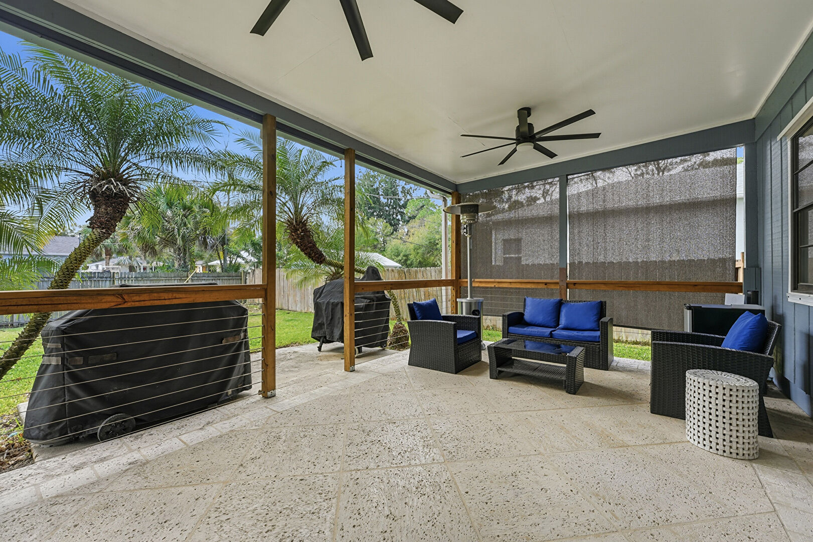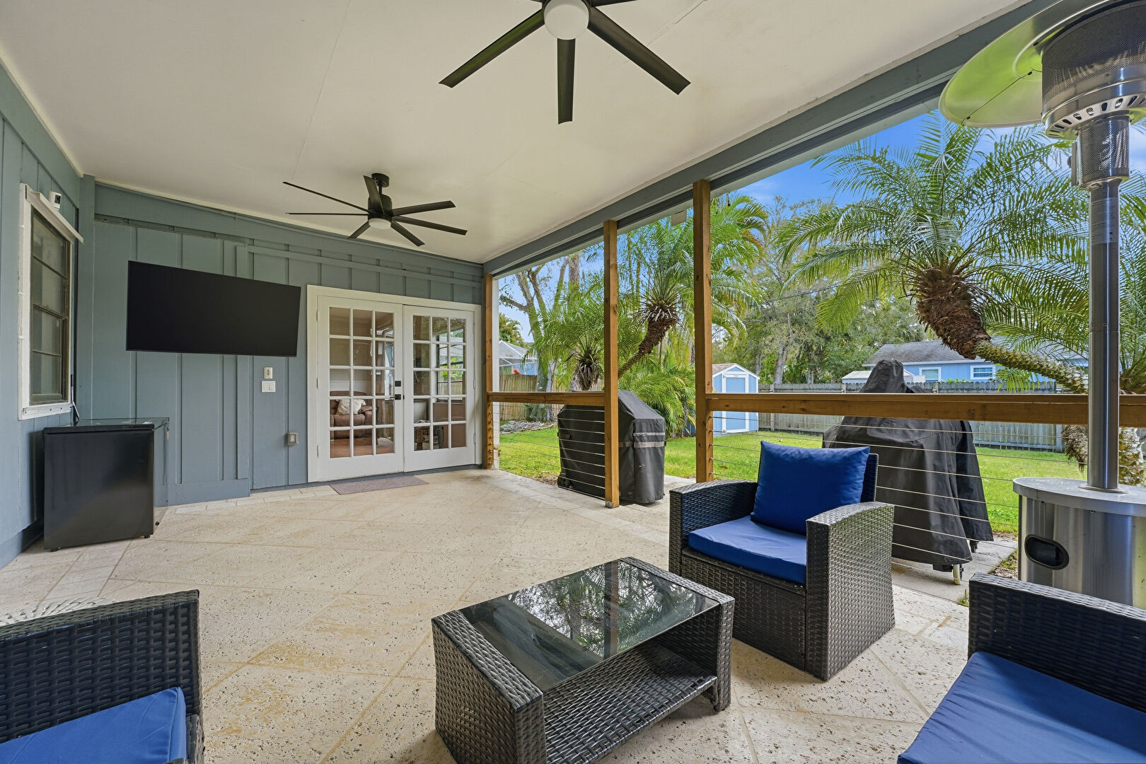 Ceiling Fan, Fence, French Doors, Grill, Natural Light, Outdoor Living Space, Patio, Sunroom, Ceiling Fan, Patio, Sunroom