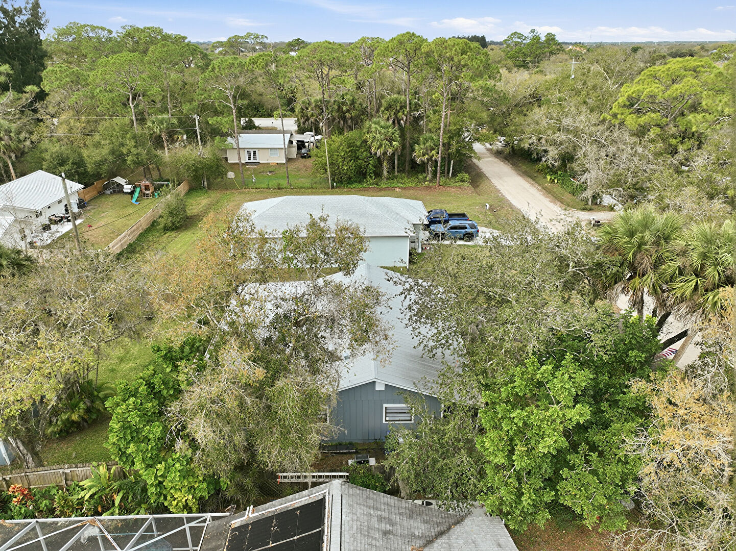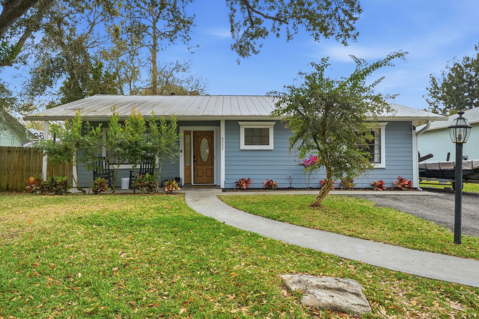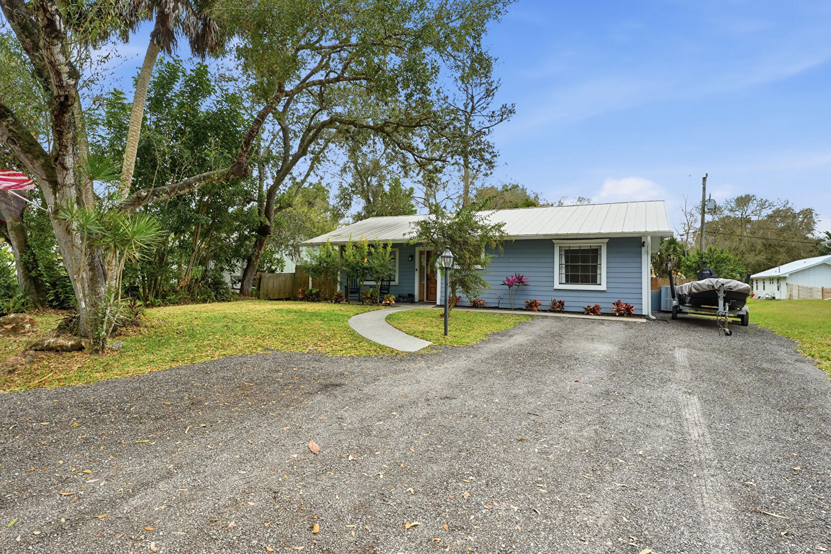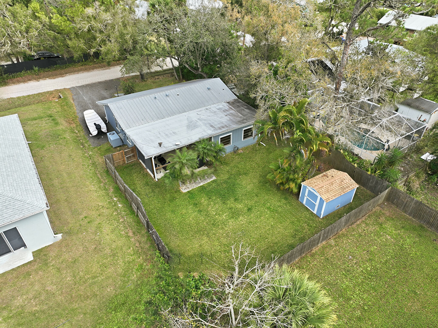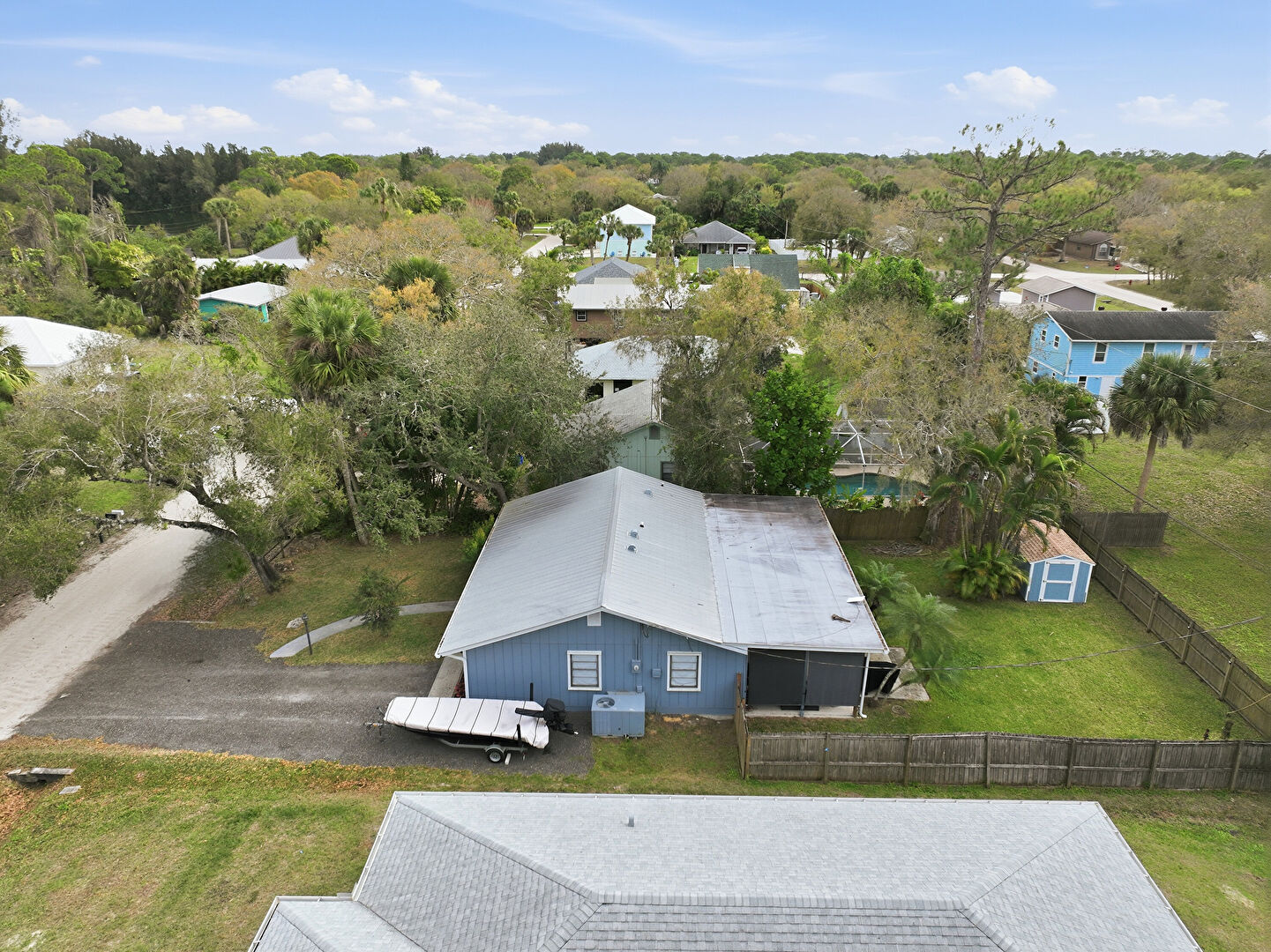 Corrugated Roof, Downspout, Driveway, Fence, Gutters, Horizontal Siding, Lawn, Metal Roof, Parking Pad, Corrugated Roof, Driveway, Gutters, Horizontal Siding, Metal Roof