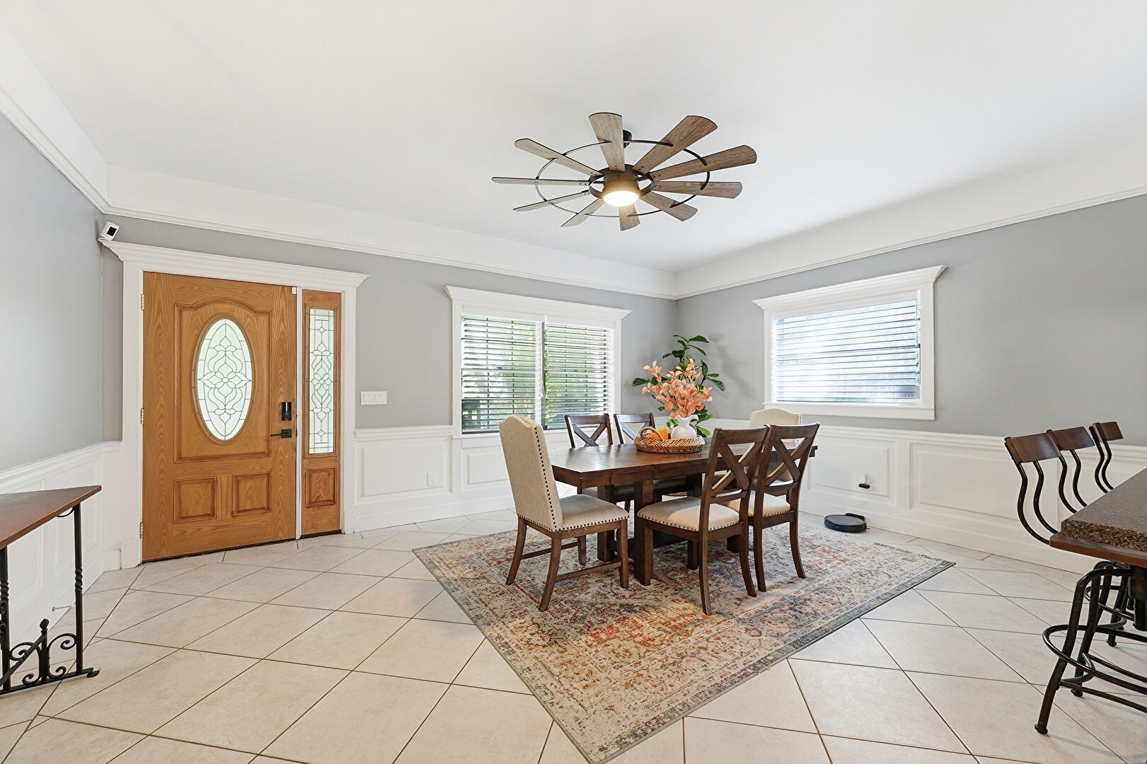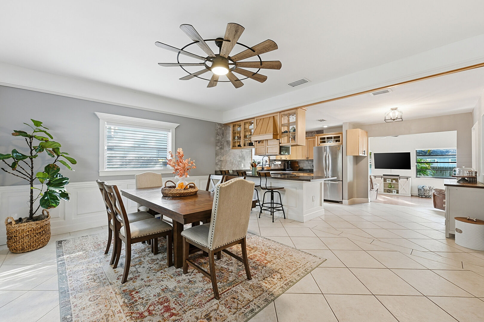 Drywall, Natural Light, Paneling Wall, Security Camera, Tile Floor, U Shaped Kitchen, Vent, Wainscot Wall, Ceiling Fan