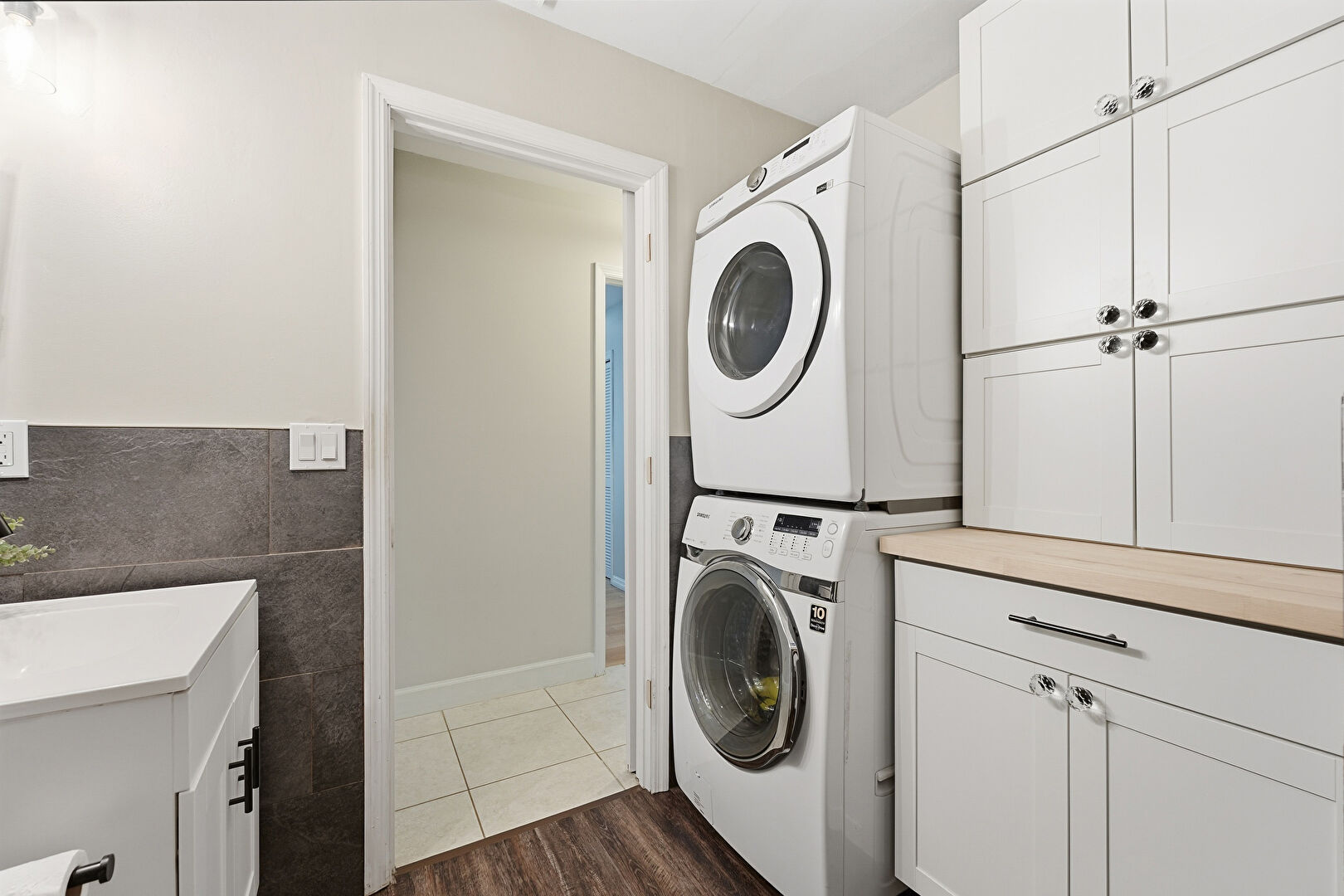Baseboards Wall, Drywall, Natural Light, Tile Floor, Vanity, Vent, Full Bathroom