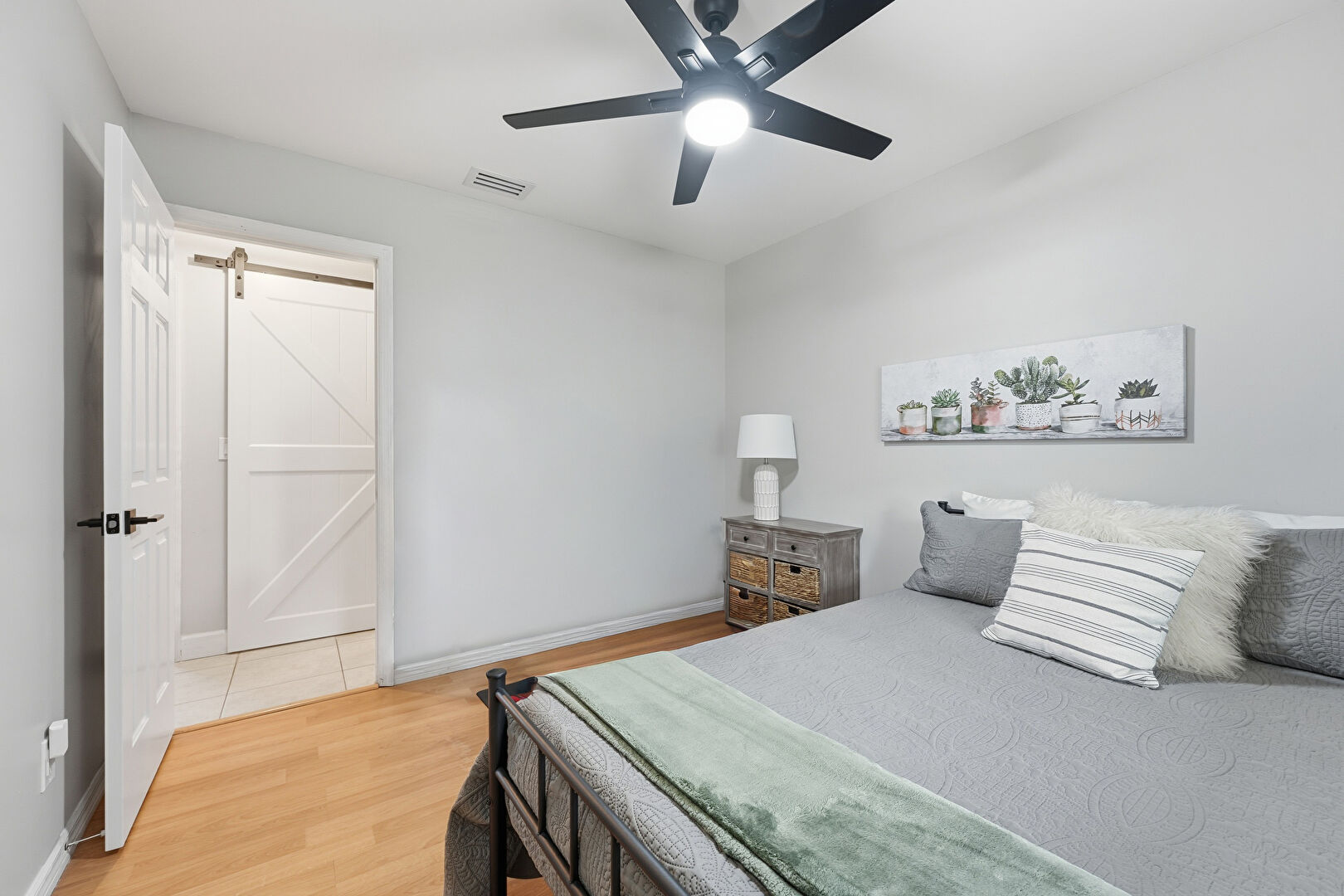 Barn Door, Baseboards Wall, Ceiling Fan, Drywall, Natural Light, Vent, Wood Finish Floor, Closet, Natural Light, Wood Finish Floor