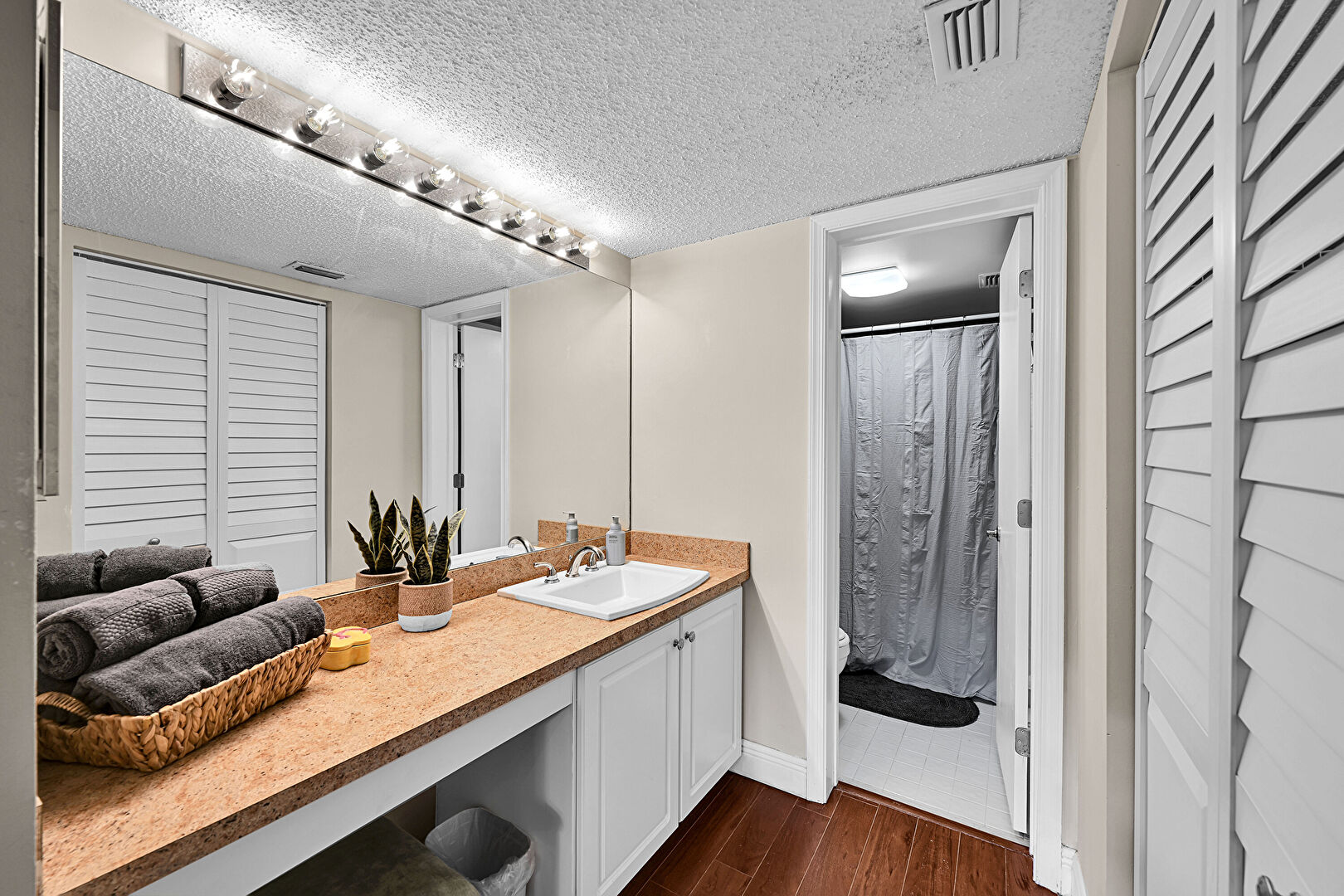 Baseboards Wall, Closet, Drywall, Ensuite Bathroom, Full Bathroom, Natural Light, Notable Chandelier, Textured Ceiling, Tile Floor, Vanity, Vent, Wood Finish Floor, Combined Bath Shower, Full Bathroom, Textured Ceiling, Wood Finish Floor