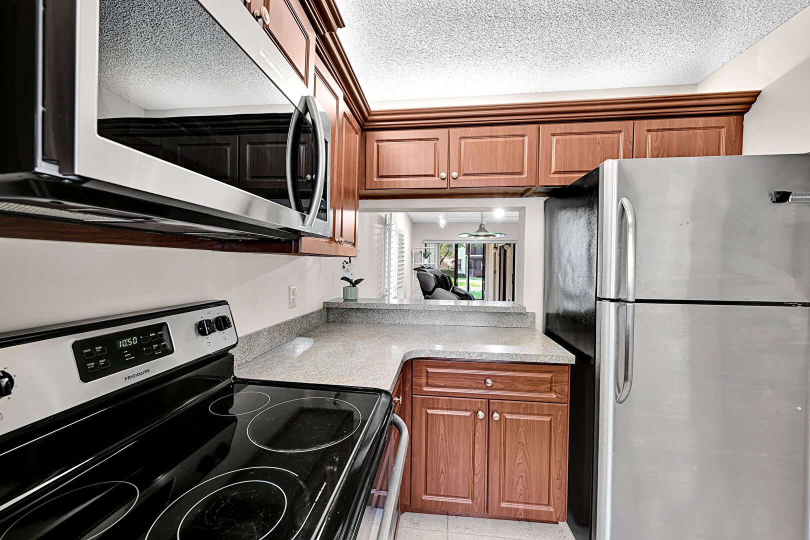 Crown Molding Cabinets, Drywall, Medium Brown Cabinets, Natural Light, Pass Through Window, Raised Cabinets, Stone Countertops, Textured Ceiling, Tile Floor, Crown Molding Cabinets, Textured Ceiling