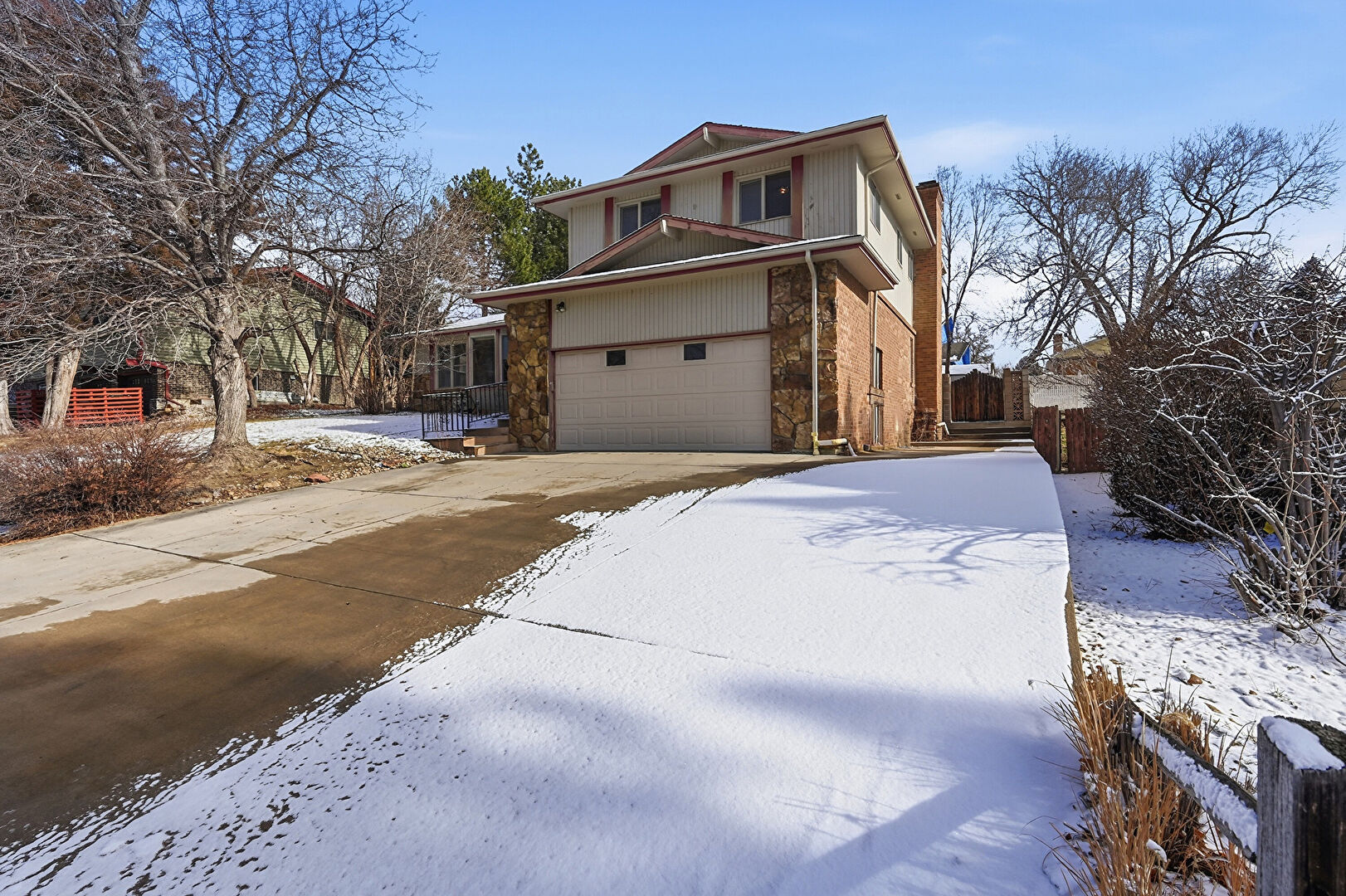 Chimney, Downspout, Fence, Garage, Gutters, Stone Siding, Vertical Siding, Driveway