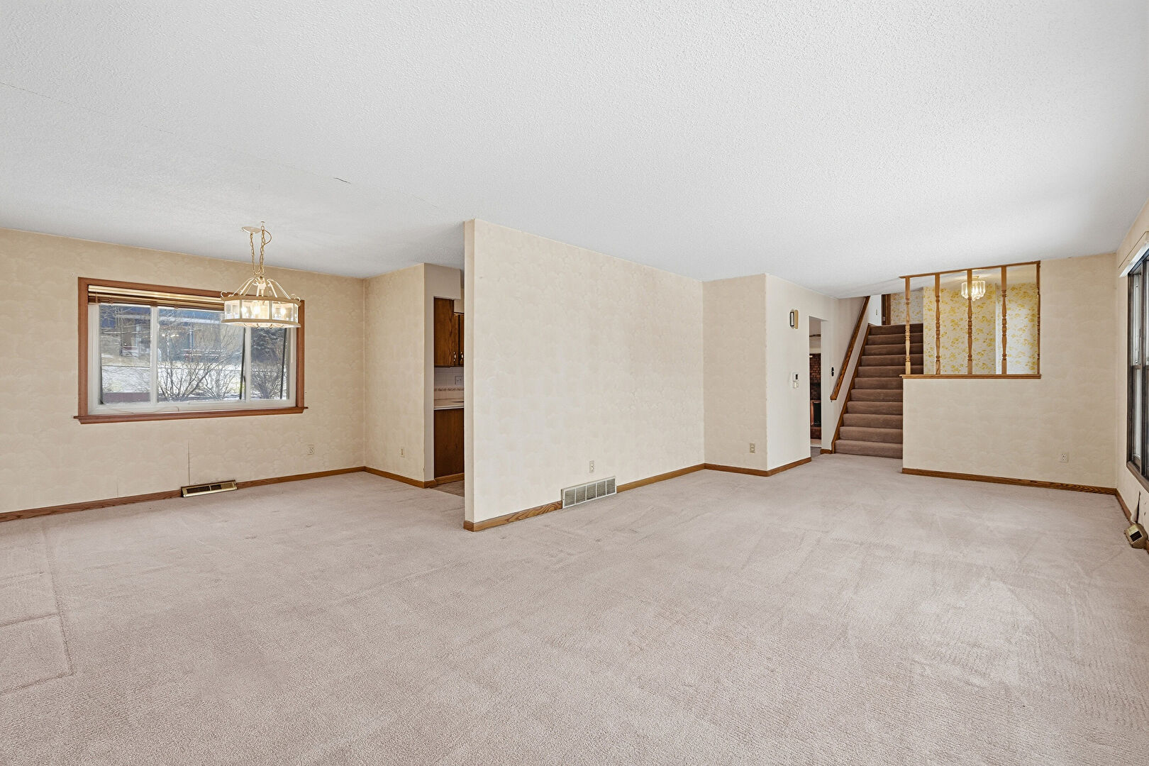 Baseboards Wall, Carpet, Drywall, Natural Light, Notable Chandelier, Textured Ceiling, Vent, Wallpaper Wall, Stairs