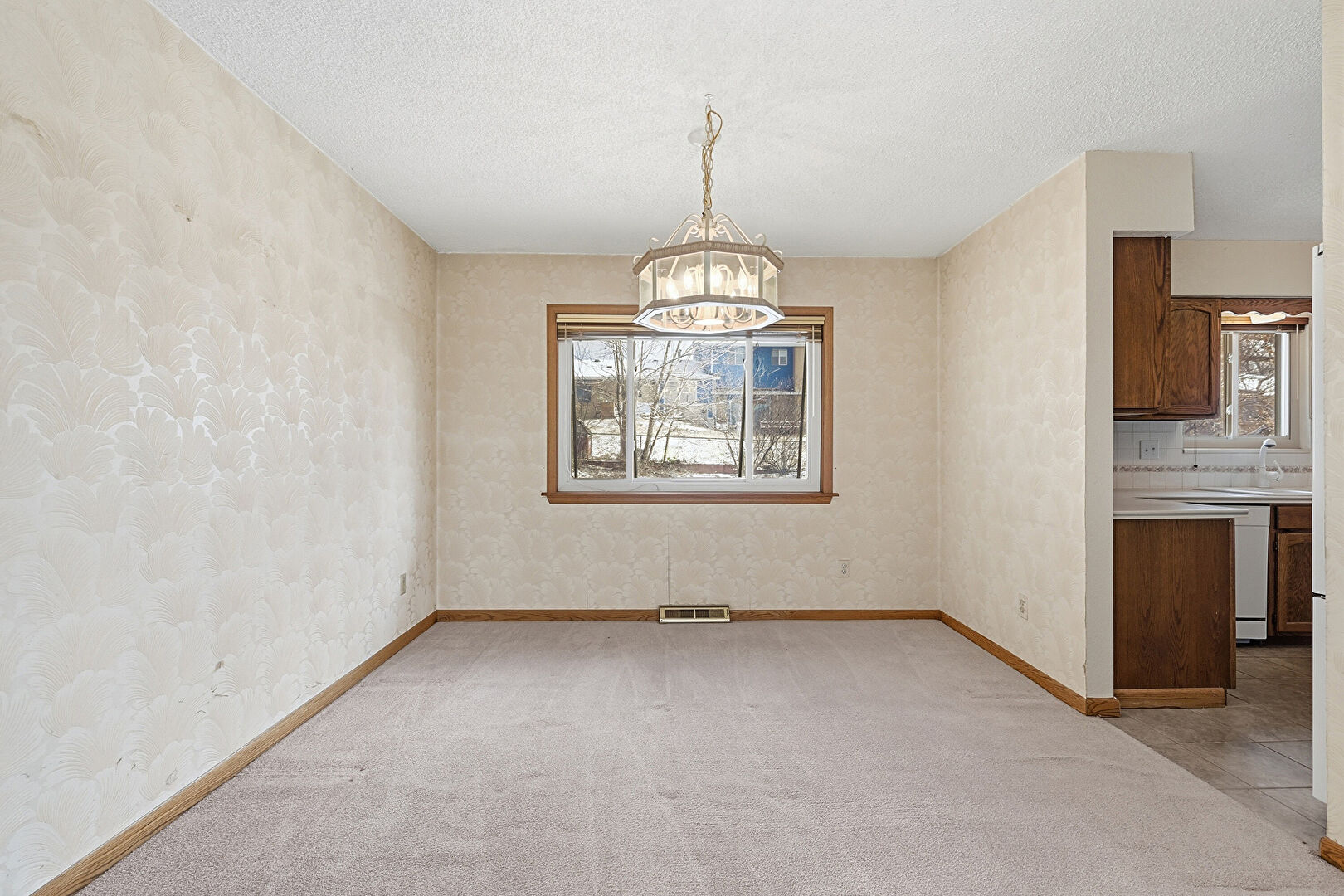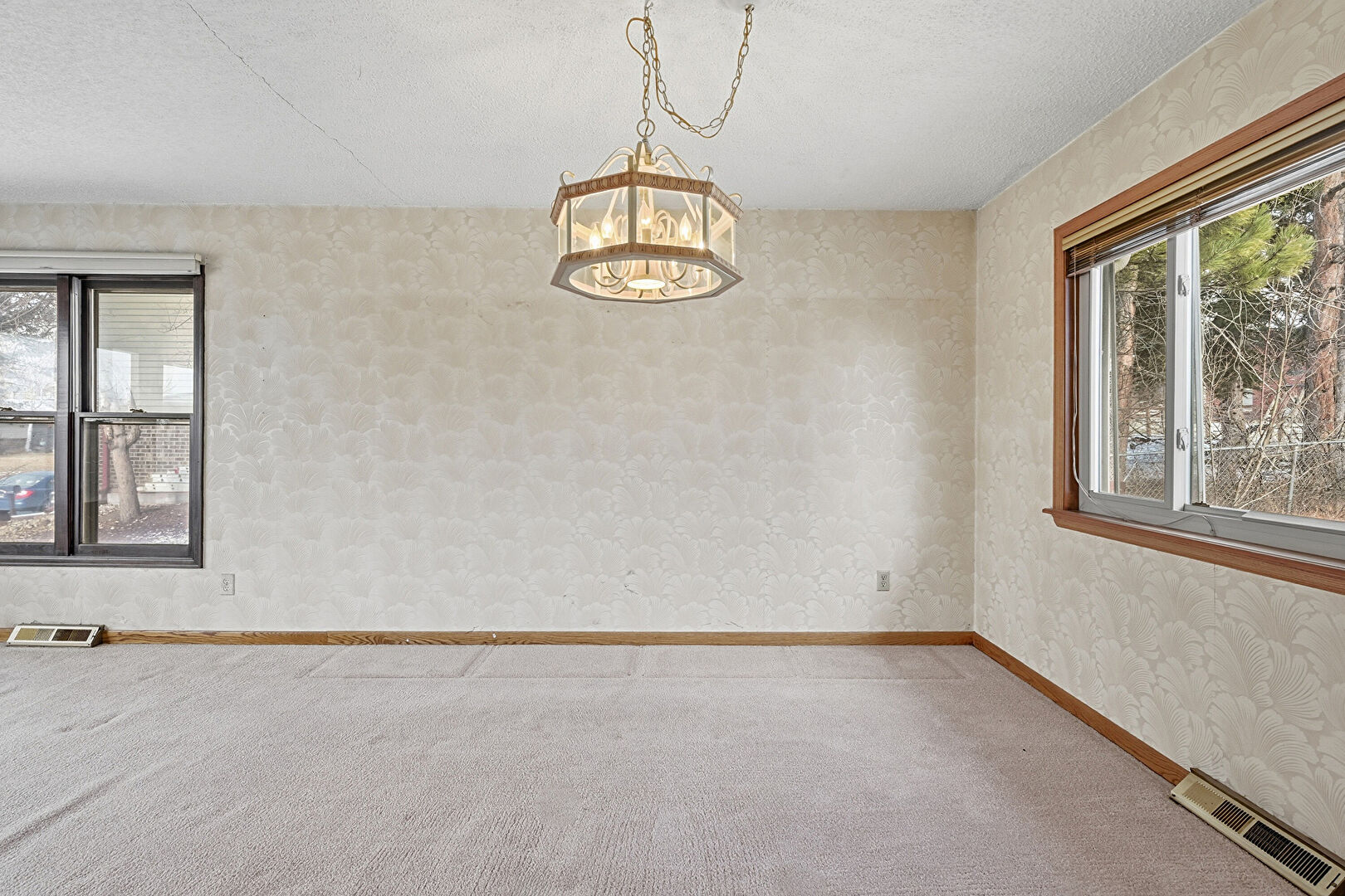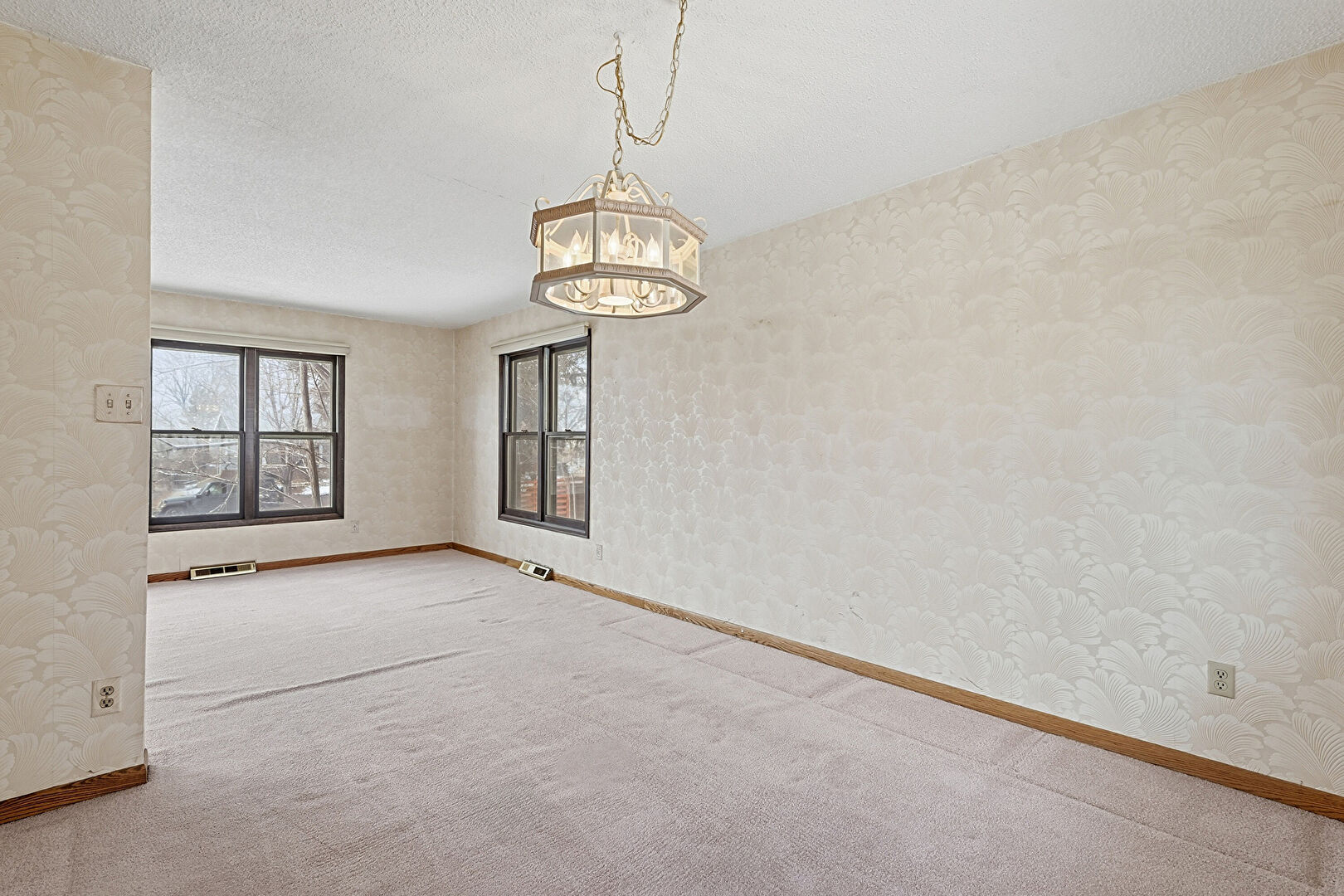 Baseboards Wall, Carpet, Natural Light, Notable Chandelier, Textured Ceiling, Textured Wall, Vent, Wallpaper Wall, Carpet, Natural Light, Notable Chandelier, Wallpaper Wall
