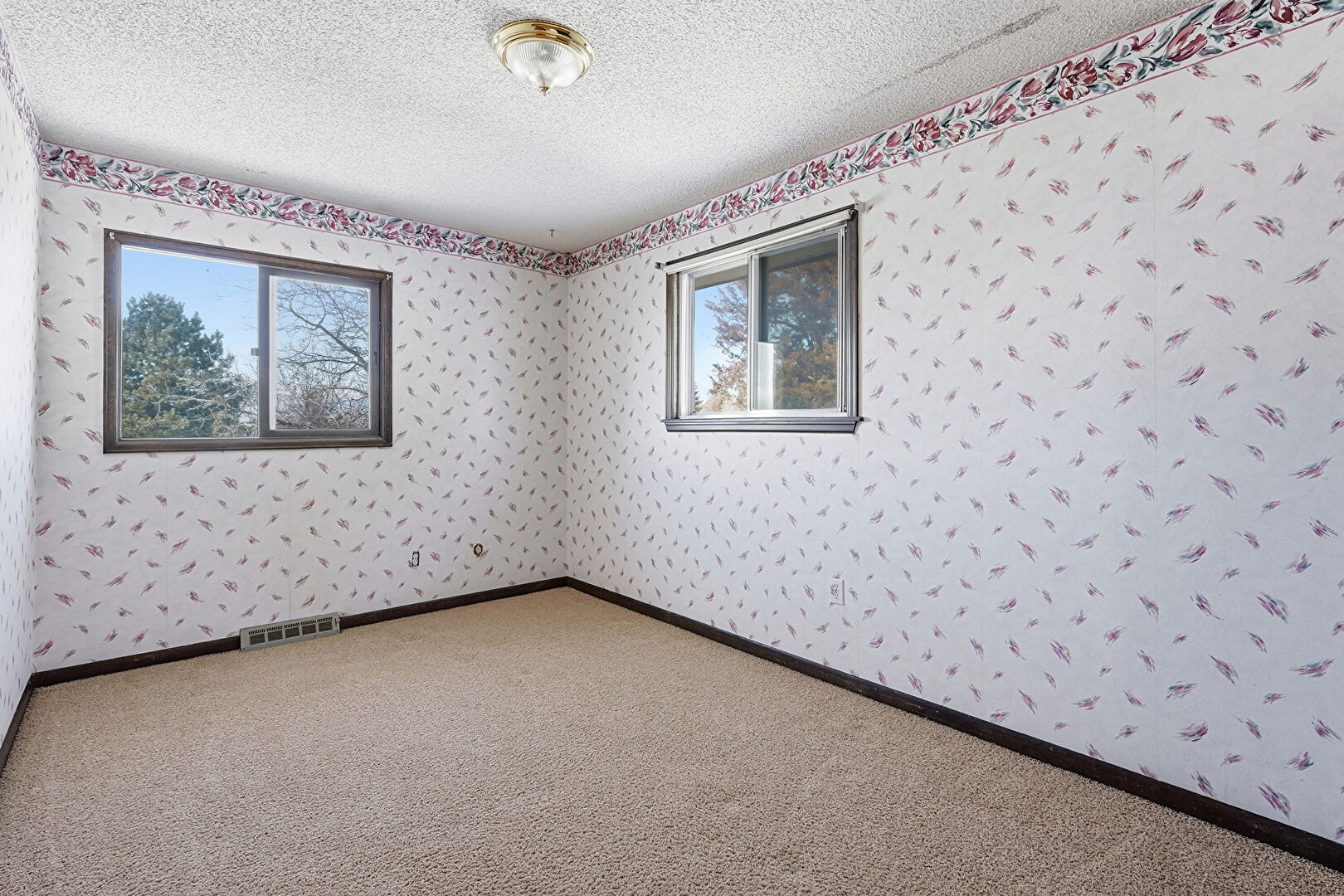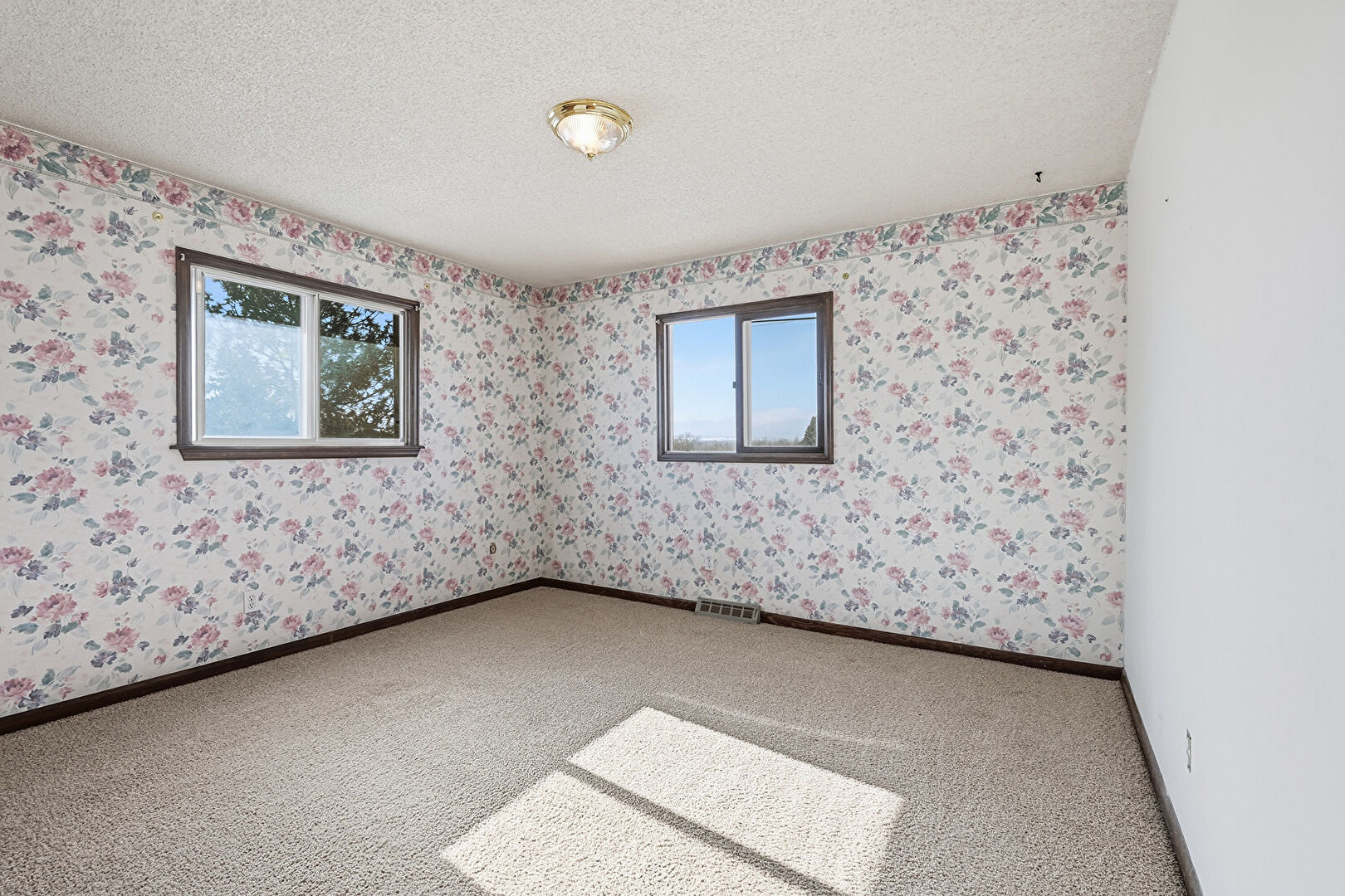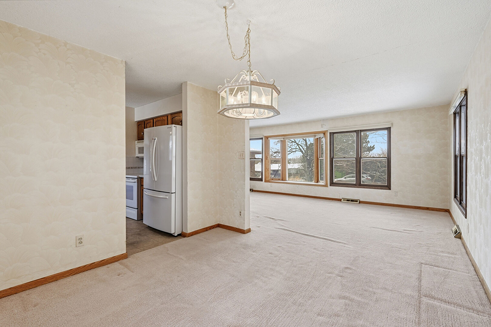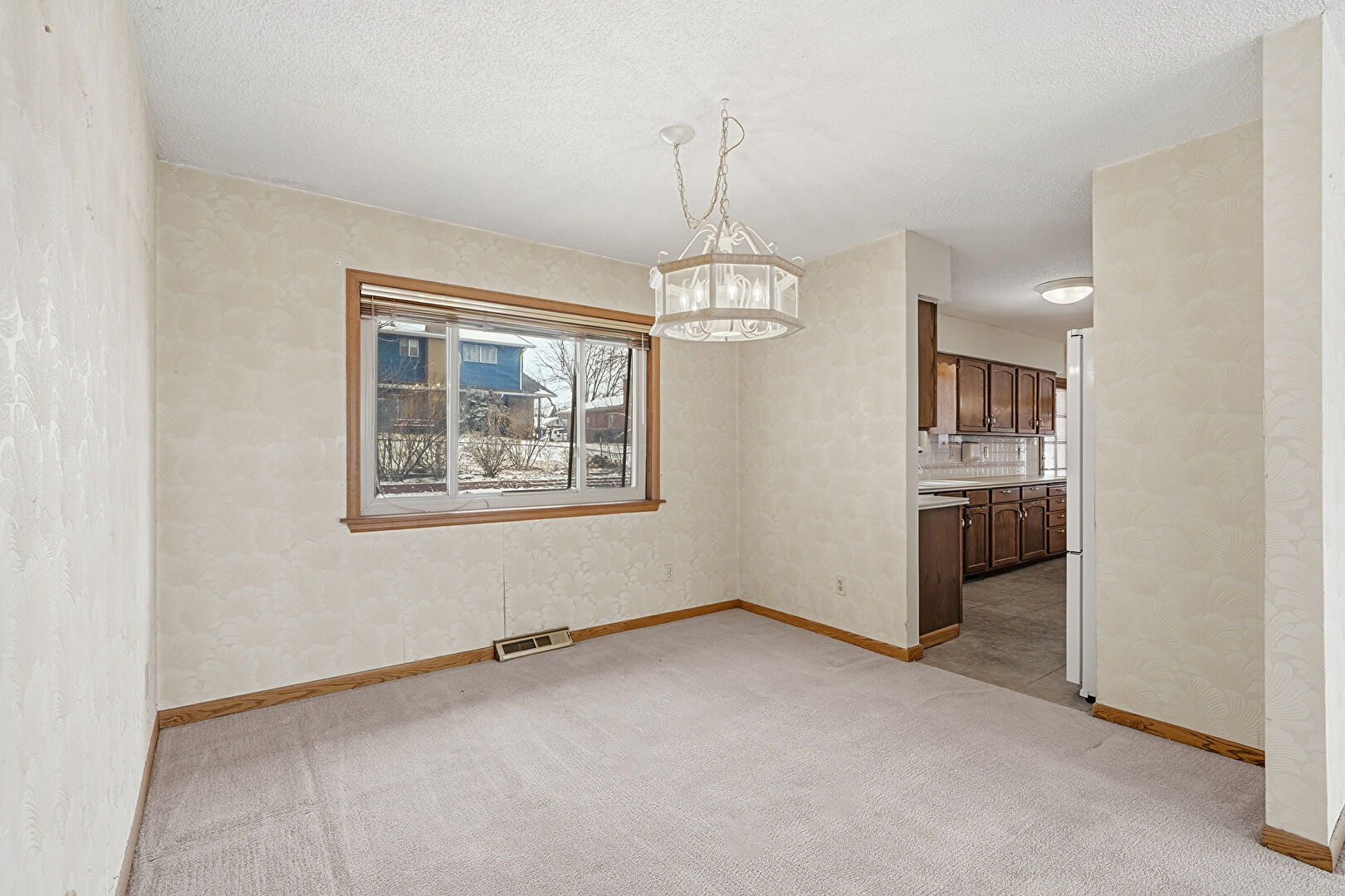 Baseboards Wall, Carpet, Natural Light, Notable Chandelier, Textured Ceiling, Textured Wall, Vent, Wallpaper Wall, Carpet, Natural Light, Notable Chandelier, Wallpaper Wall