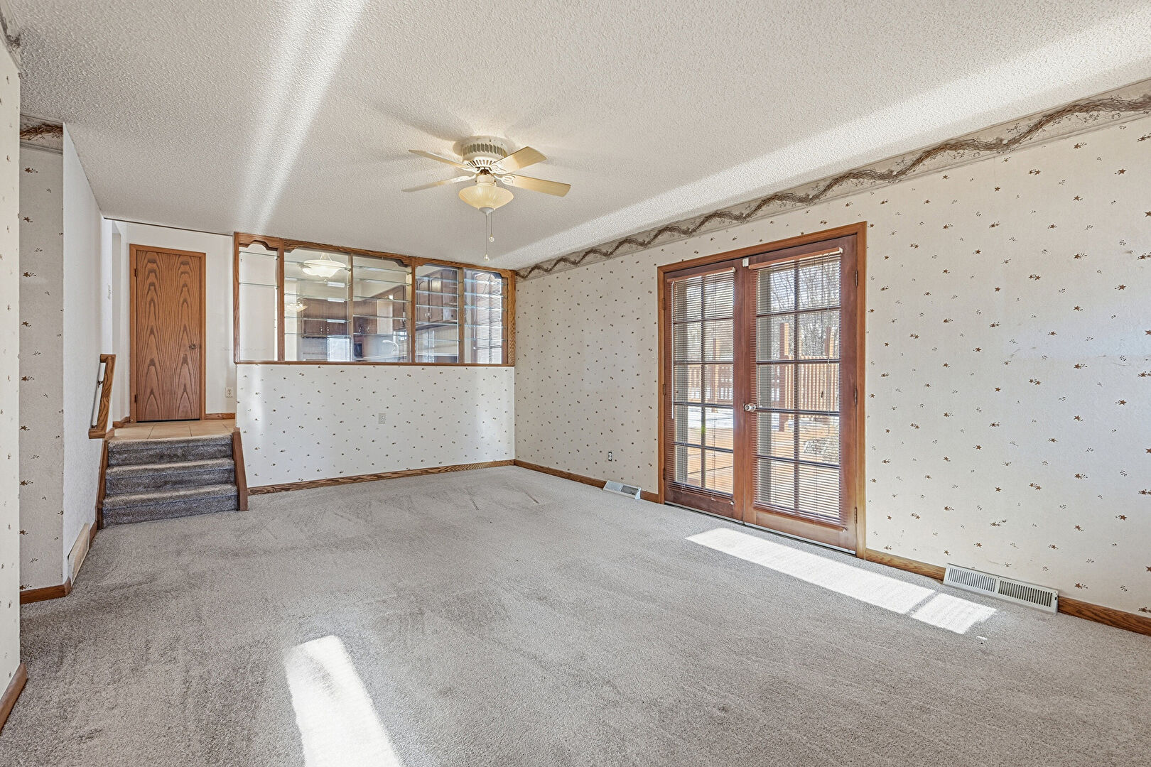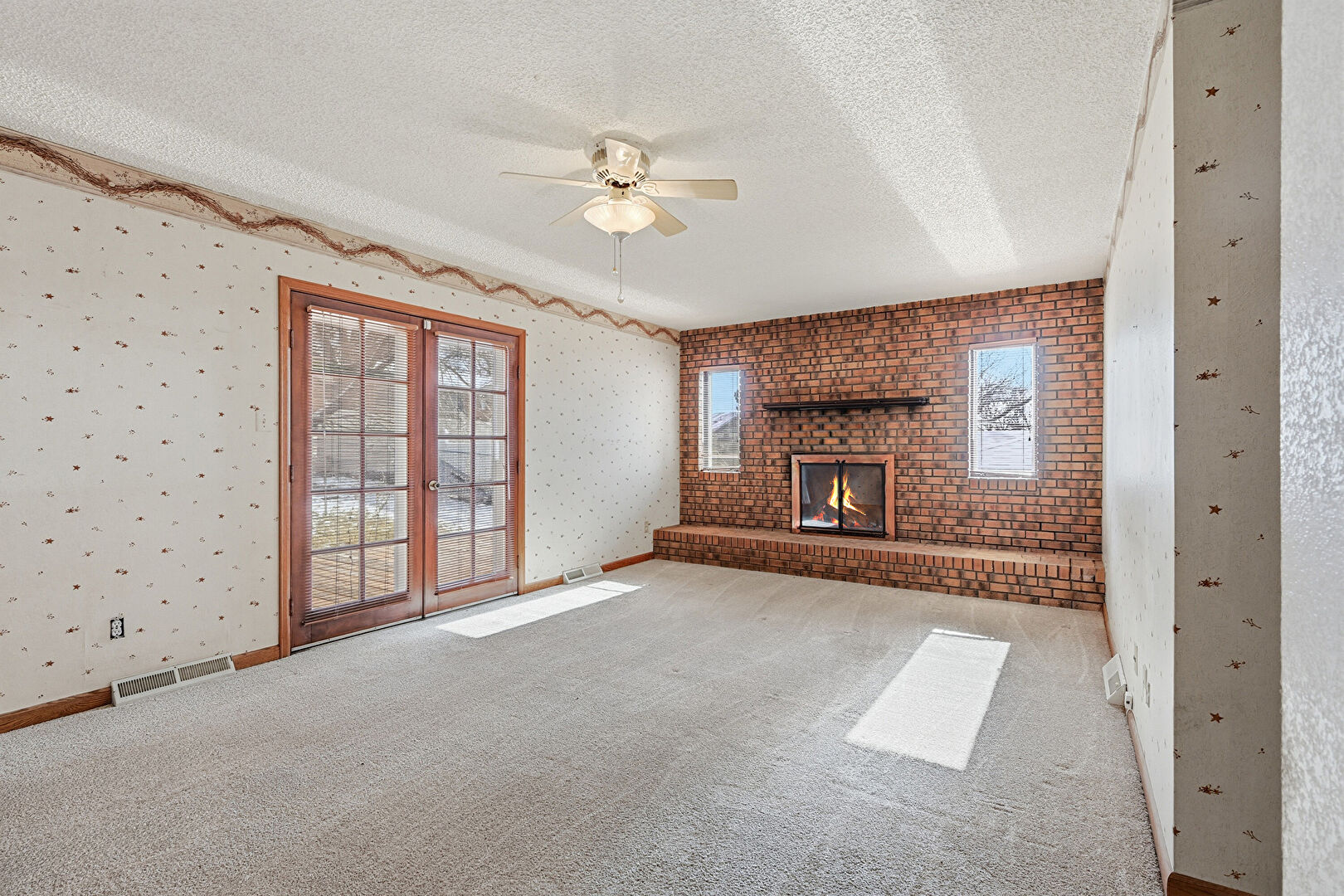 Baseboards Wall, Brick Wall, Carpet, Ceiling Fan, Fireplace, French Doors, Natural Light, Stairs, Textured Ceiling, Vent, Wallpaper Wall, Accent Wall, Ceiling Fan, Fireplace, French Doors