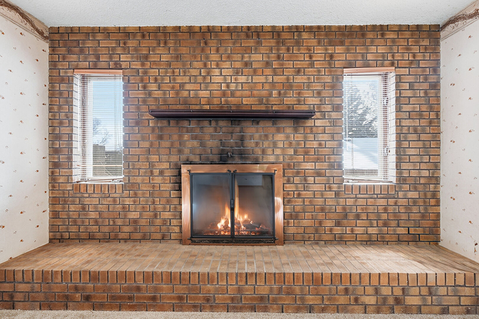 Carpet, Textured Ceiling, Wallpaper Wall, Fireplace