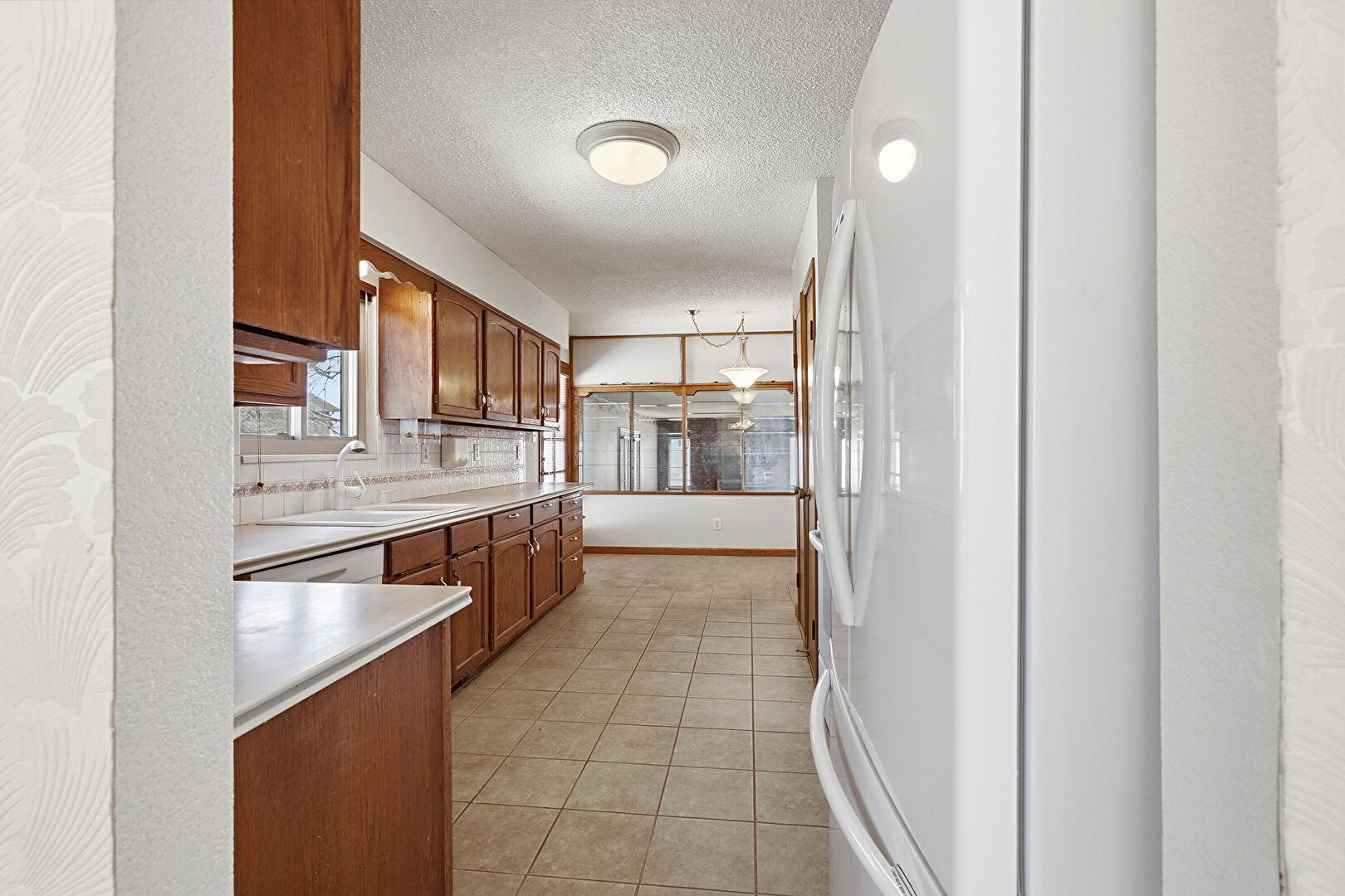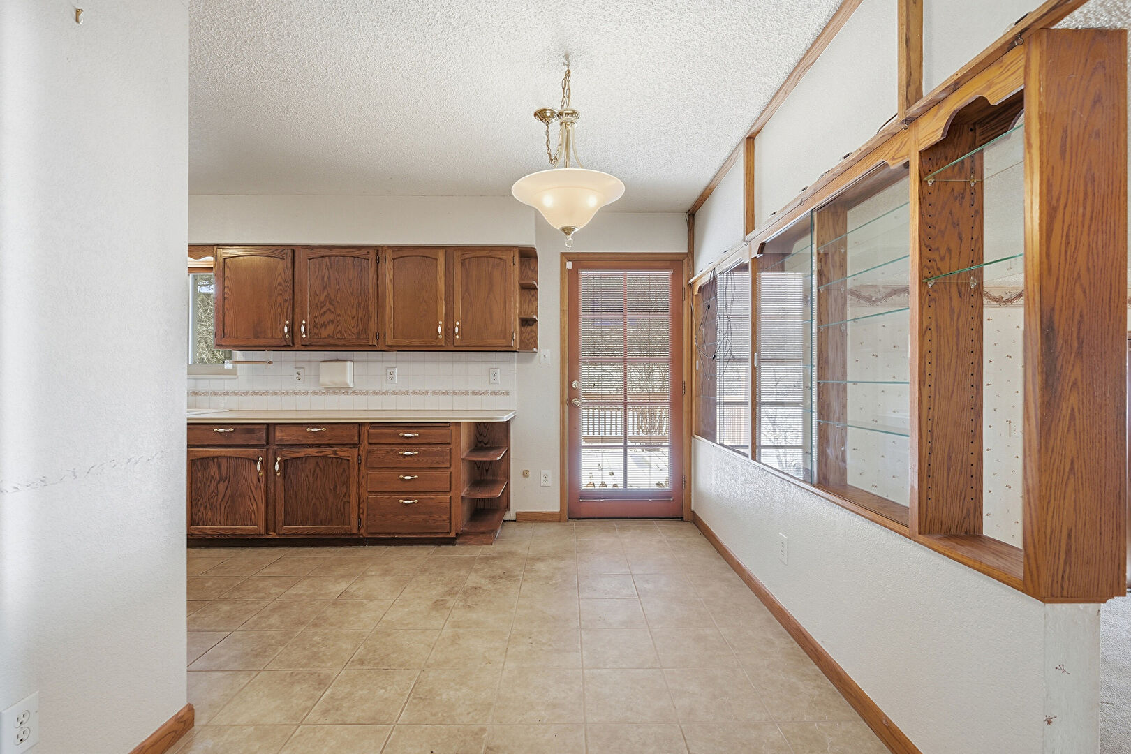 Arched Cabinets, Baseboards Wall, Drywall, Medium Brown Cabinets, Natural Light, Open Shelves, Pendant Lighting, Shaker Cabinets, Textured Ceiling, Tile Floor, Visible Hinge Cabinets, Medium Brown Cabinets, Open Shelves, Pendant Lighting, Textured Ceiling, Tile Floor