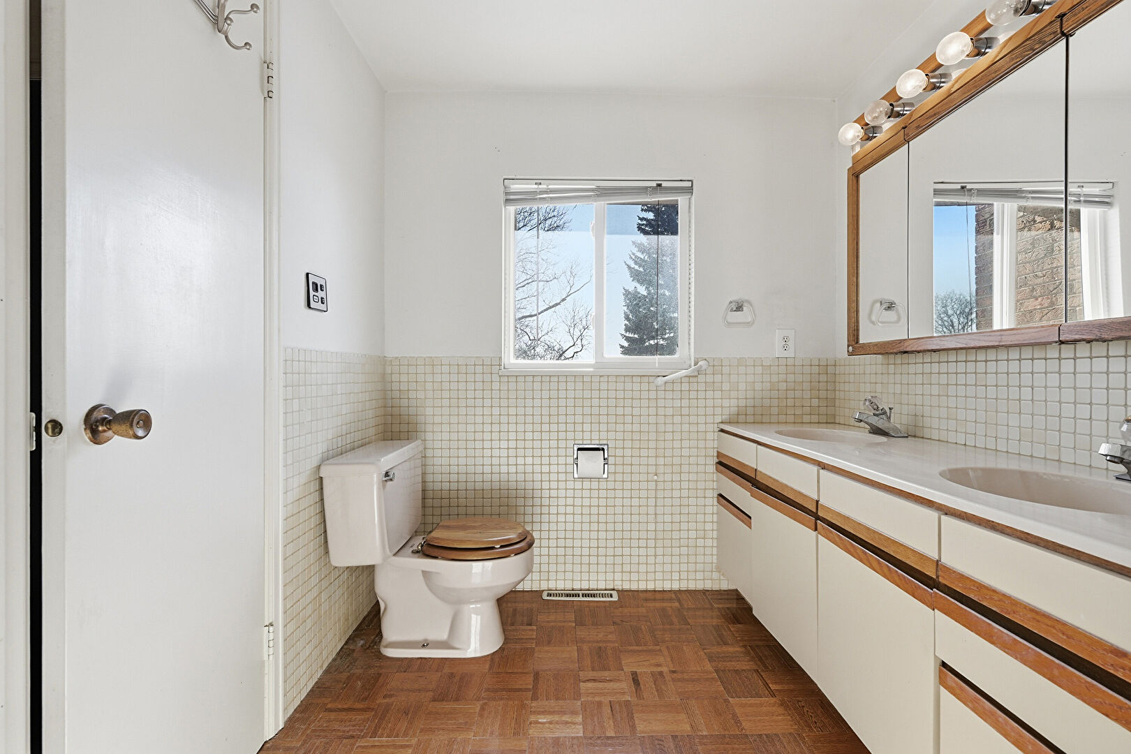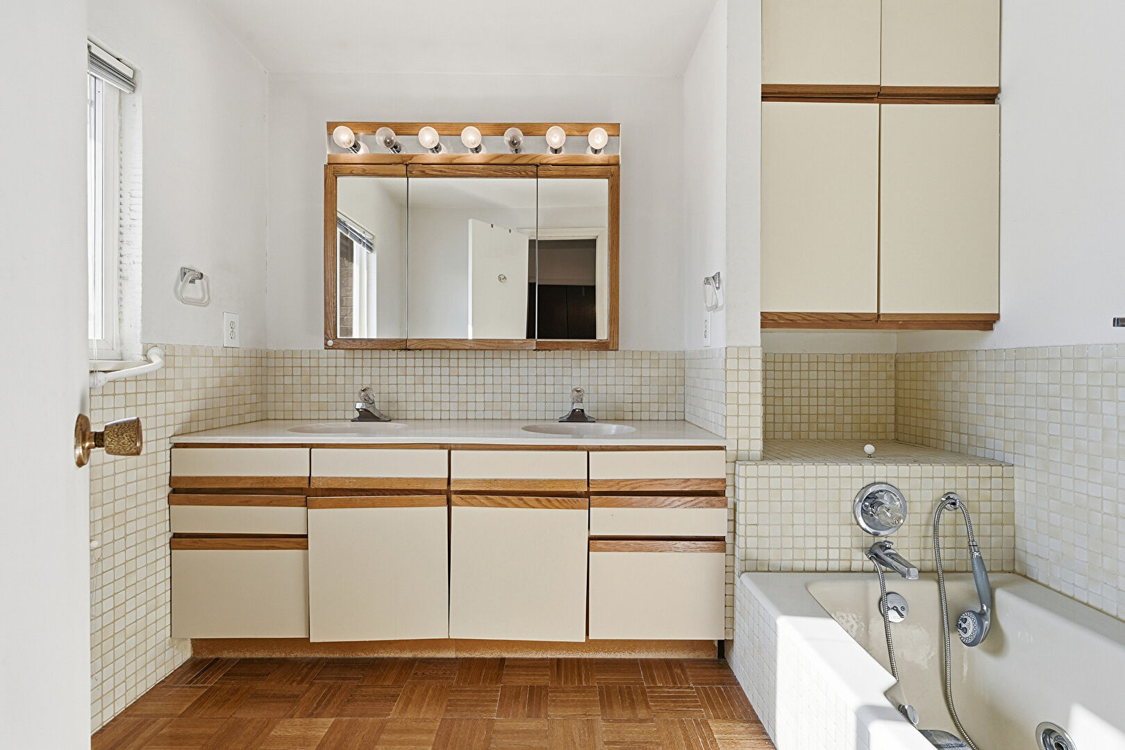 Double Vanity, Drywall, Full Bathroom, Natural Light, Tile Wall, Vent, Vinyl Floor, Wainscot Wall, Drywall, Natural Light