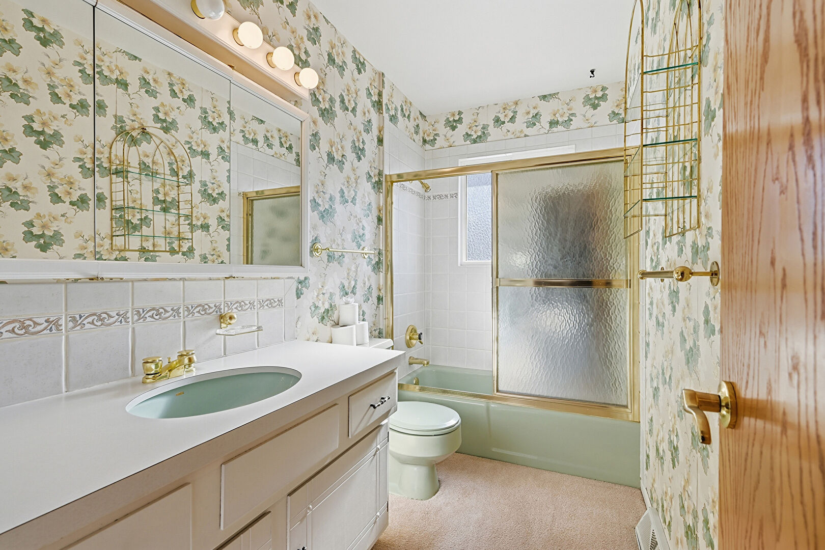 Baseboards Wall, Carpet, Closet, Combined Bath Shower, Full Bathroom, Natural Light, Textured Ceiling, Tile Wall, Vanity, Wallpaper Wall, Baseboards Wall, Carpet, Vent