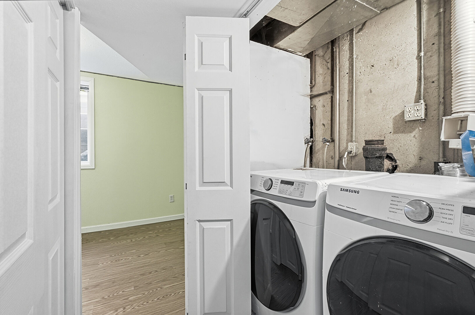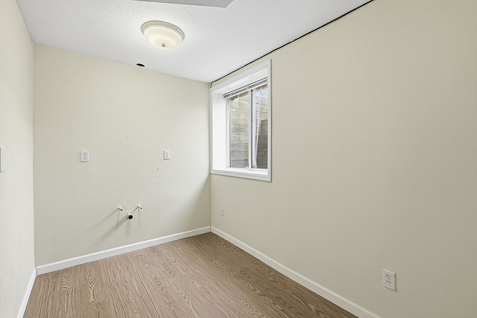 Basement, Concrete Wall, Drywall, Laundry, Natural Light, Washer Hookup, Wood Finish Floor, Baseboards Wall
