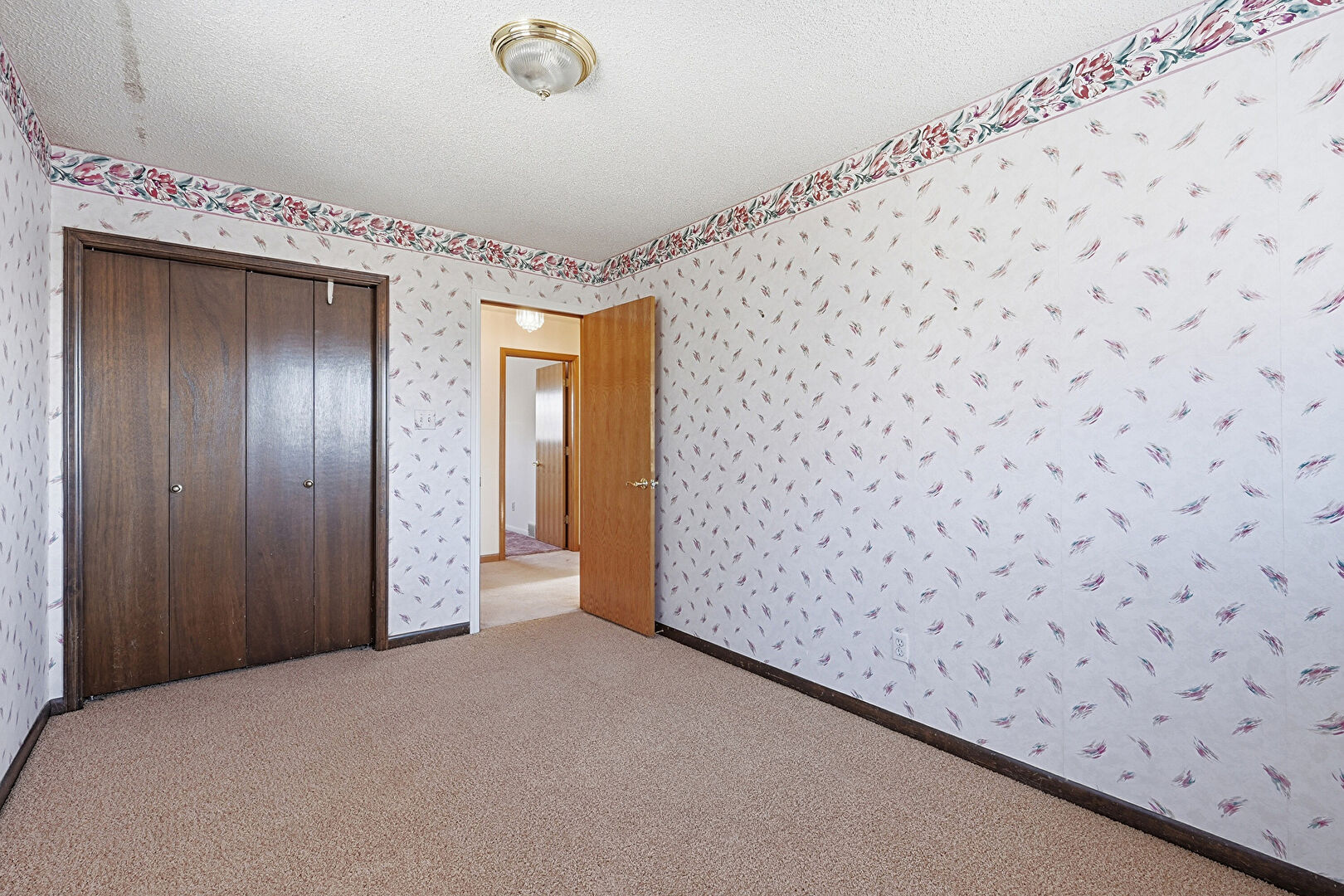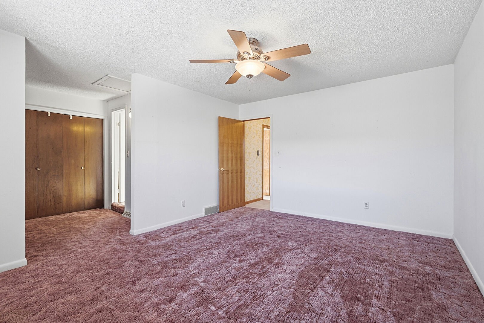Accent Wall, Baseboards Wall, Carpet, Closet, Natural Light, Textured Ceiling, Vent, Wallpaper Wall, Baseboards Wall, Drywall